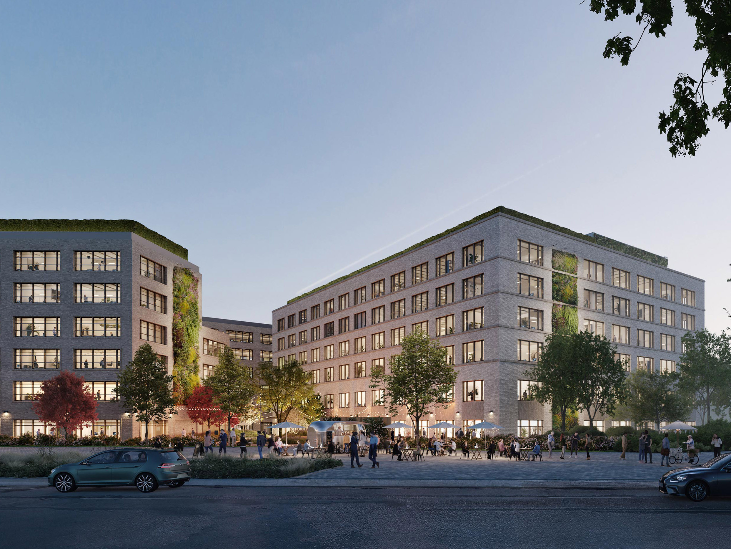 Der Neubau gliedert sich in zwei jeweils sechs-geschossige Bauteile, die mit ihrem gemeinsamen Außenbereich ein Areal mit Campus-Charakter bilden. Das direkt am Salomon-Heine-Weg befindliche Haus 1, beruht auf einer Kammstruktur, die sich zum Wasser hin öffnet. Das östlich liegende Haus 2 umschließt einen ruhigen Innenhof. Intensiv begrünte Außenbereiche und halboffene Höfe verbinden das Ensemble und laden zum Austausch, verweilen und arbeiten ein. Durch die intensive Bepflanzung der Dächer und Höfe fördert das Projekt Artenvielfalt und sorgt für ein optimales Gebäudeklima.