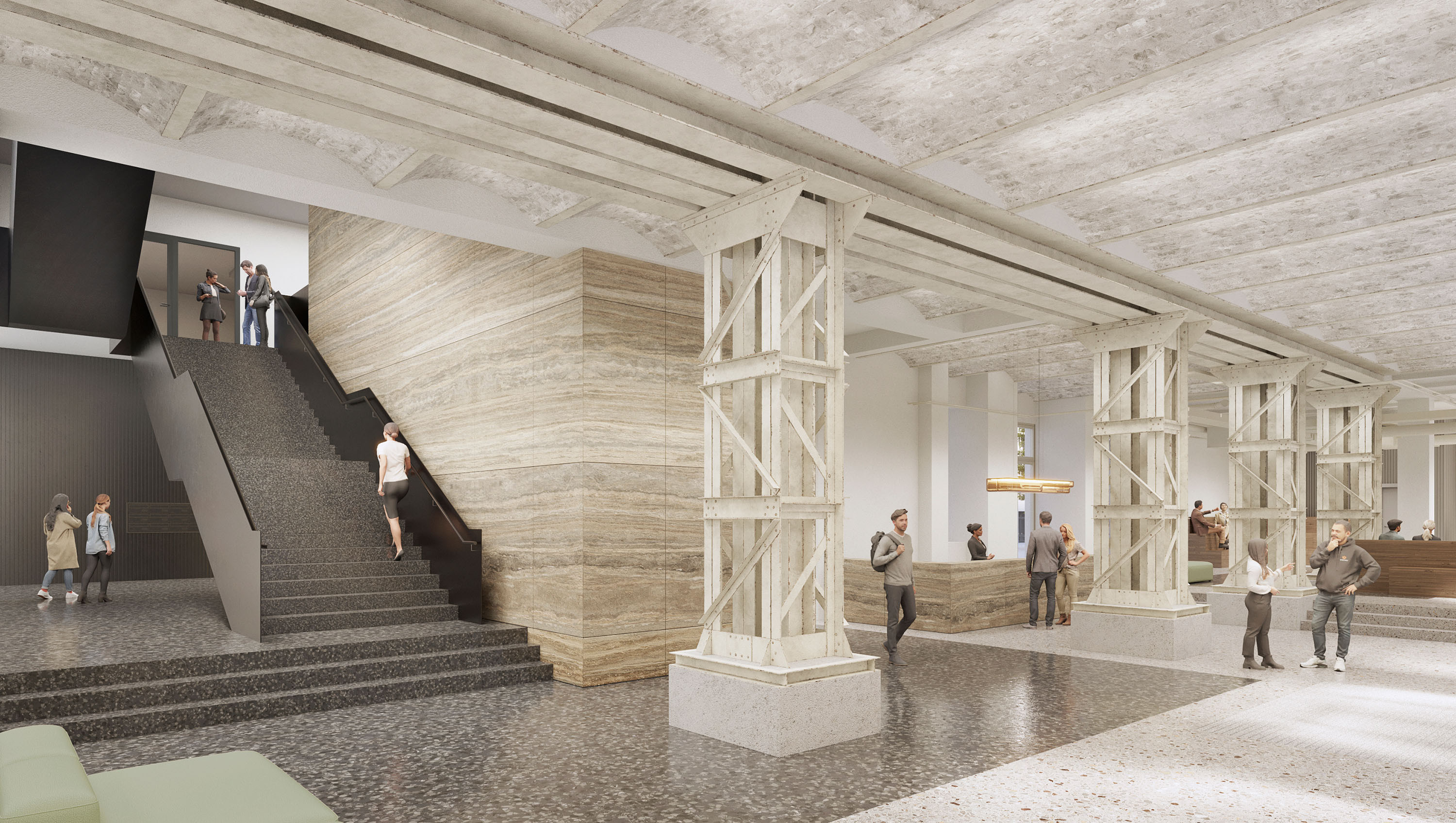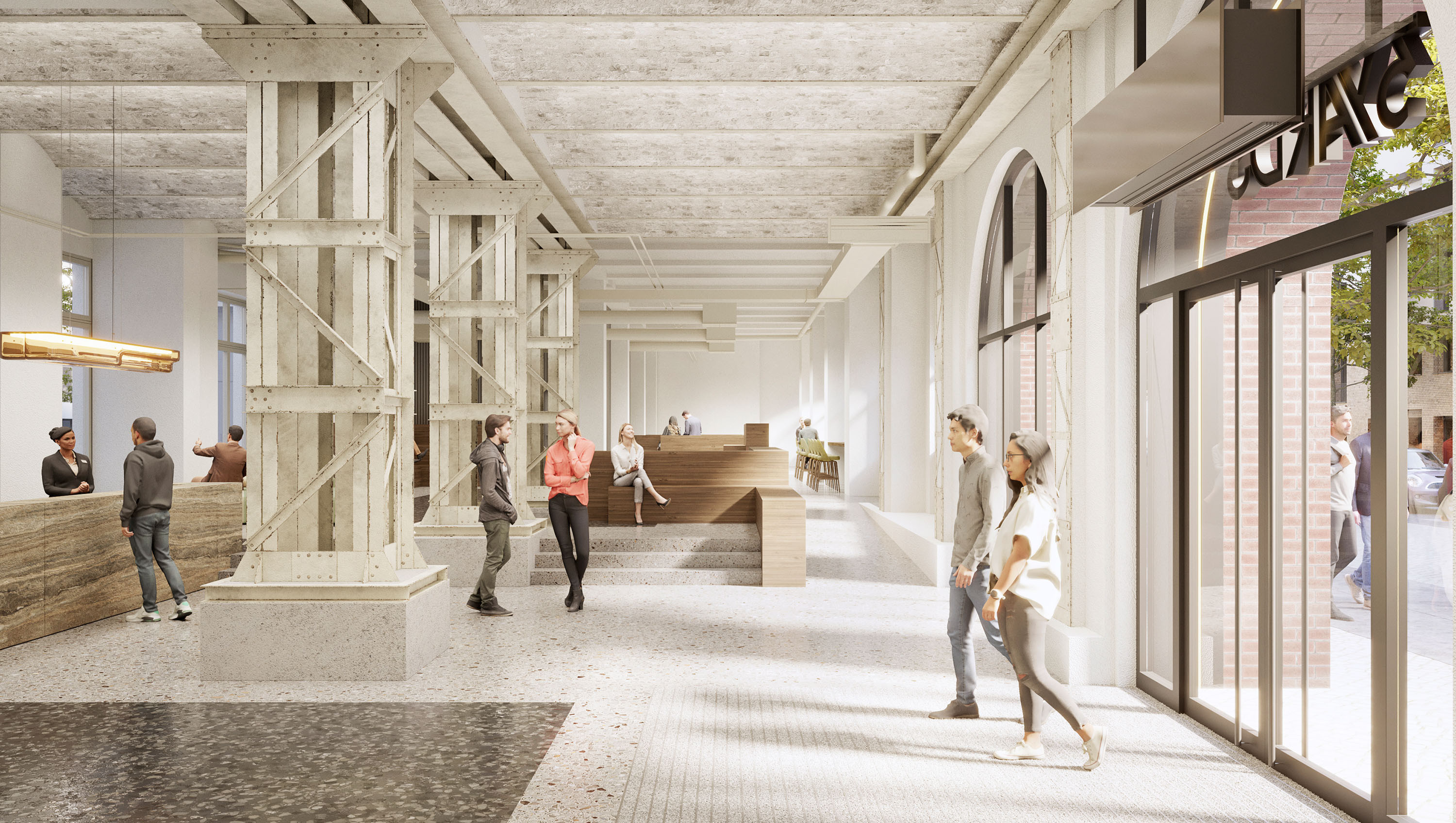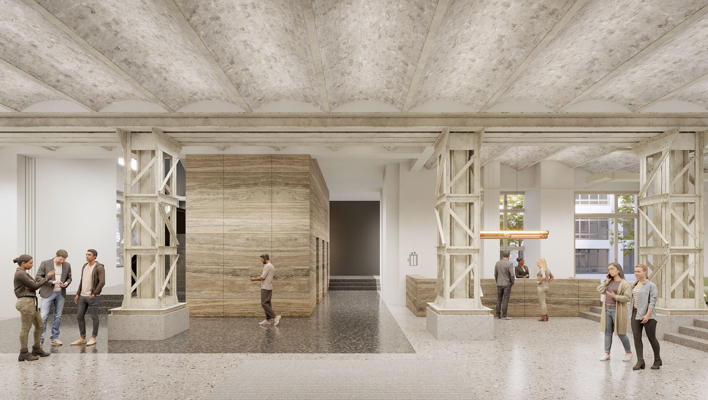 Auf einer Fläche von rund 30.000 m² entstehen flexibel nutzbare Büro- und Arbeitsflächen. Die Räume sind durch hohe Decken, historische Bauelemente und anpassungsfähige Grundrisse geprägt und eignen sich für unterschiedliche Arbeitsformate. Ergänzend sind Work Lounges, Konferenzbereiche, Maker Spaces, Food-Halls sowie Flächen für Einzelhandel und Logistik vorgesehen.