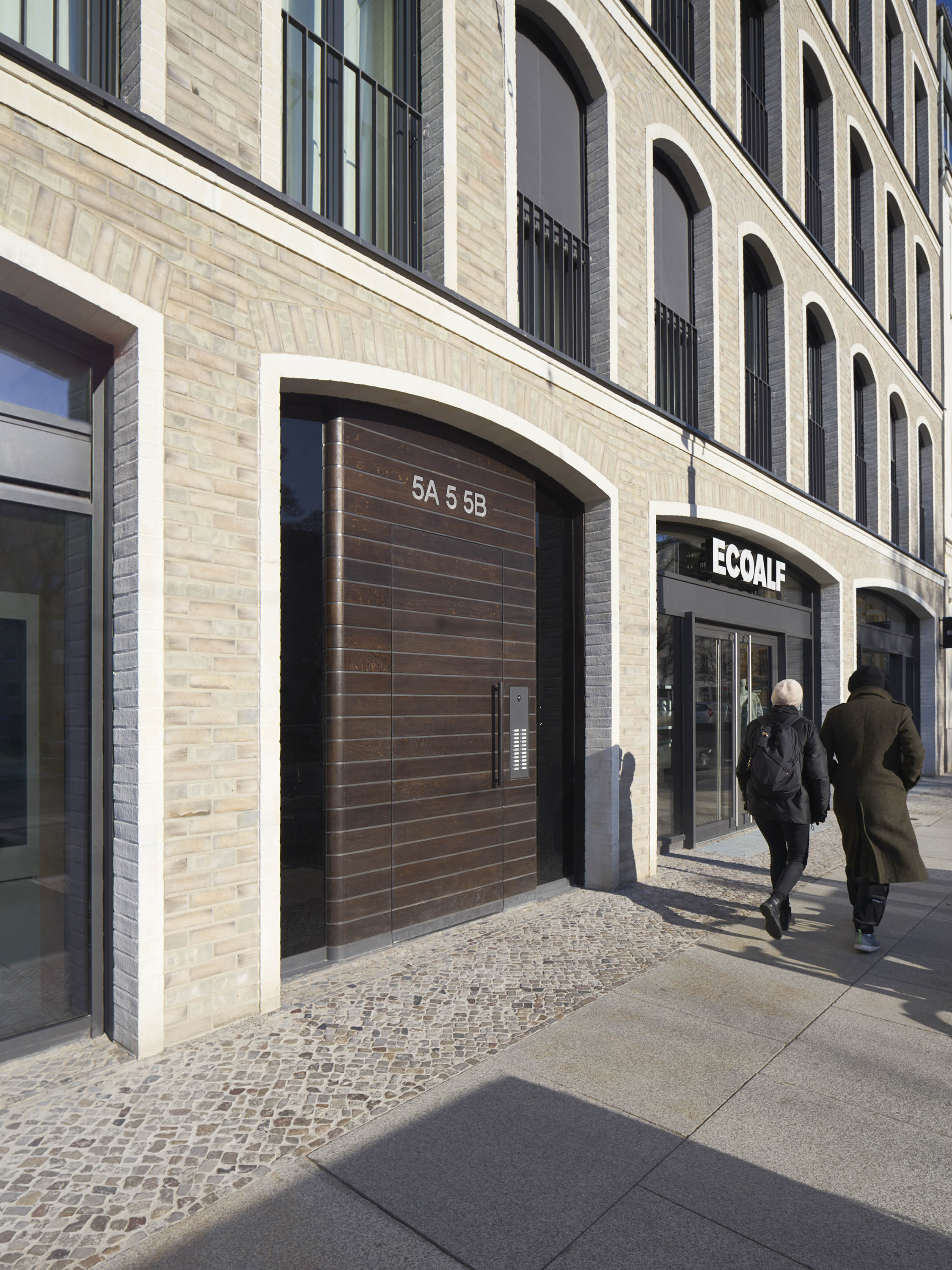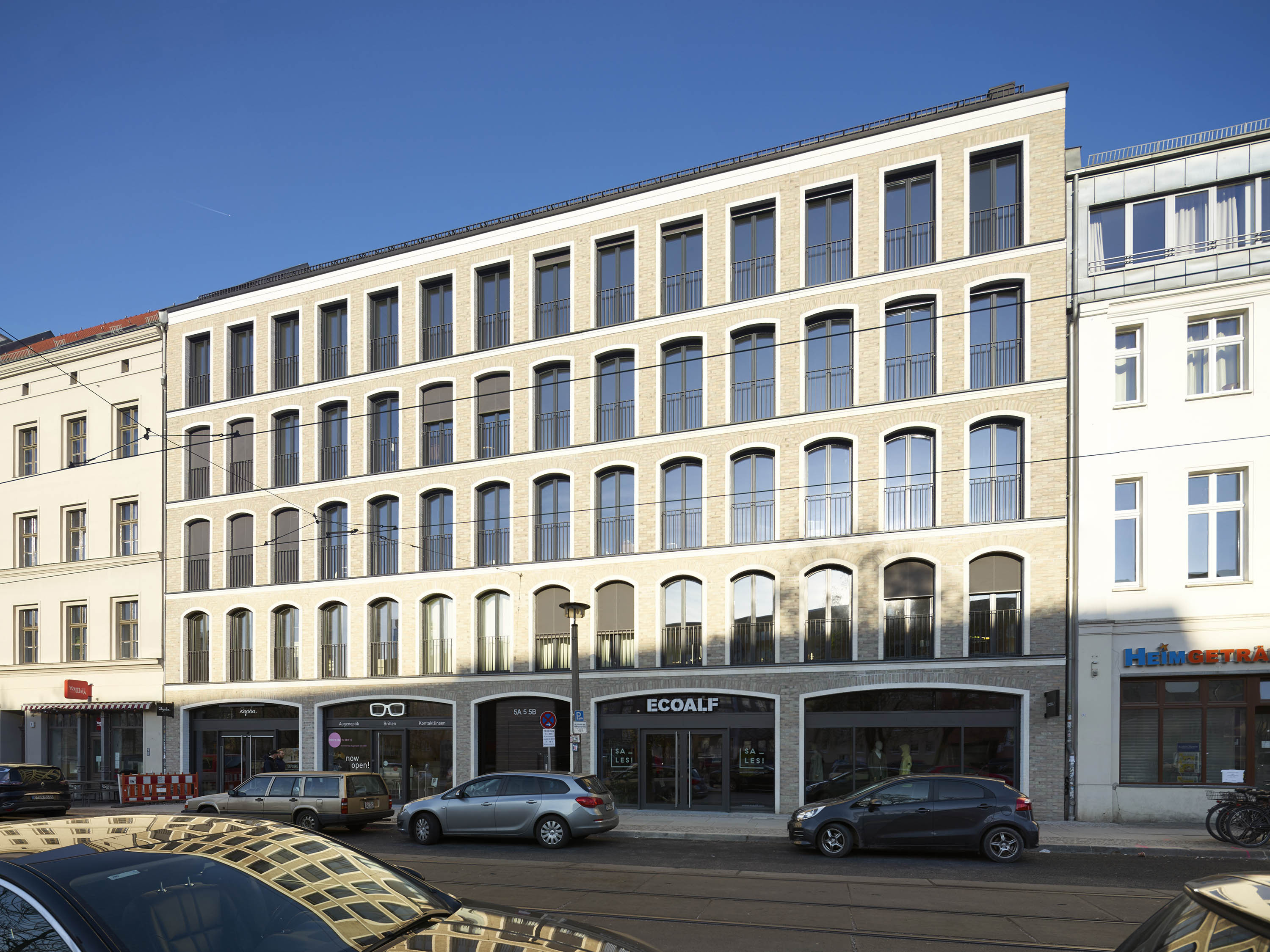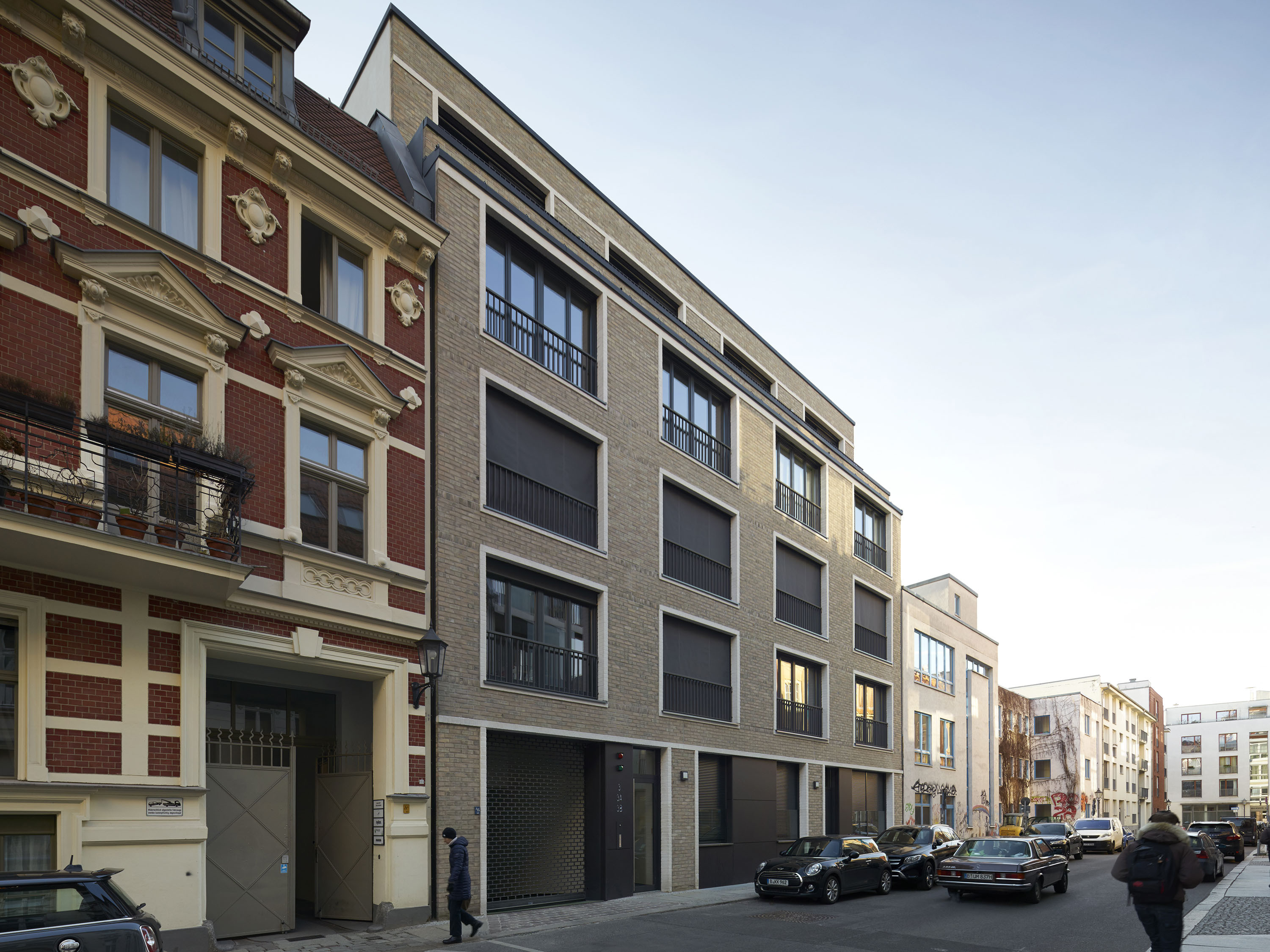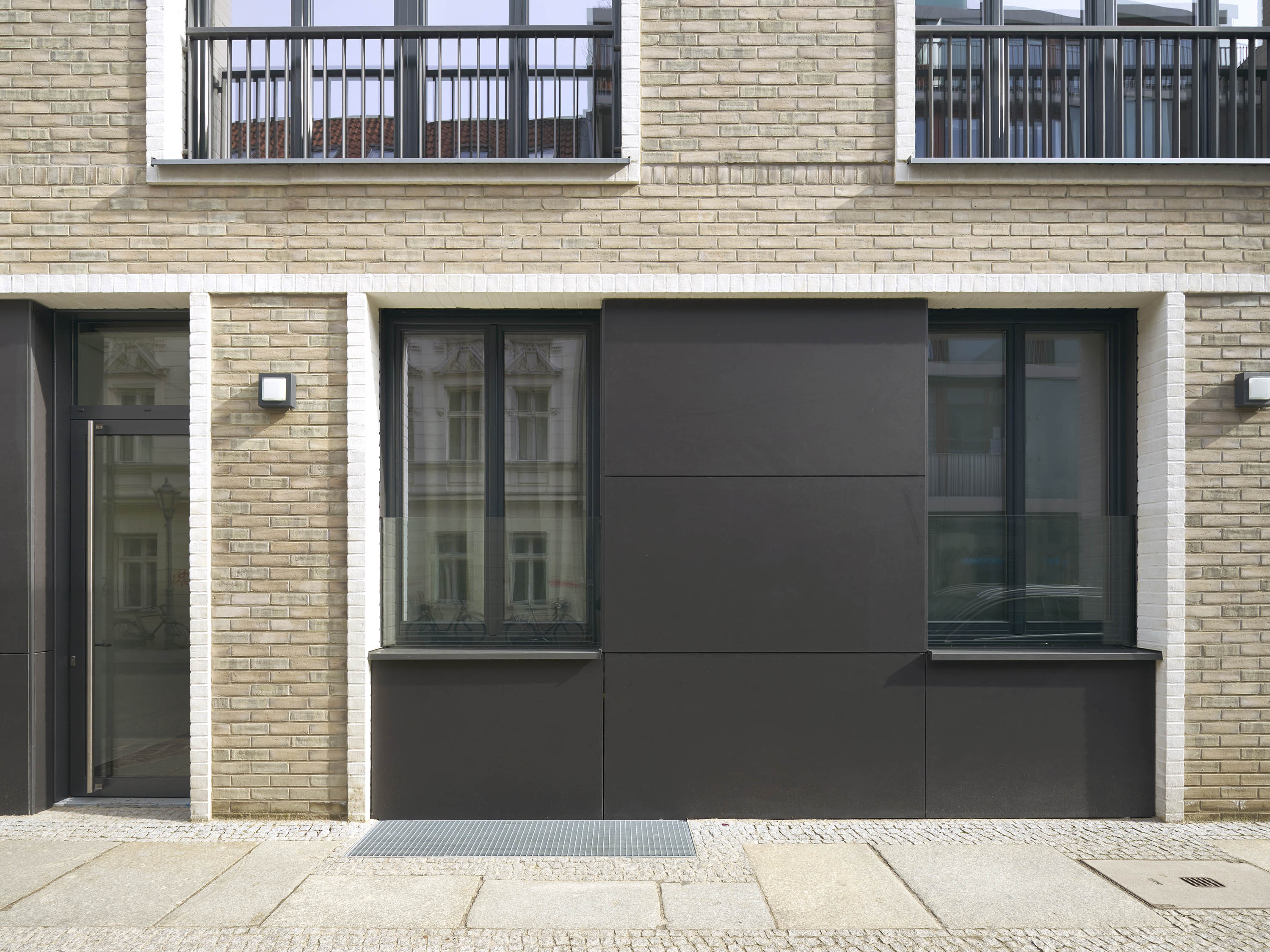 Die beiden zur Straße gewandten Seiten sind mit Klinker in einem warmen, leicht changierenden Beige-Ton verkleidet. Das zur Alten Schönhauser gerichtete fünfgeschossige Gebäude hat ein klares und striktes Raster aus Bogenfenstern. Die unterschiedlichen Tiefen der Bögen sorgen dabei für eine leichte Spannung in der Fassadentektonik. Gewerbliche Nutzungen im Erdgeschoss werden in weiten Fensteröffnungen präsentiert.