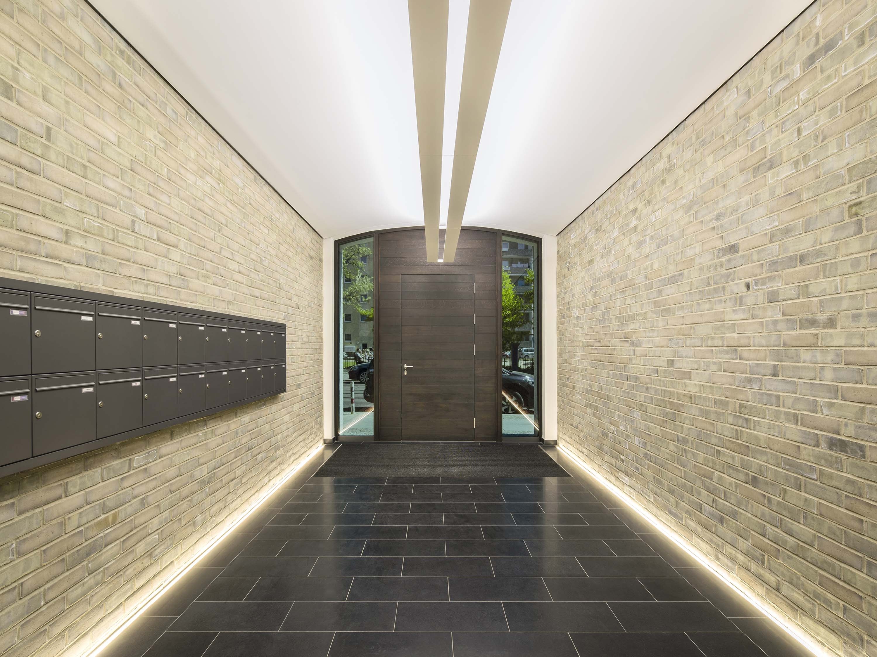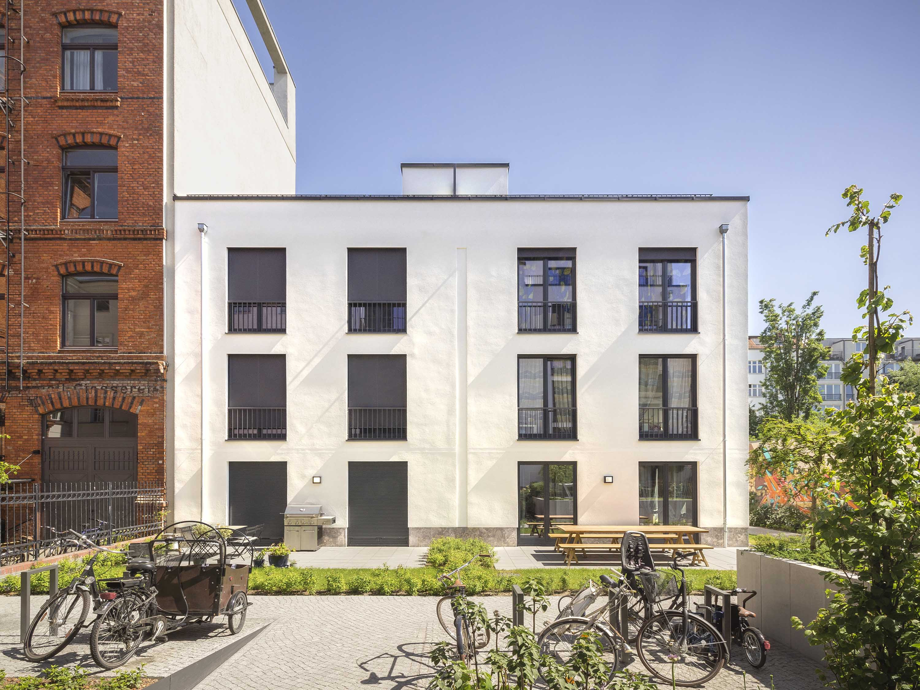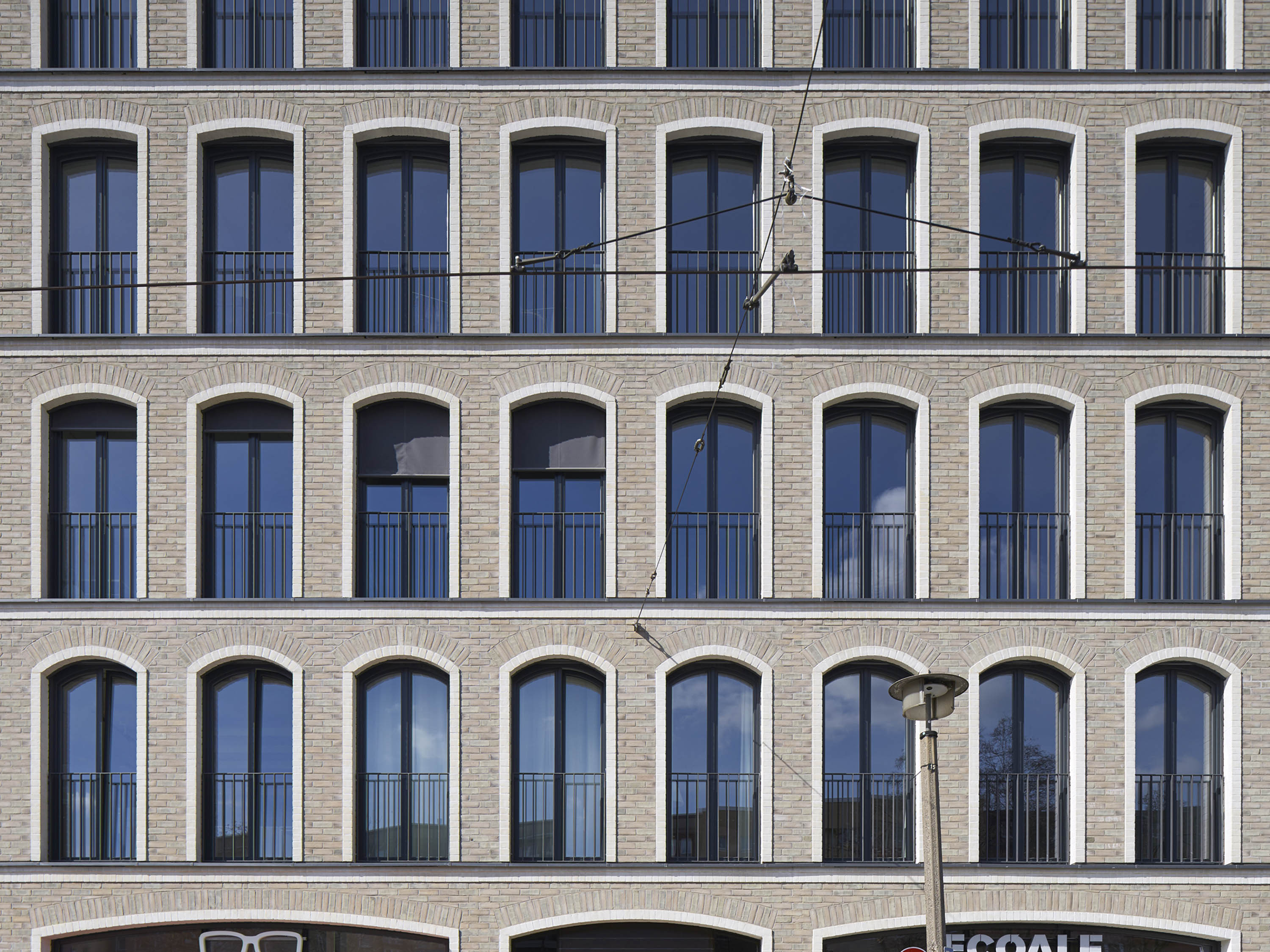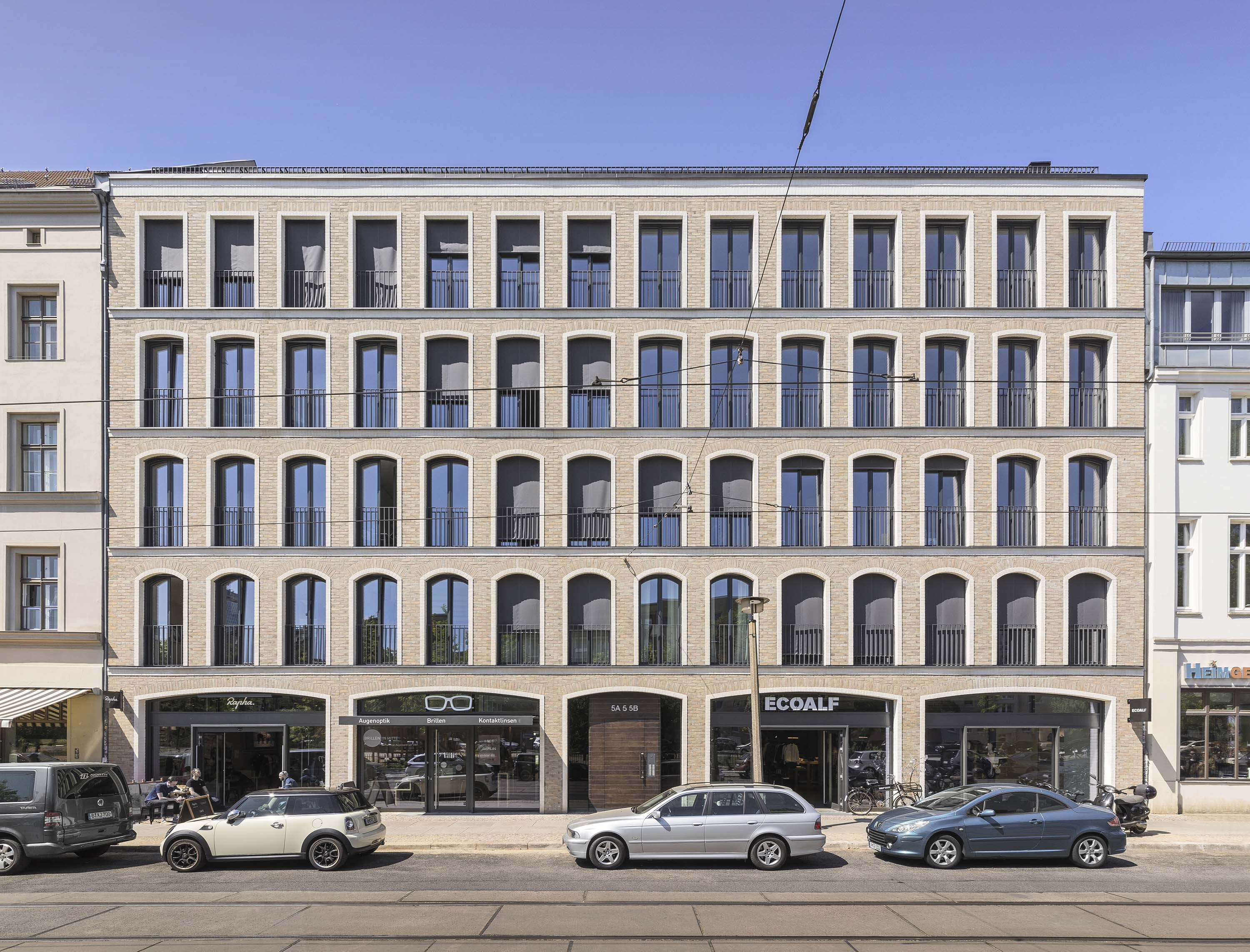 Die beiden zur Straße gewandten Seiten sind mit Klinker in einem warmen, leicht changierenden Beige-Ton verkleidet. Das zur Alten Schönhauser gerichtete fünfgeschossige Gebäude hat ein klares und striktes Raster aus Bogenfenstern. Die unterschiedlichen Tiefen der Bögen sorgen dabei für eine leichte Spannung in der Fassadentektonik. Gewerbliche Nutzungen im Erdgeschoss werden in weiten Fensteröffnungen präsentiert.
