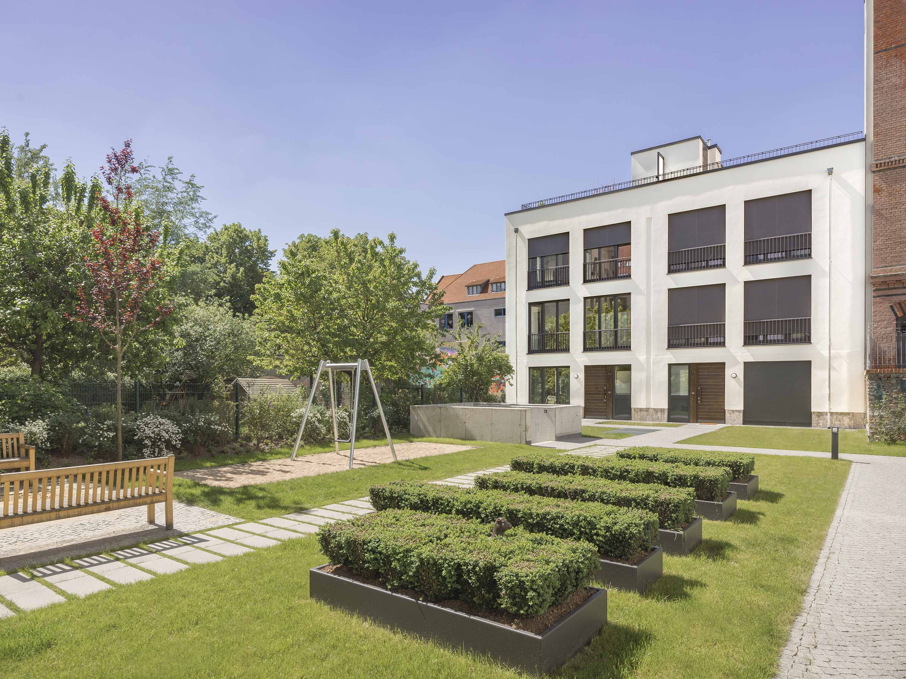 Im grünen, ruhigen Innenhof befinden sich vier Townhouses, die paarweise zusammenhängend platziert sind.