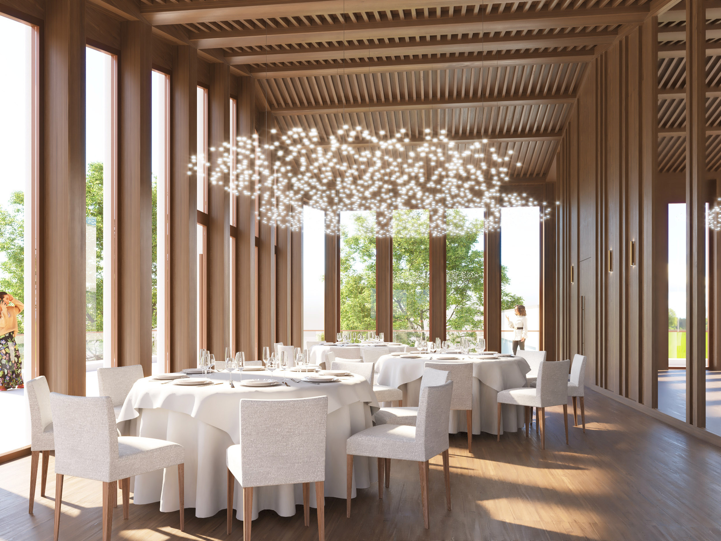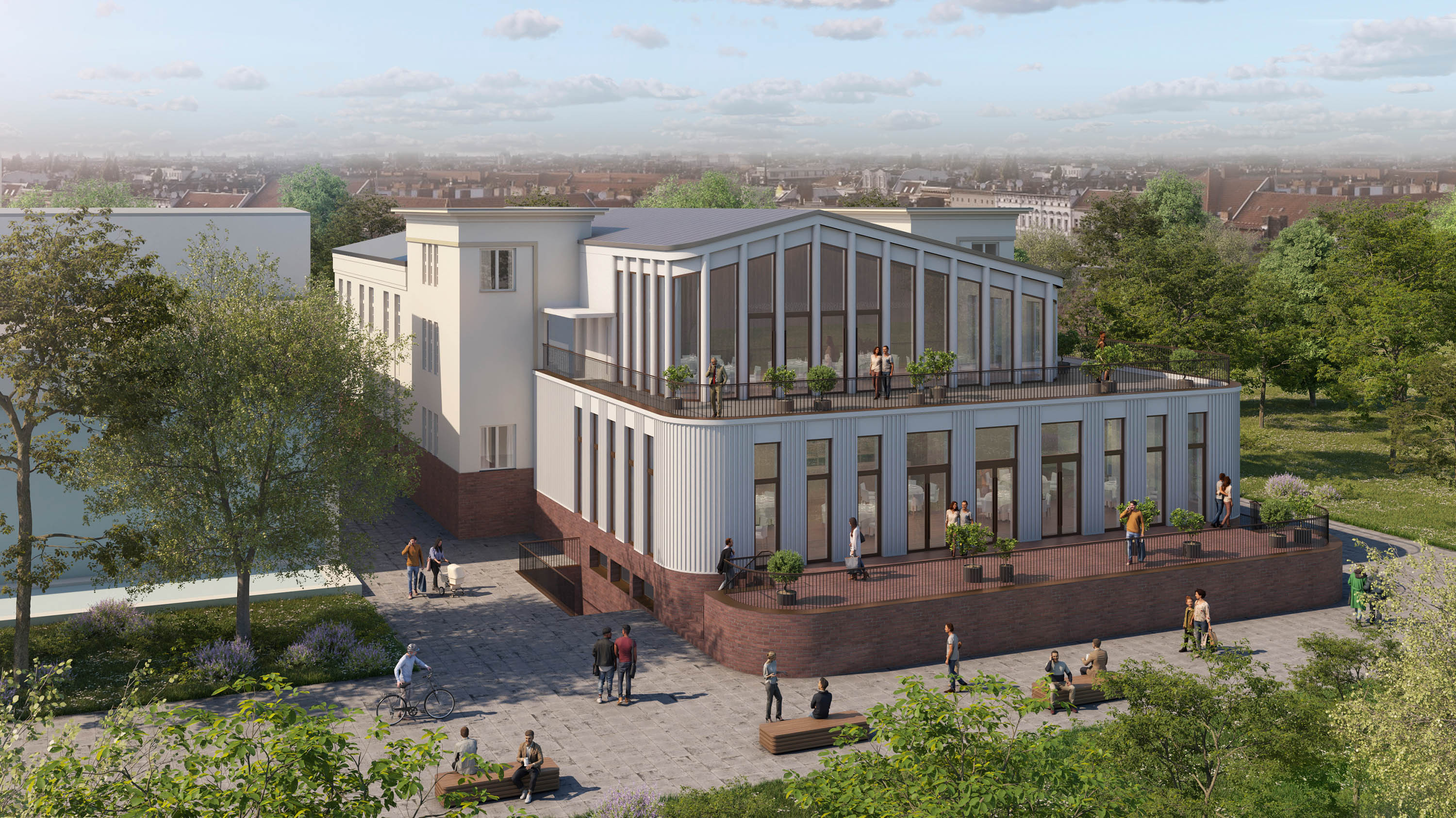 Der Gemeindesaal wird ebenso vergrößert und findet in einem neuen zweigeschossigen Anbau mit vorgelagerter Terrasse platzt. Verbindendes Element mit dem Baubestand ist der Sockel aus rostrotem Mauerwerk, auf dem der Anbau ruht. Auch das Dach des Saals soll als Terrasse ausgebildet werden.