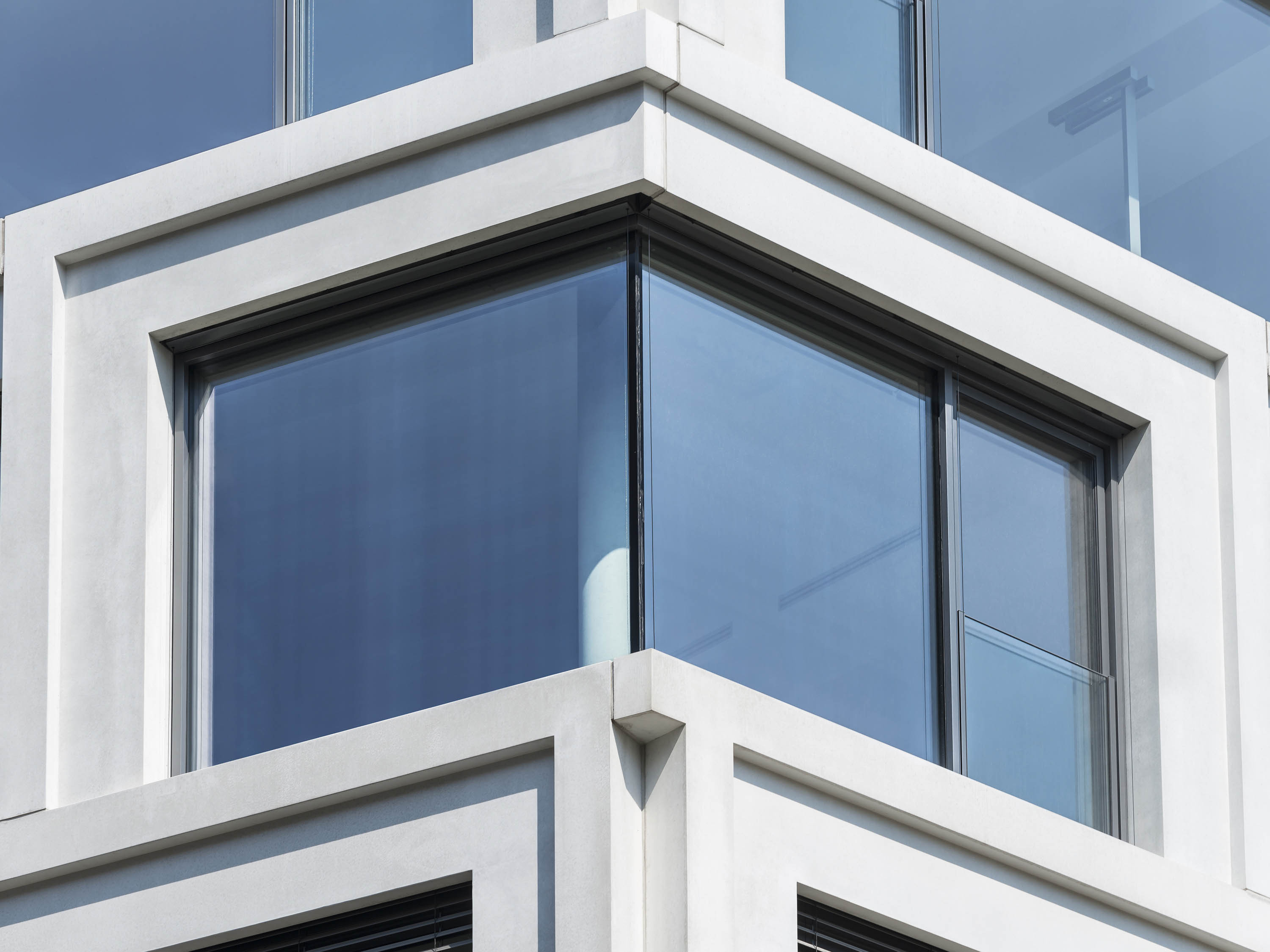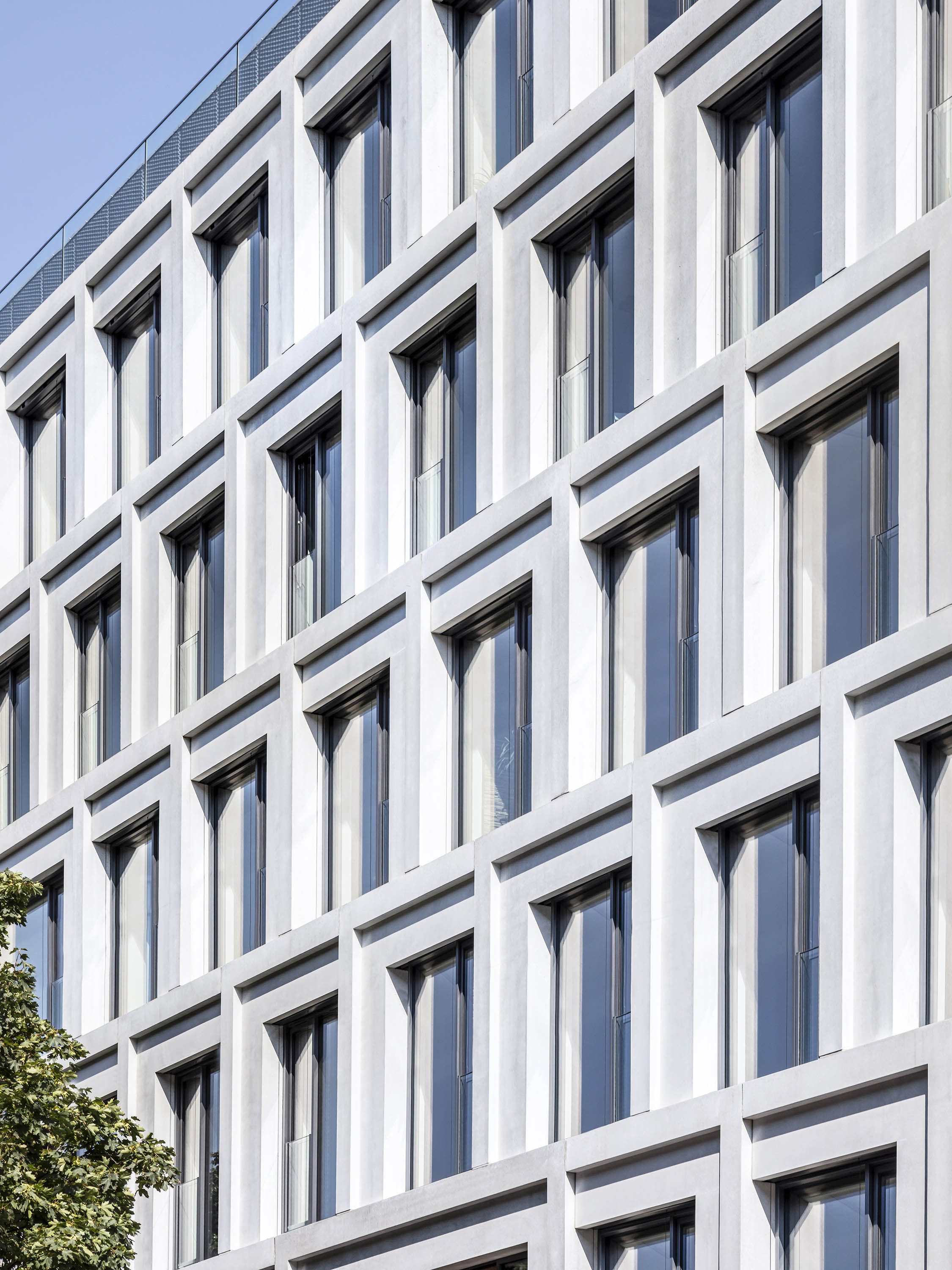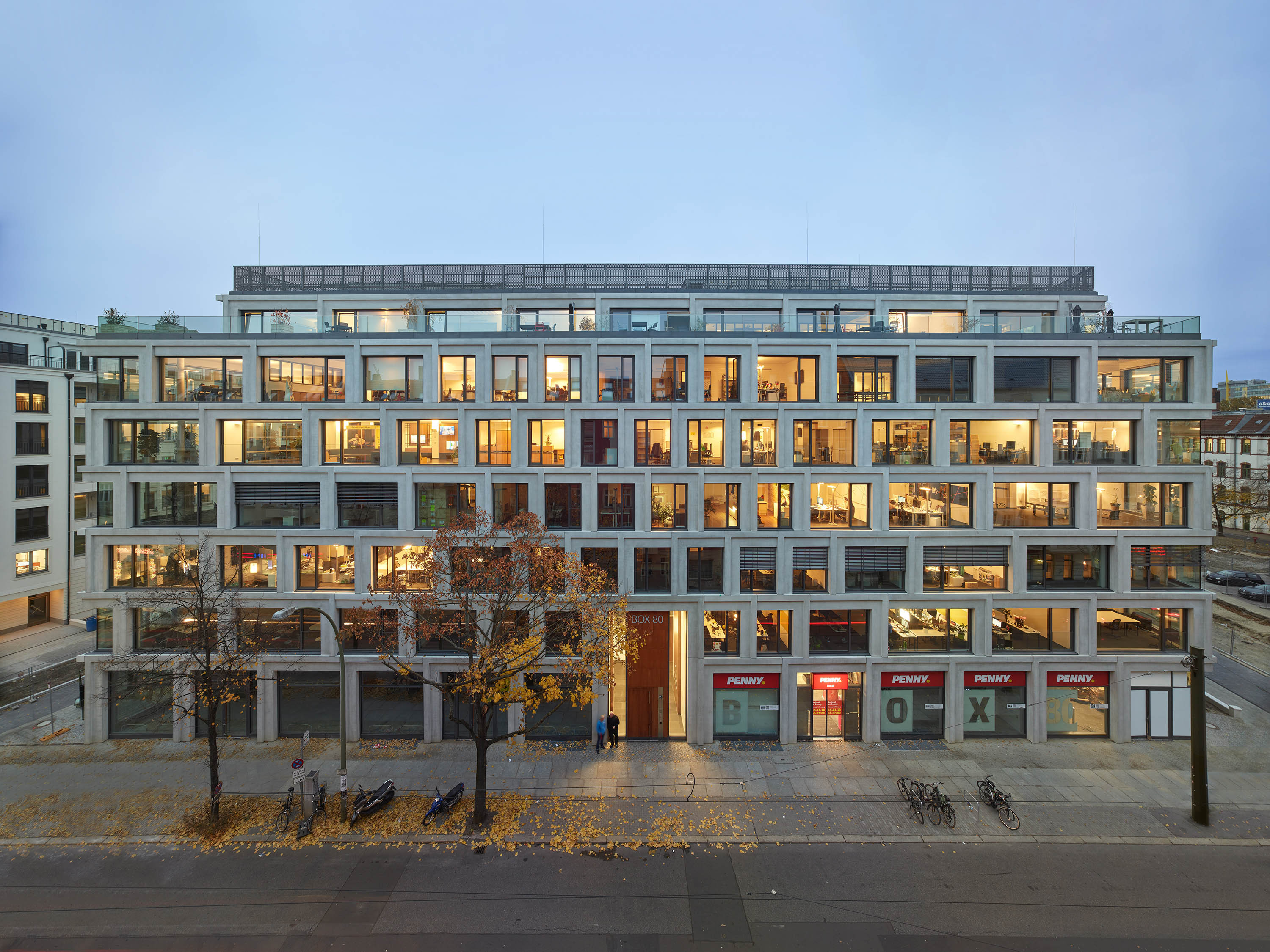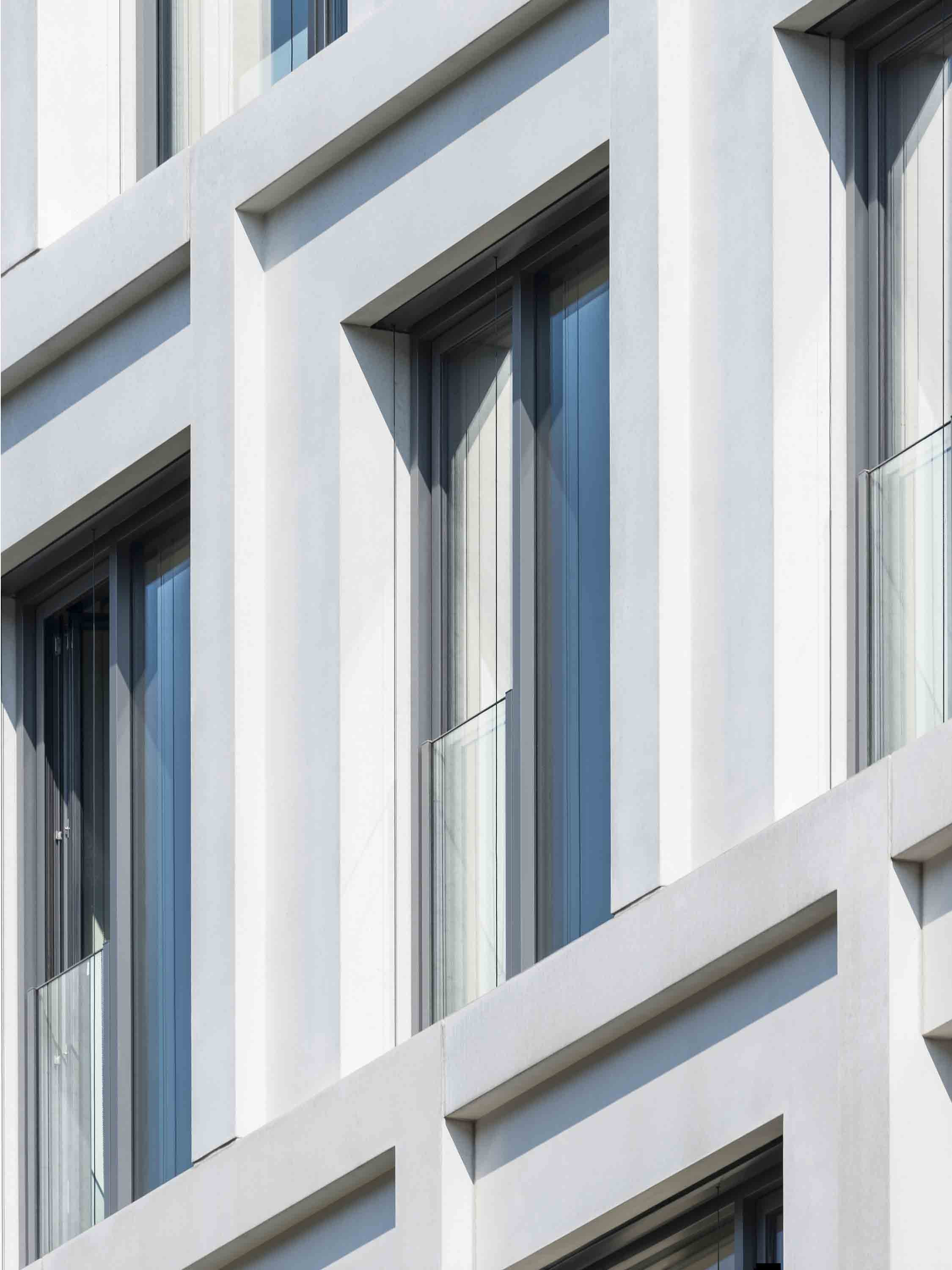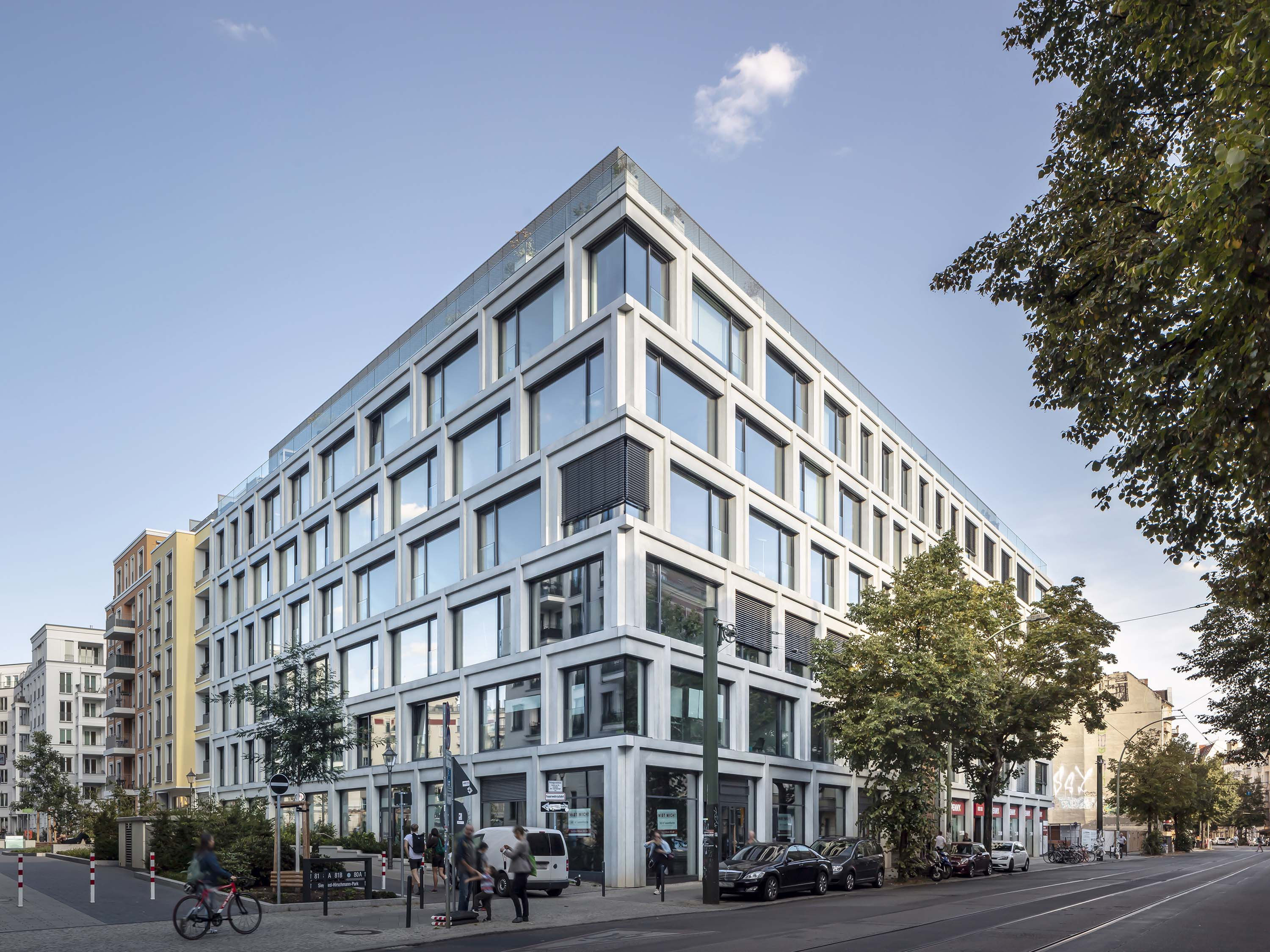 Als eines der Markenzeichen stellt sich an der Boxhagener Straße der Büroblock BY dar, ein großformatiges Volumen mit expressiver Fassadengestaltung. Für Dynamik im Erscheinungsbild sorgt die Anordnung der vorgehängten Fertigteile aus hellem Architekturbeton sowie deren Maßstabsdifferenzen und unterschiedliche Ausrichtung. Spitze Eckfenster sind hier als Ganzglasecken ausgeführt. Jedes Details ist dabei präzise ausgearbeitet.