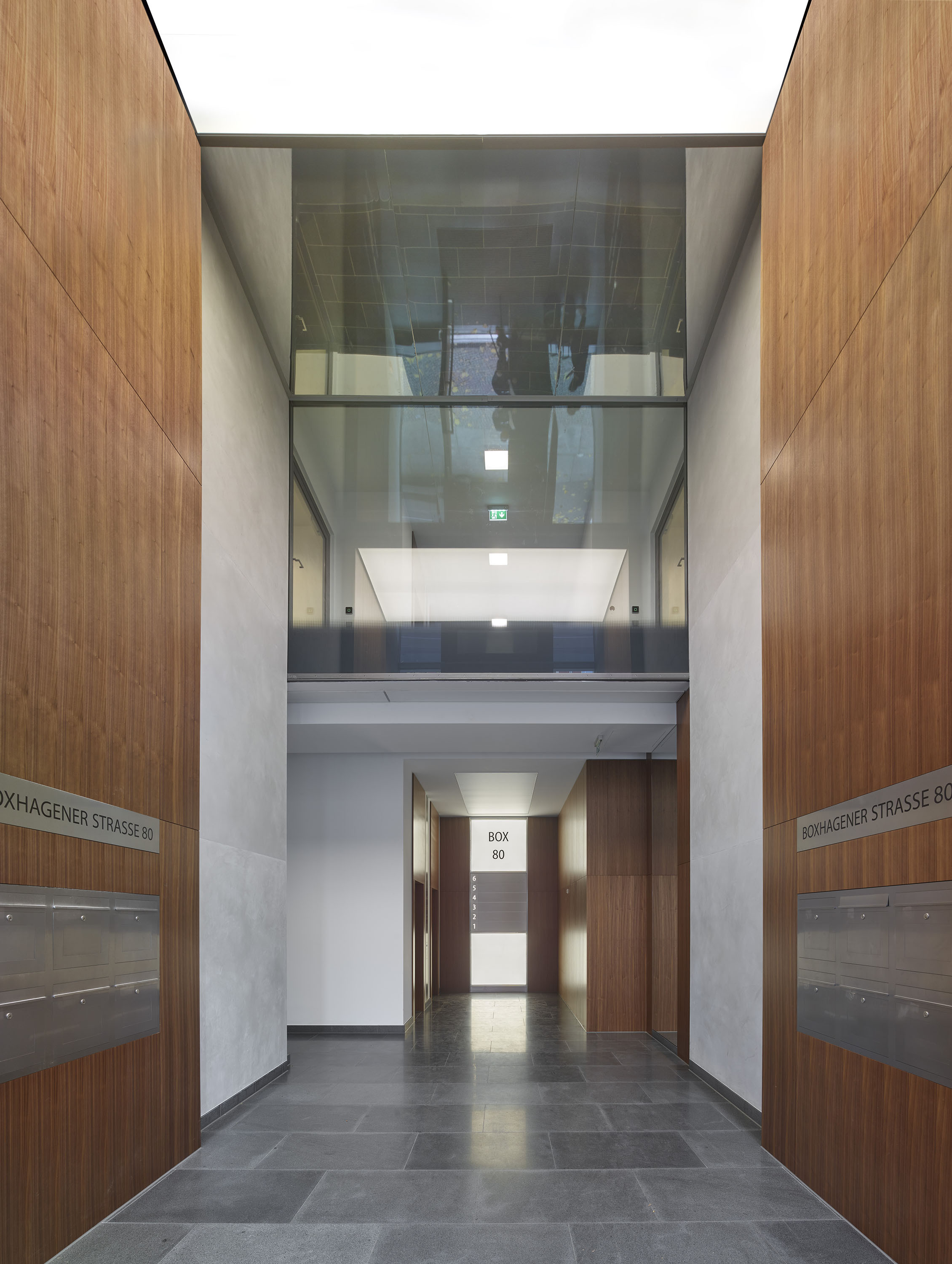 Der Eintrittsbereich ist durch ein markantes über zwei Geschosse wachsendes Tor aus amerikanischem Nussbaum betont, in dem die Tür und die Klingelanlage eingearbeitet sind.