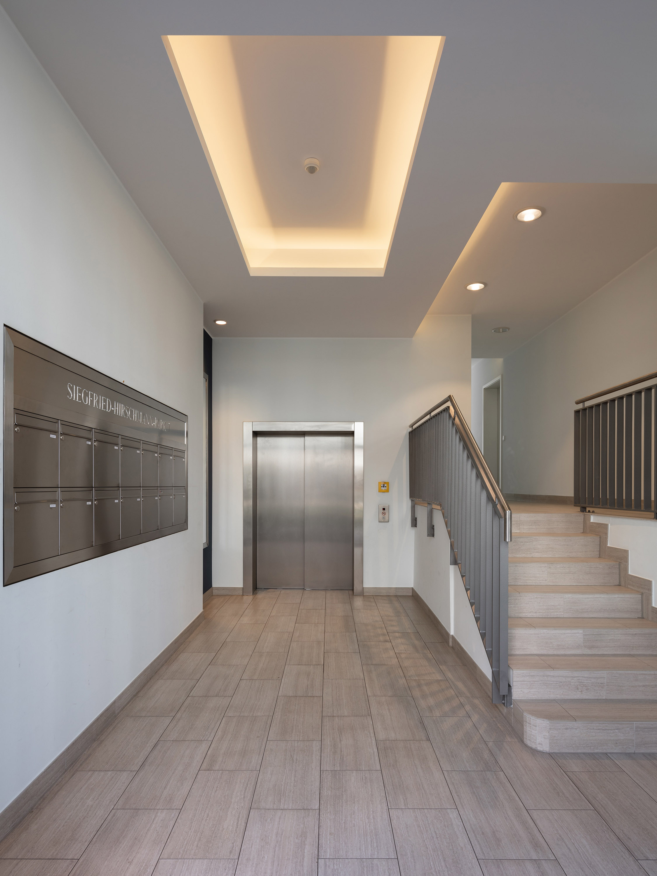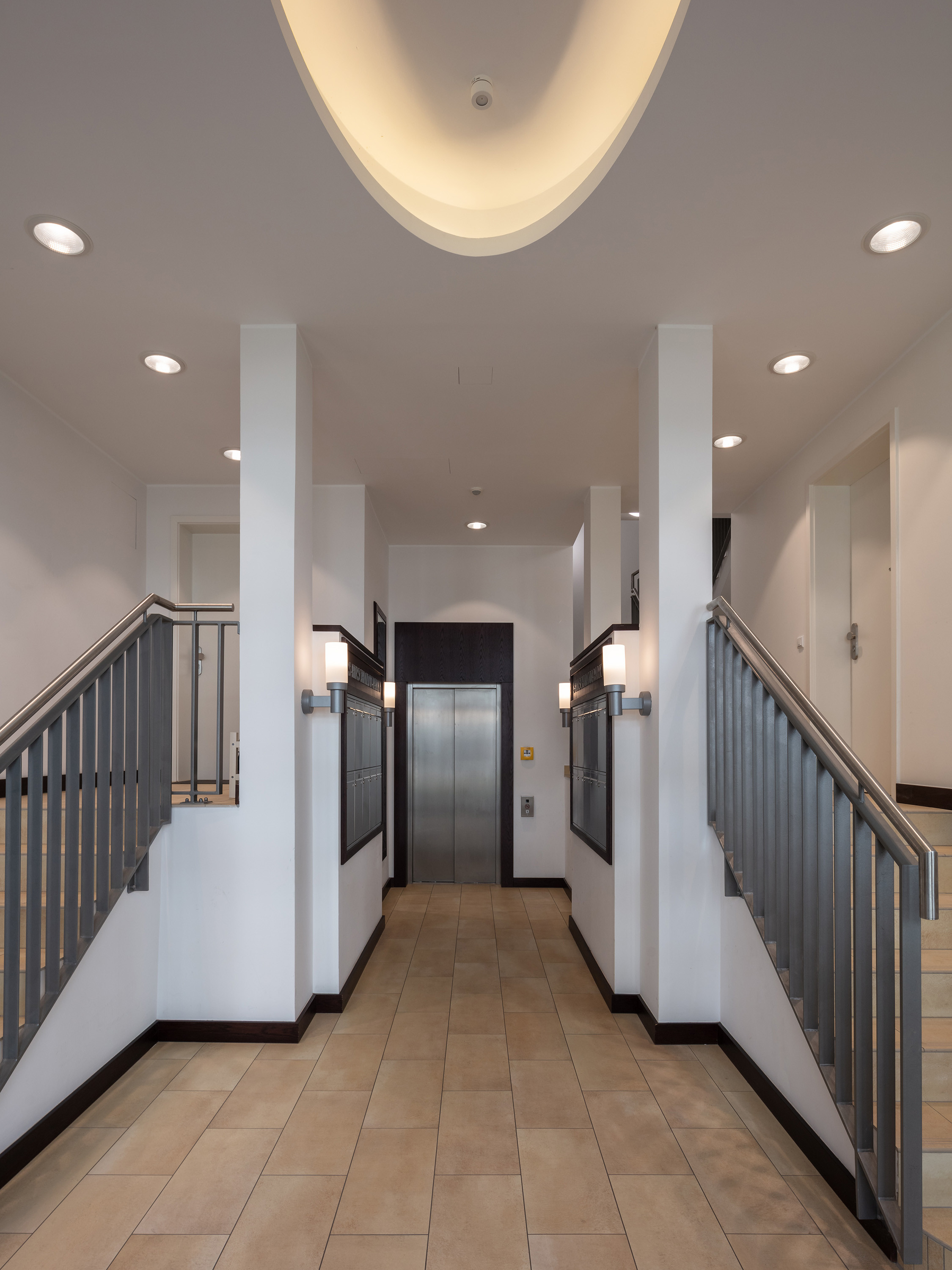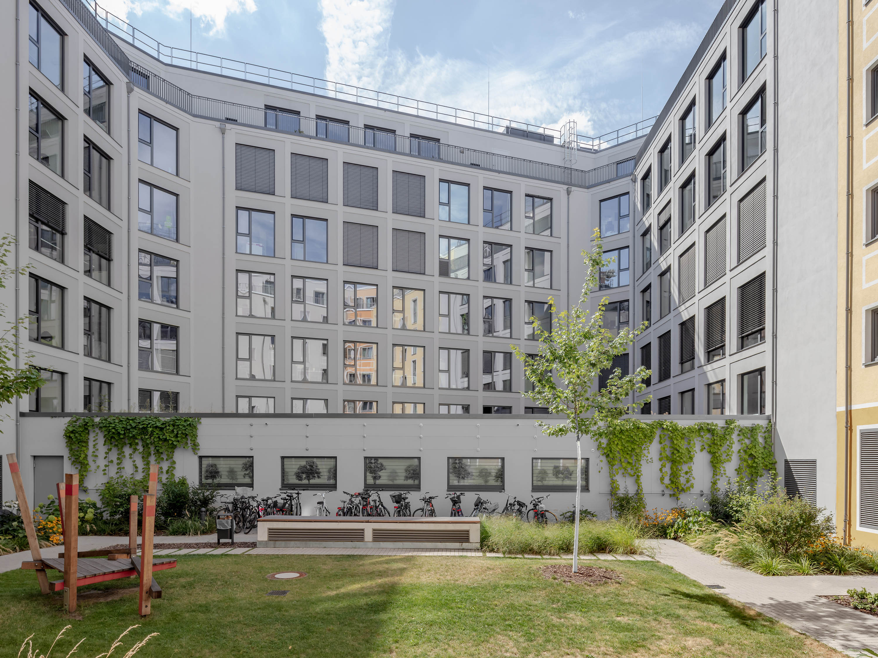 Der Wohnblock BZ umschließt zusammen mit dem Bürogebäude BY einen begrünten Innenhof mit privaten Vorgartenflächen. Der Block besitzt jeweils 6 Vollgeschosse sowie ein Staffelgeschoss mit 73 Wohneinheiten, Zwei- bis Vierzimmerwohnungen mit einer lichten Raumhöhe von ca. 2,70m und einer Gesamtwohnfläche von rund 6.500 m².