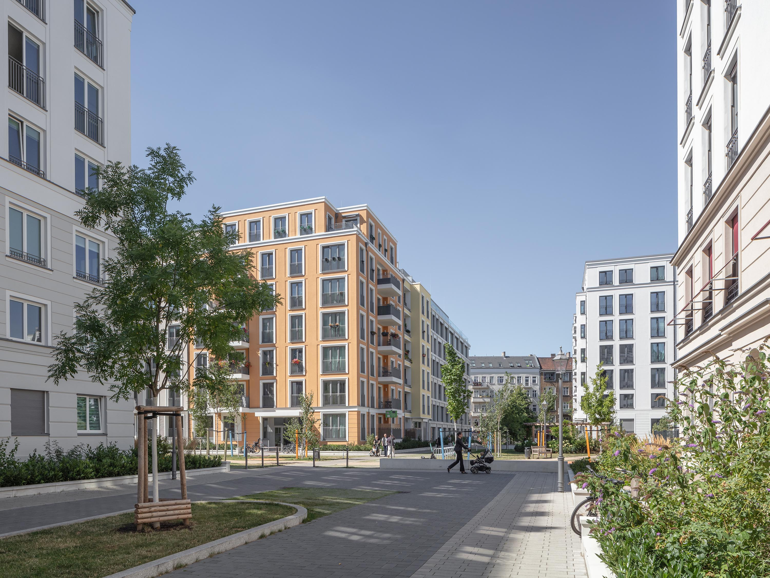 Die Fassadengestaltung wurde zur Erreichung einer möglichst großen Gestaltungsvielfalt auf dem Gesamtareal getrennt durch 4 Fassadenarchitekten vorgenommen. Für Block BY und BZ zeichnen TCHOBAN VOSS Architekten verantwortlich. Die Fassaden wurden mit einem Wärmedämmverbundsystem mit feinkörniger Putzschicht und unterschiedlicher Farbgebung zur Abgrenzung der einzelnen Einheiten innerhalb des Blockes ausgeführt.