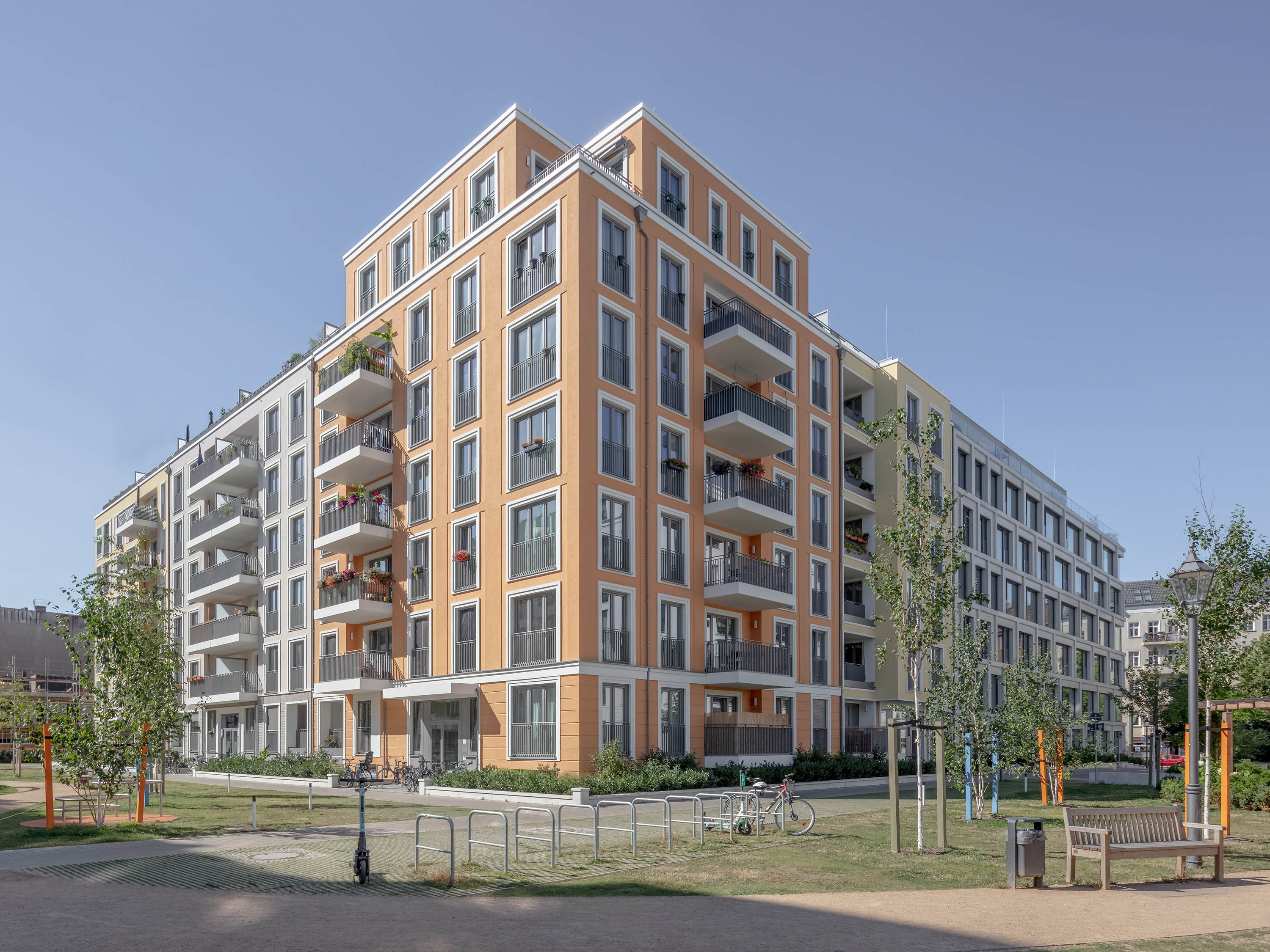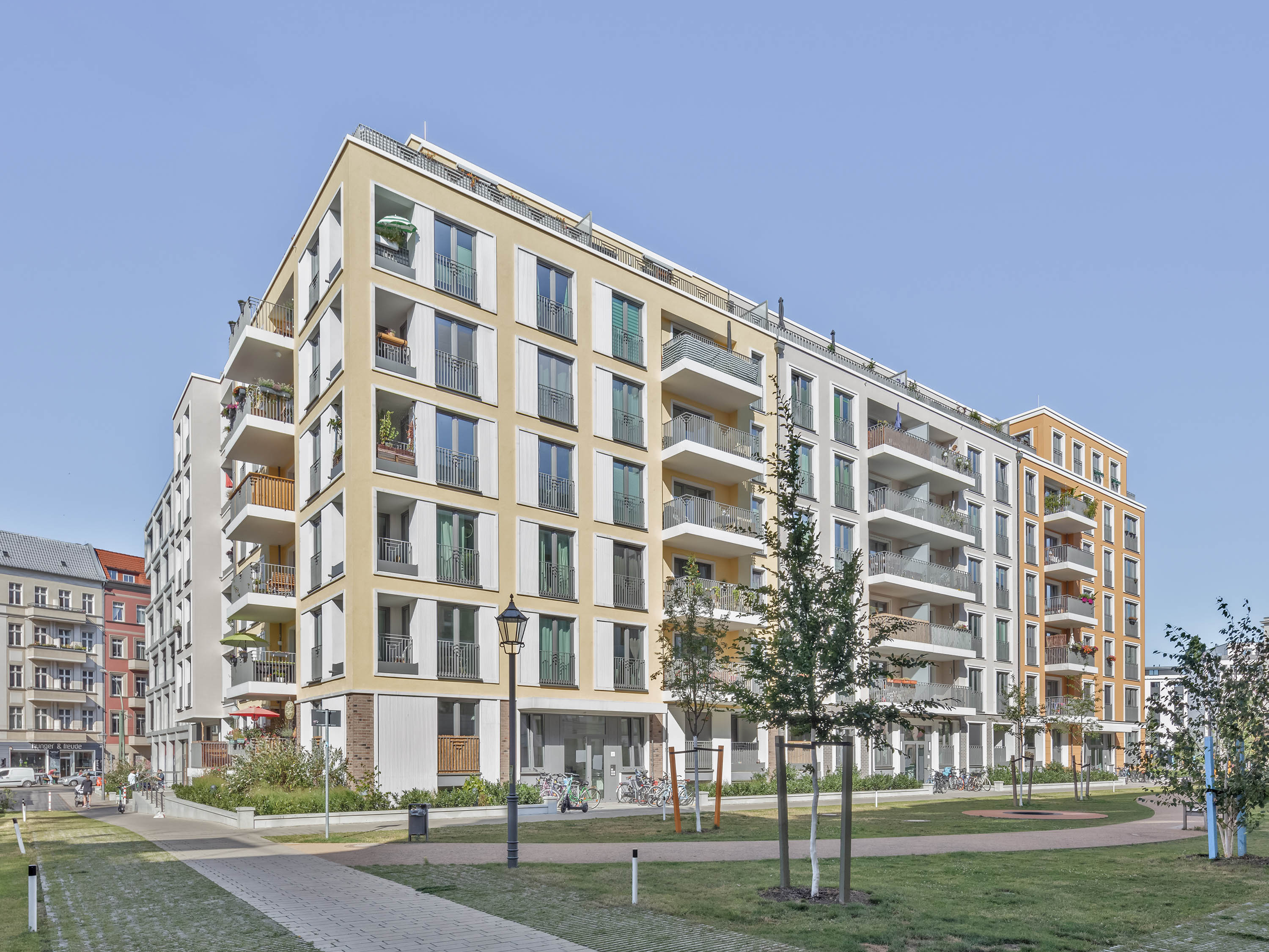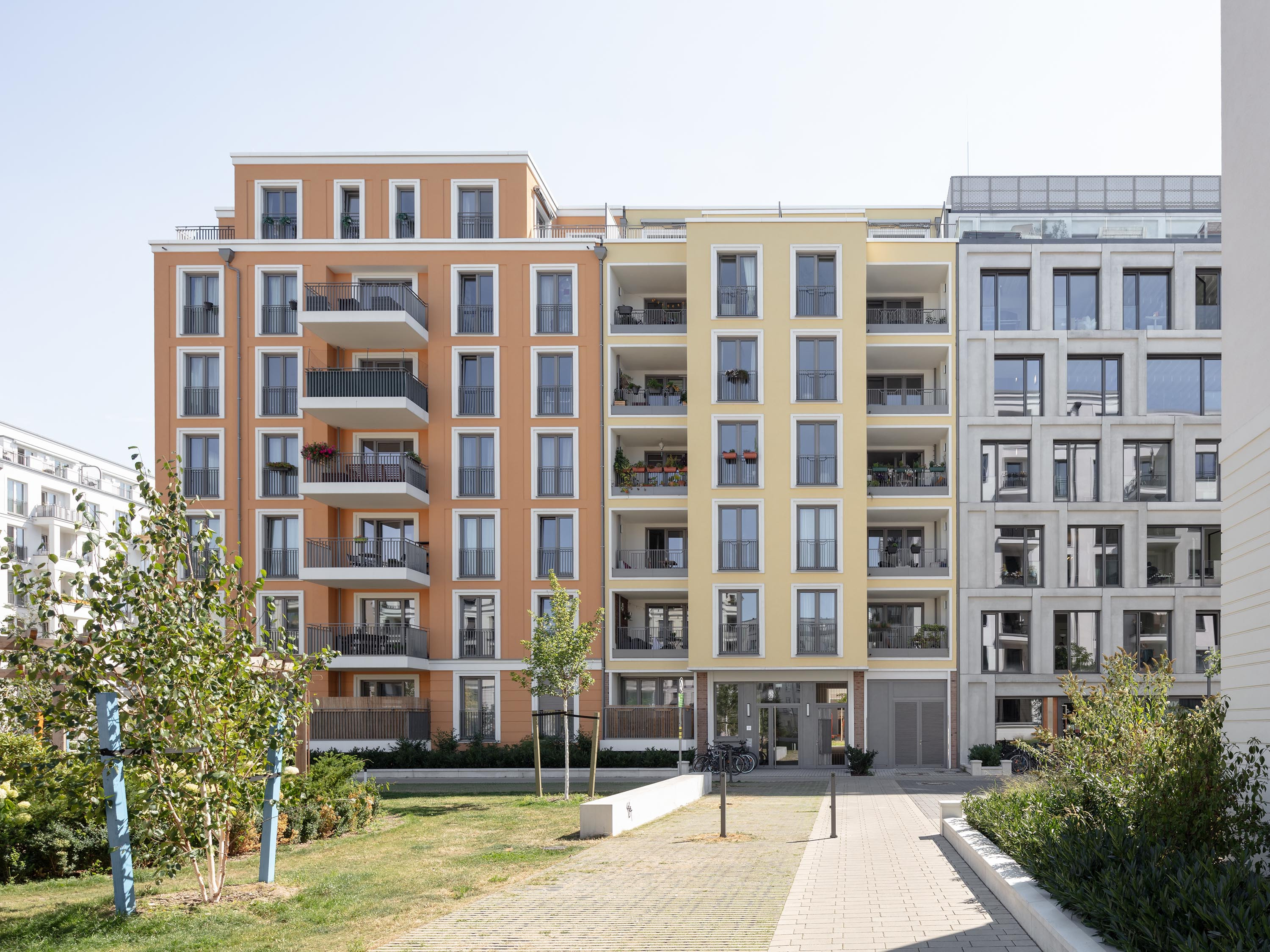 Im Vergleich zu den aufwendig gestalteten, straßenseitig und stadtgartenseitig orientierten Fassadenflächen sind die hofseitig orientierten Flächen zurückhaltender ausgebildet. Auch bei den Außenfassaden des Bauteils B gibt es eine Abstufung: Expressiv und markant präsentiert sich die Bürofassade (BY) zur Boxhagener Straße hin, die farblich akzentuierten Fassaden des anschließenden Wohnblock BZ erscheinen als Hintergrundarchitektur im Gefüge.