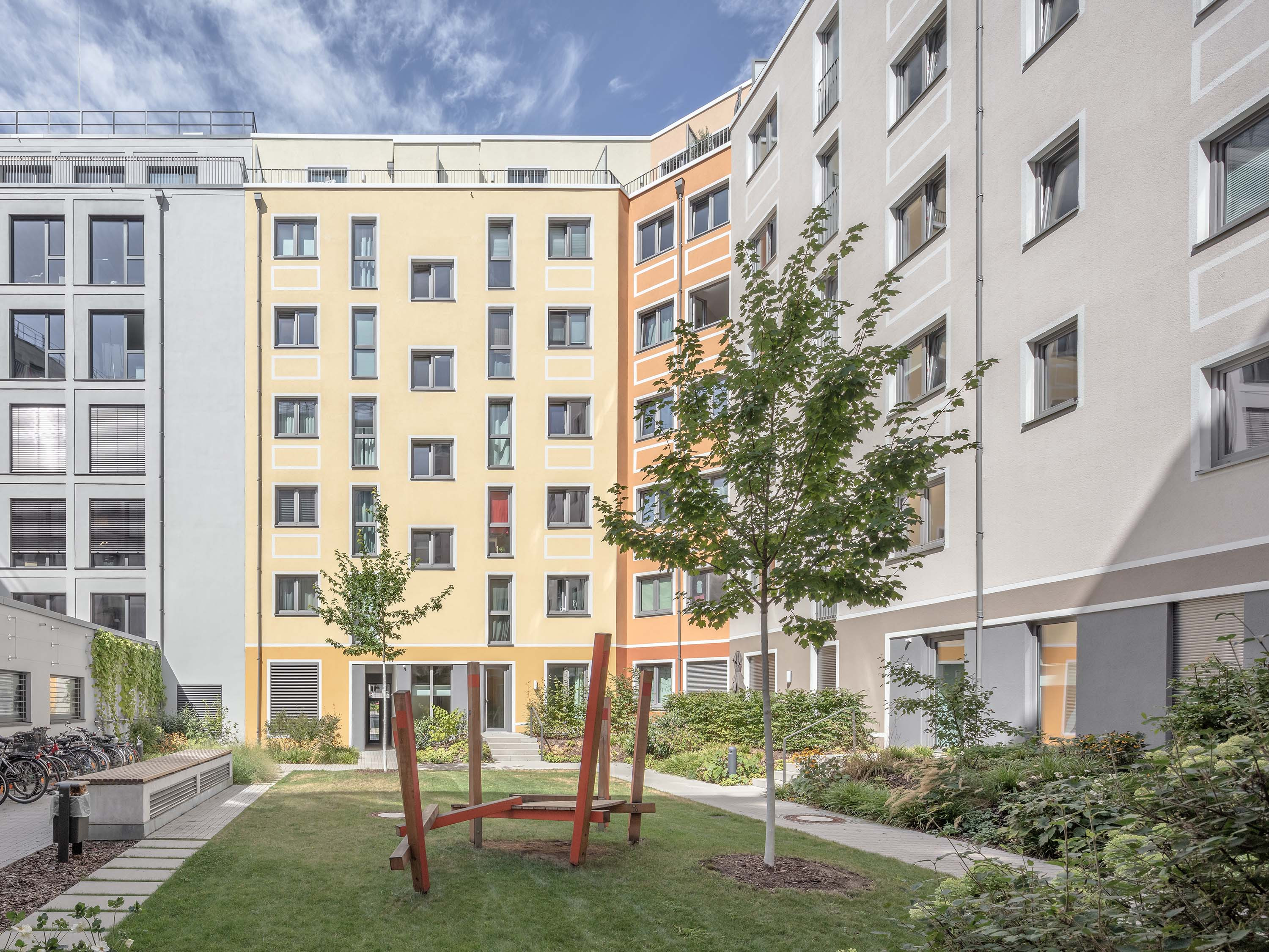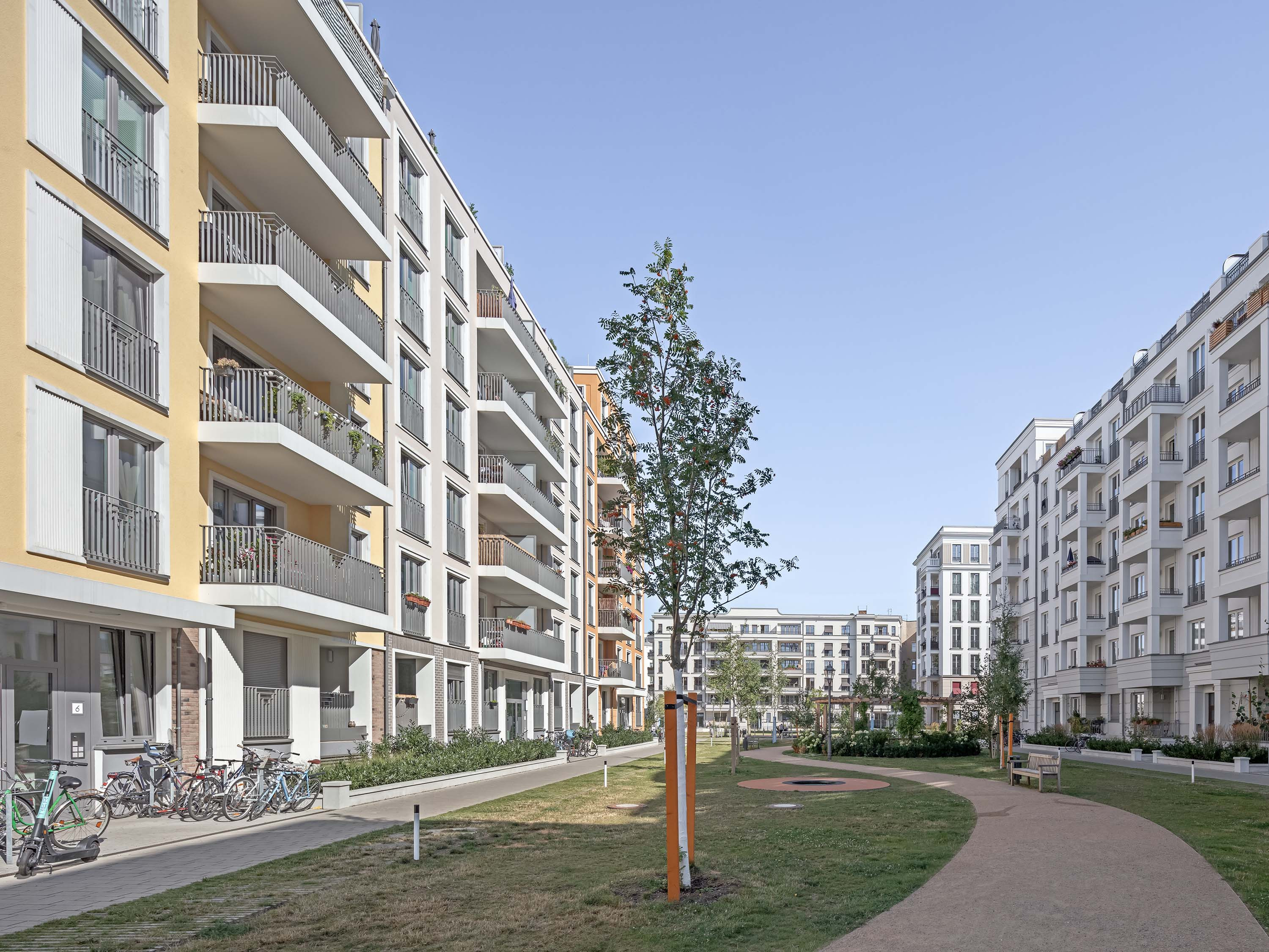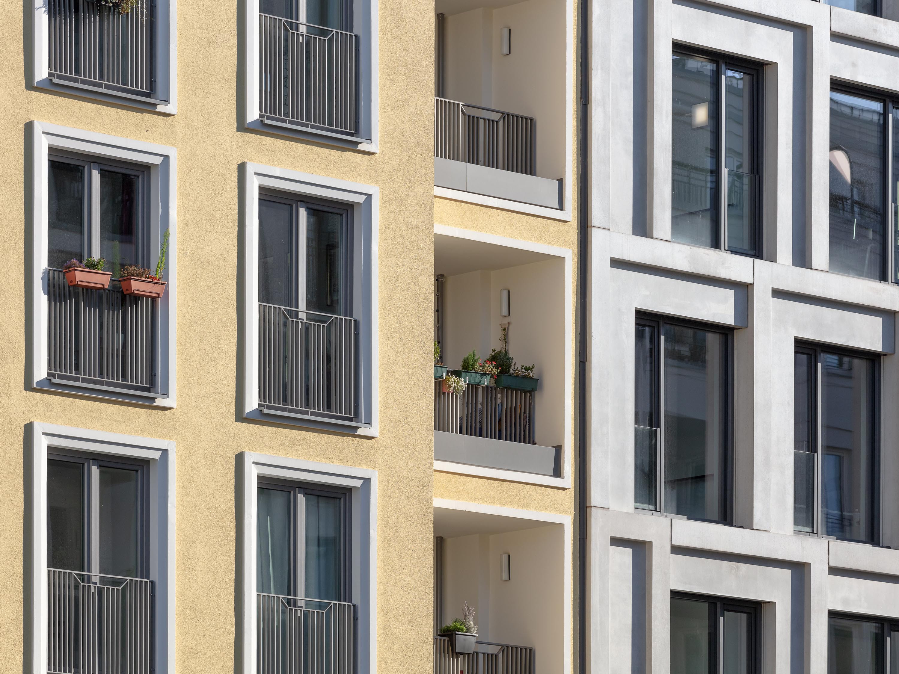 Im Vergleich zu den aufwendig gestalteten, straßenseitig und stadtgartenseitig orientierten Fassadenflächen sind die hofseitig orientierten Flächen zurückhaltender ausgebildet. Auch bei den Außenfassaden des Bauteils B gibt es eine Abstufung: Expressiv und markant präsentiert sich die Bürofassade (BY) zur Boxhagener Straße hin, die farblich akzentuierten Fassaden des anschließenden Wohnblock BZ erscheinen als Hintergrundarchitektur im Gefüge.