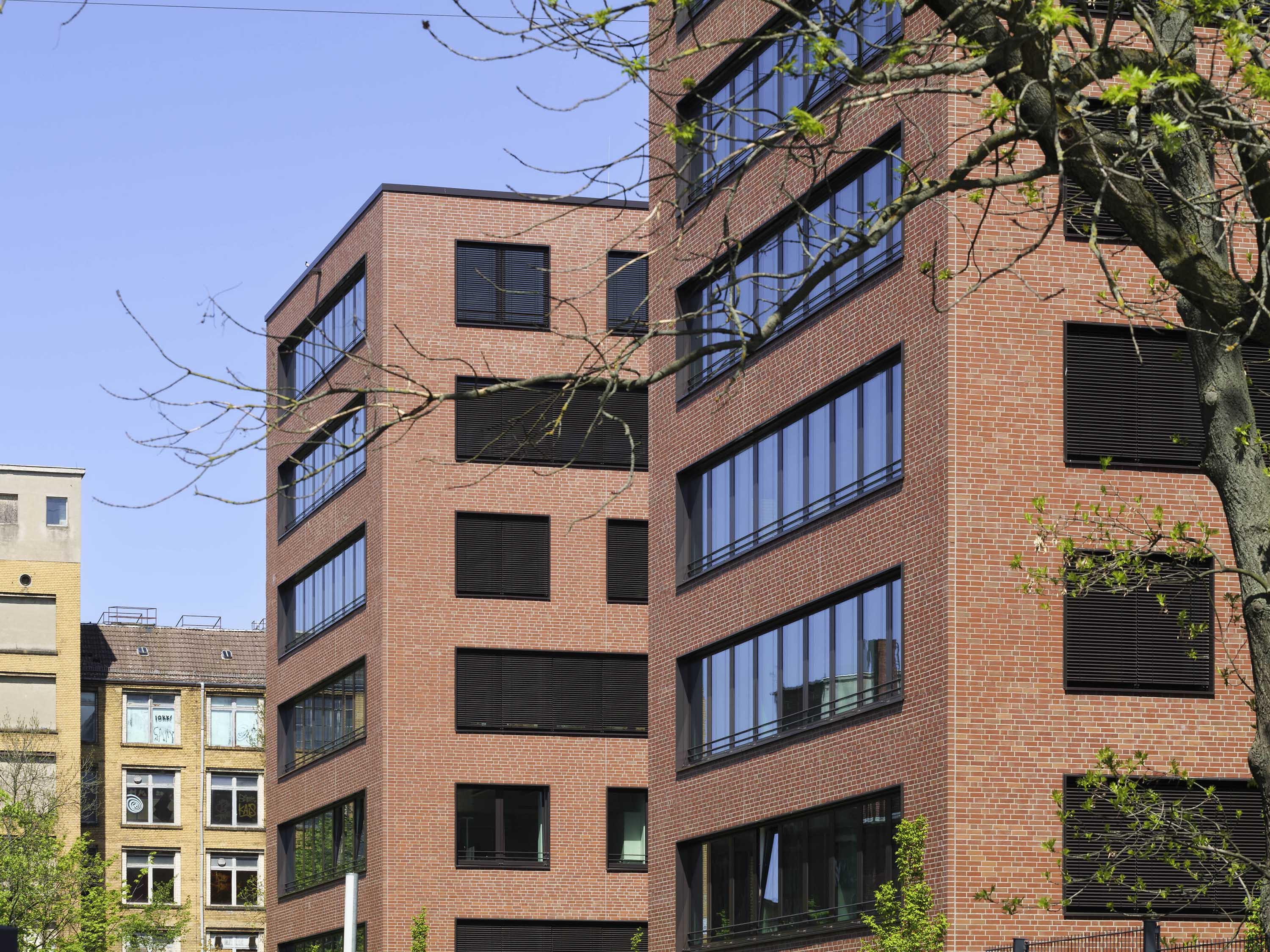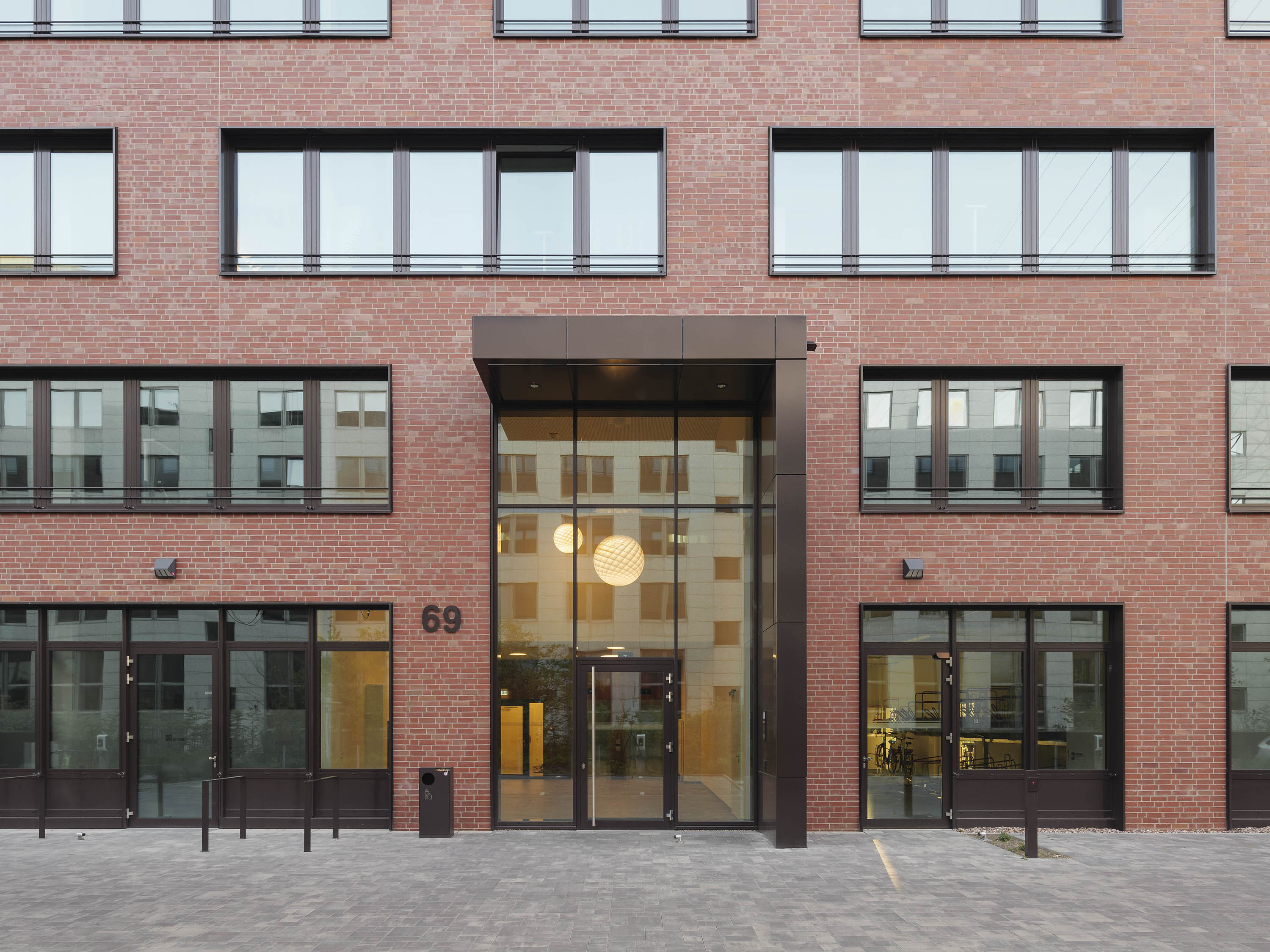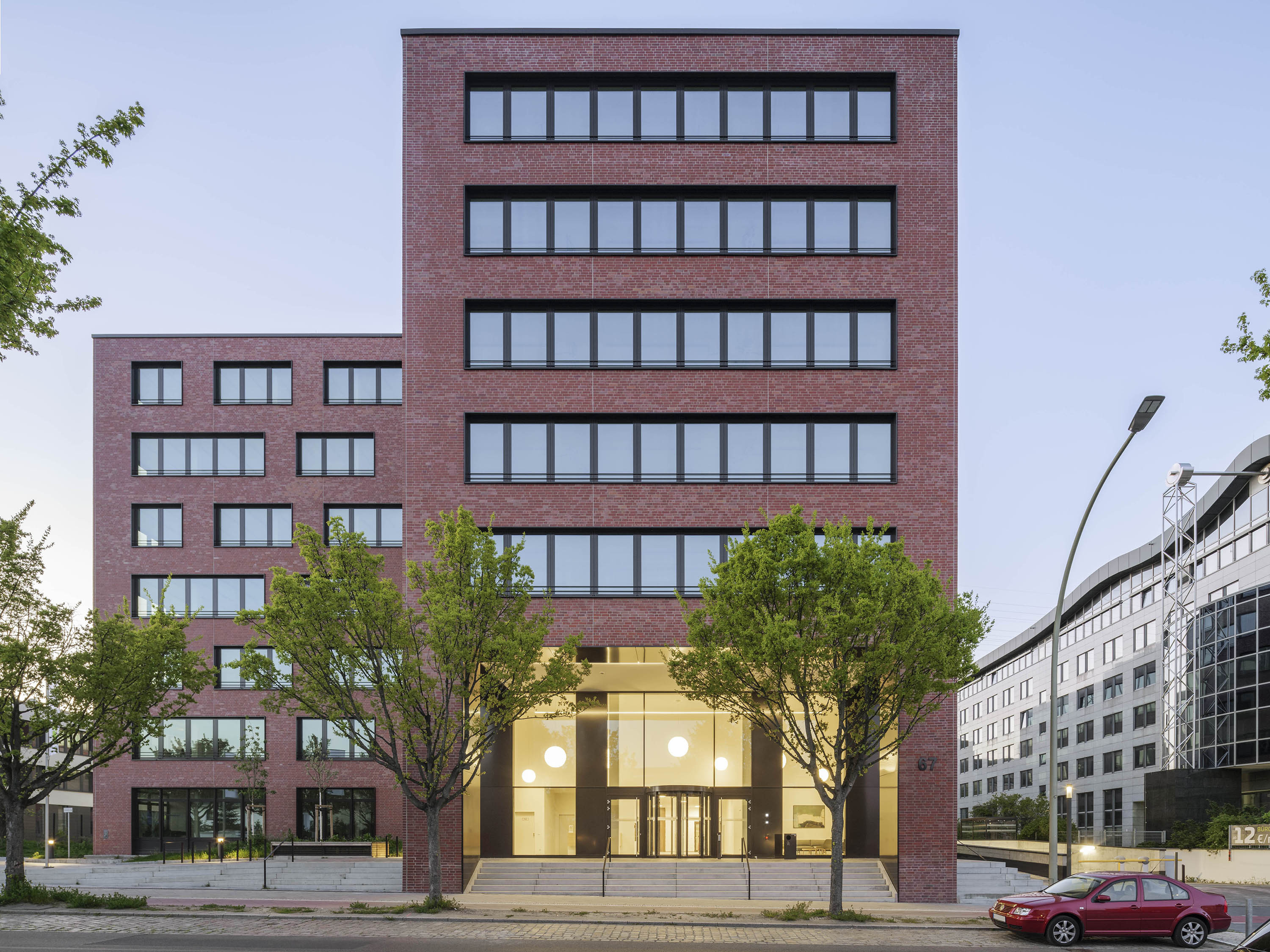 Das Gebäude ,,ALEX‘‘ besteht aus einem siebengeschossigen Riegel, von dem drei gleichhohe Querriegel in Richtung Westen abgehen. Die markante Fassade ist in rotem Backsteinausgeführt. Sie knüpft architektonisch an die historische Nachbarbebauung an und ist in Kubatur, Farbigkeit und Materialität eine Referenz an den Industriestandort Lichtenberg. Die Geschosse sind durch horizontale Fensterbänder gegliedert, die stellenweise unterbrochen sind und somit der Fassade eine abwechslungsreiche Optik verleihen.