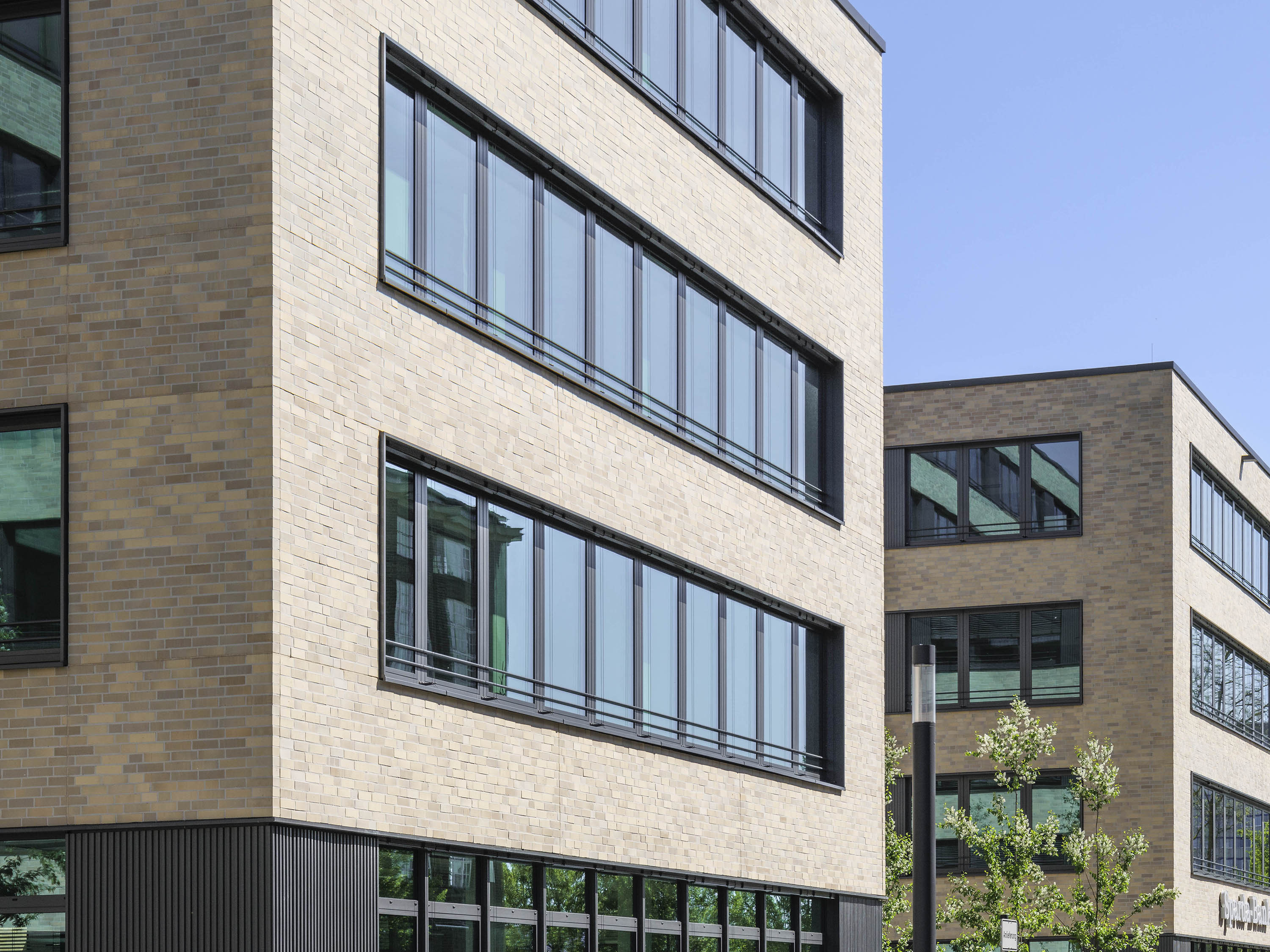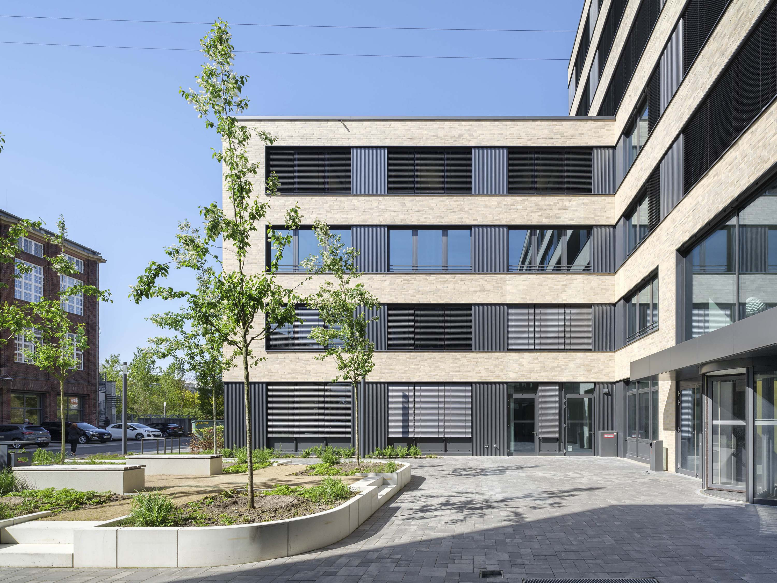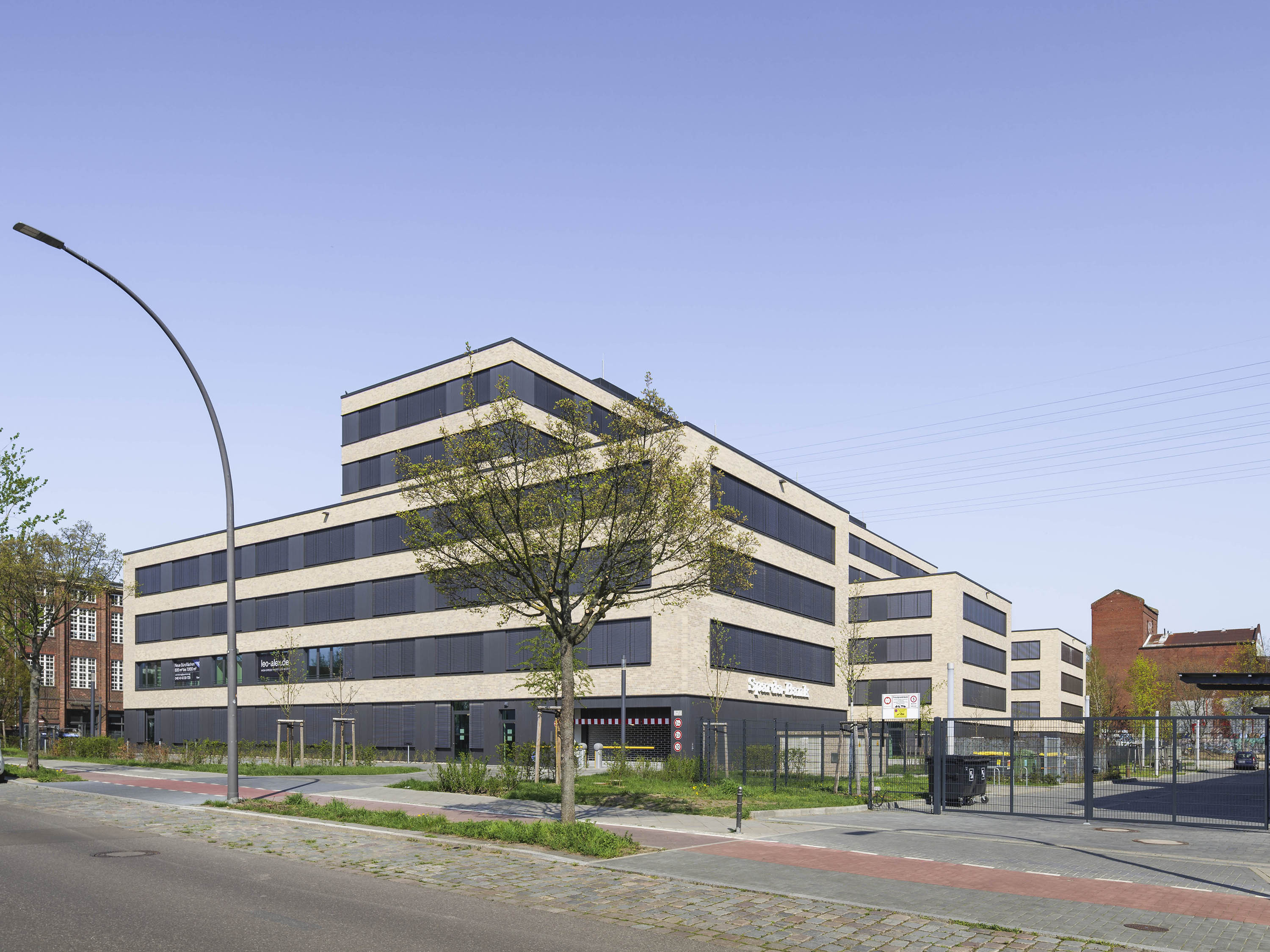 Die Kubatur des Gebäudes ,,LEO‘‘ besteht aus drei querstehenden, dreigeschossigen Riegeln, die ein siebengeschossiger Gebäudeteil in Längsrichtung verbindet. Die Mietbereiche sind flexibel ausgelegt, wodurch sowohl eine Zellenbüroaufteilung als auch eine Open-Space-Variante möglich ist. Die Außenfassade von Gebäude ,,LEO‘‘ wird durch eine grau-beige melierte Riemchenfassade gegliedert. Die Stützen zwischen den Fensterbändern wurden als reliefierte Blechverkleidung geplant.