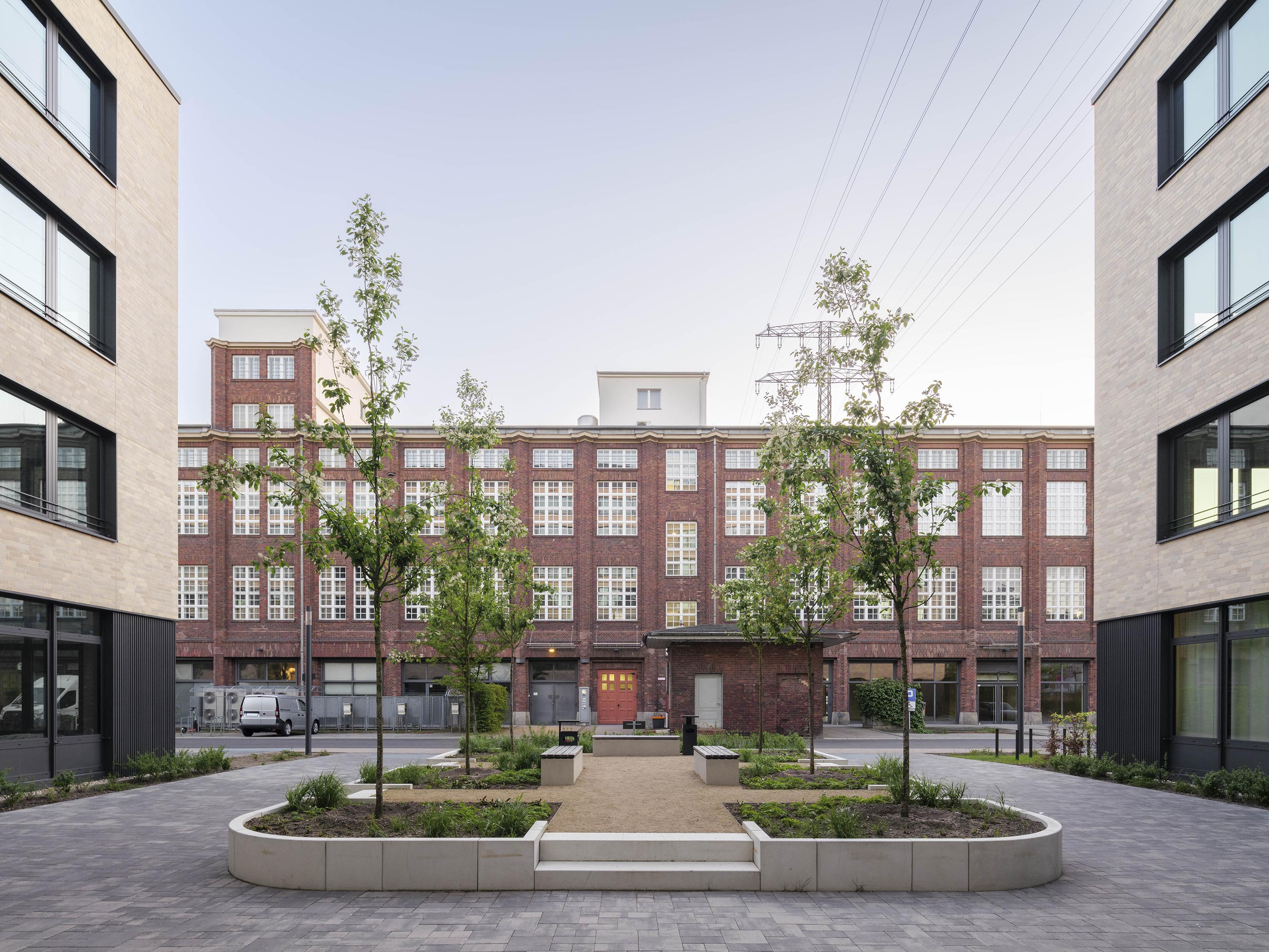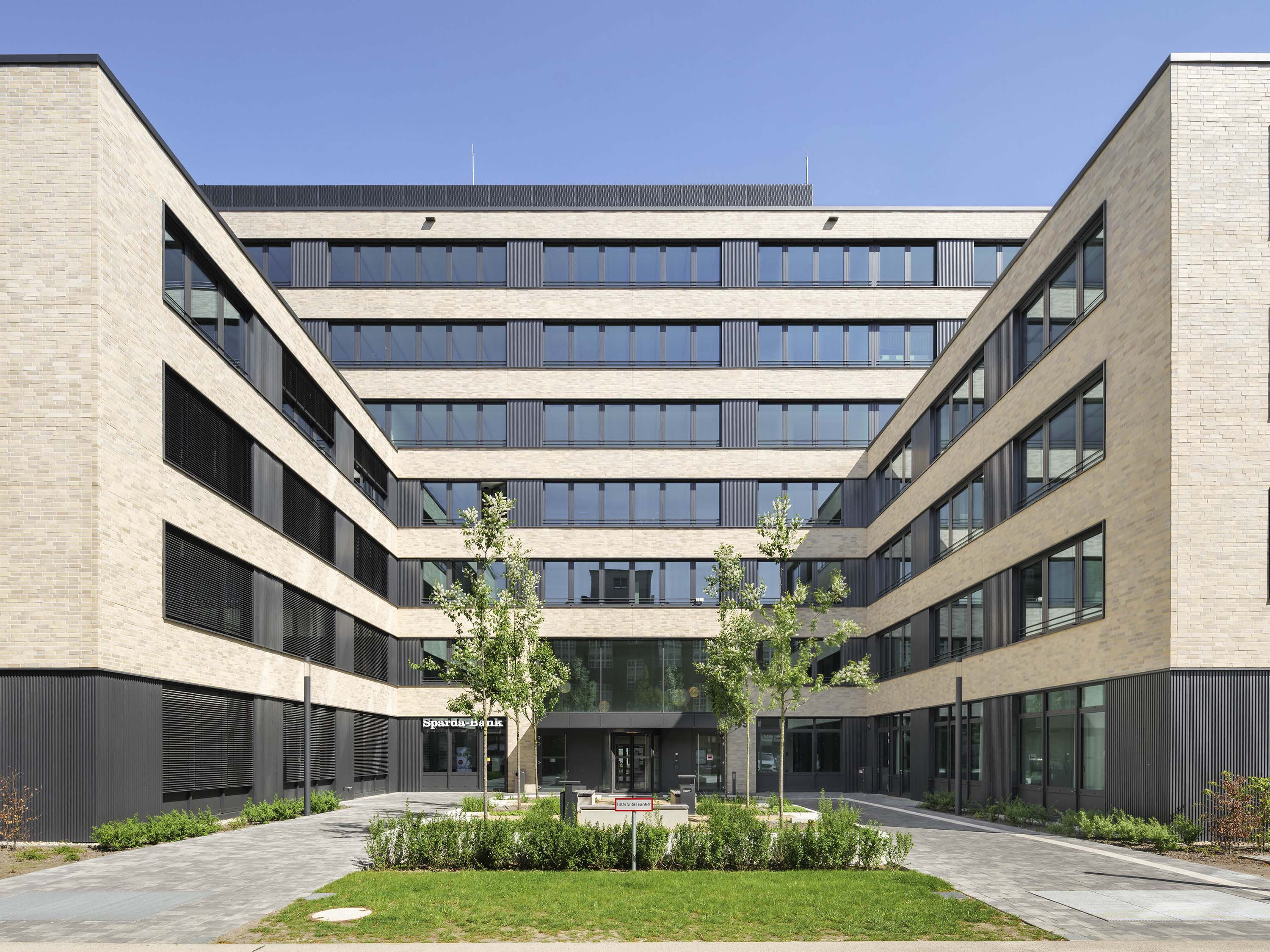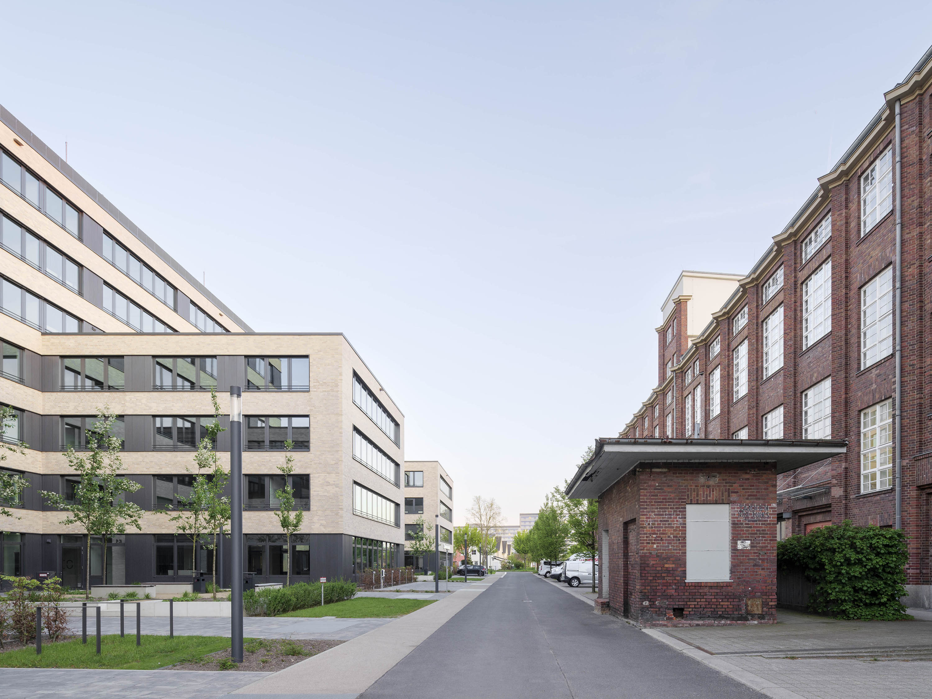 Die Kubatur des Gebäudes ,,LEO‘‘ besteht aus drei querstehenden, dreigeschossigen Riegeln, die ein siebengeschossiger Gebäudeteil in Längsrichtung verbindet. Die Mietbereiche sind flexibel ausgelegt, wodurch sowohl eine Zellenbüroaufteilung als auch eine Open-Space-Variante möglich ist. Die Außenfassade von Gebäude ,,LEO‘‘ wird durch eine grau-beige melierte Riemchenfassade gegliedert. Die Stützen zwischen den Fensterbändern wurden als reliefierte Blechverkleidung geplant.