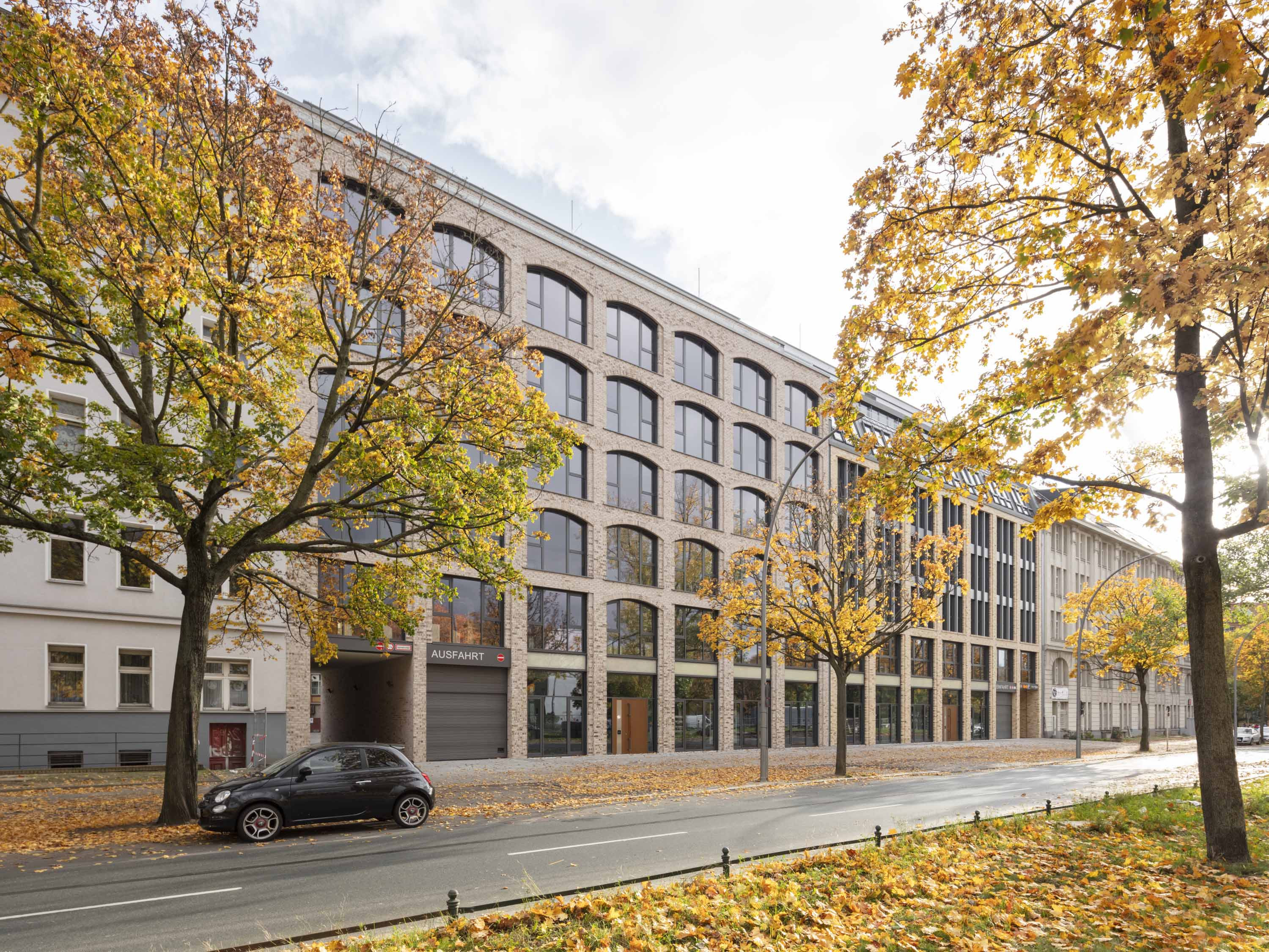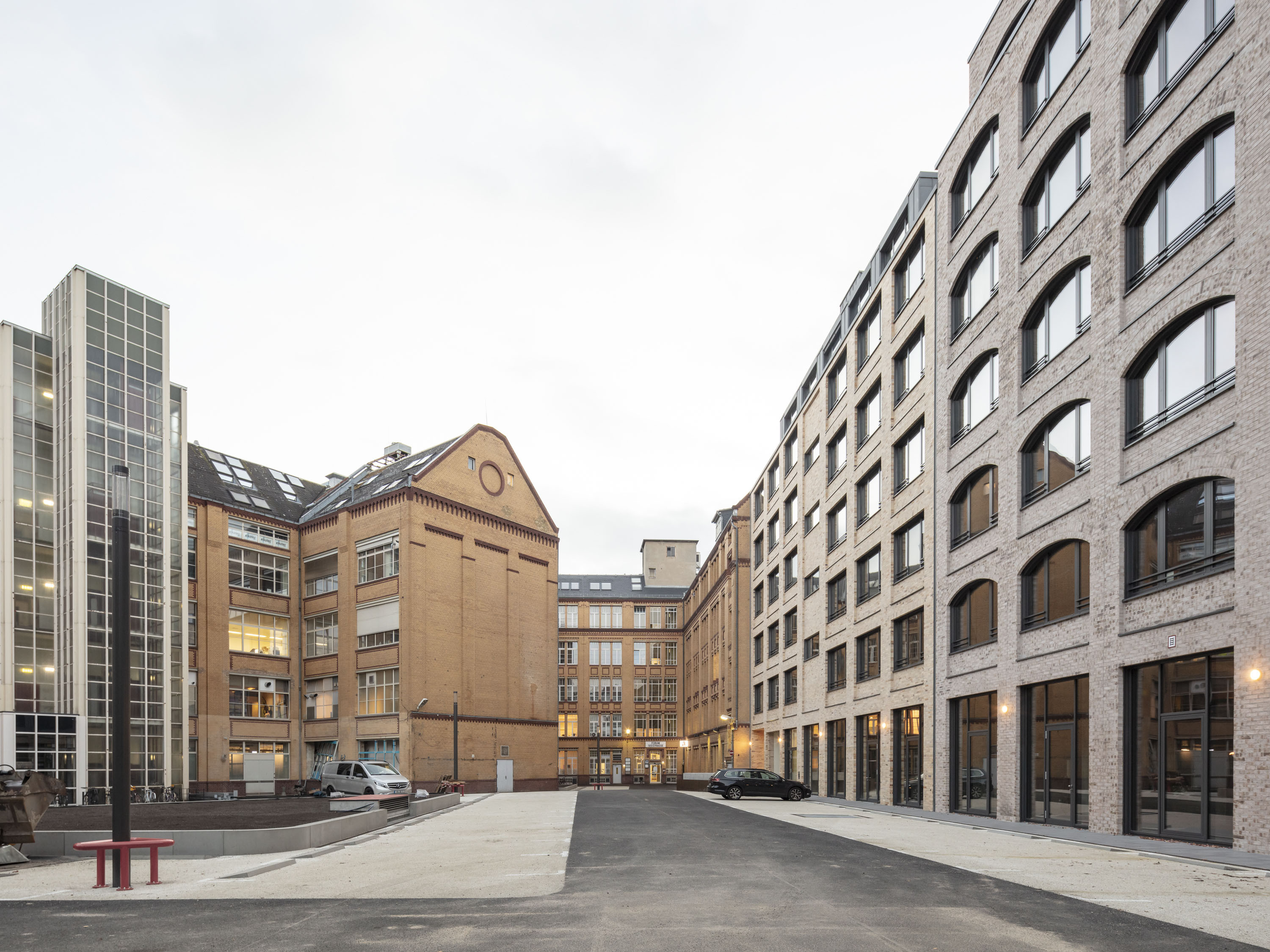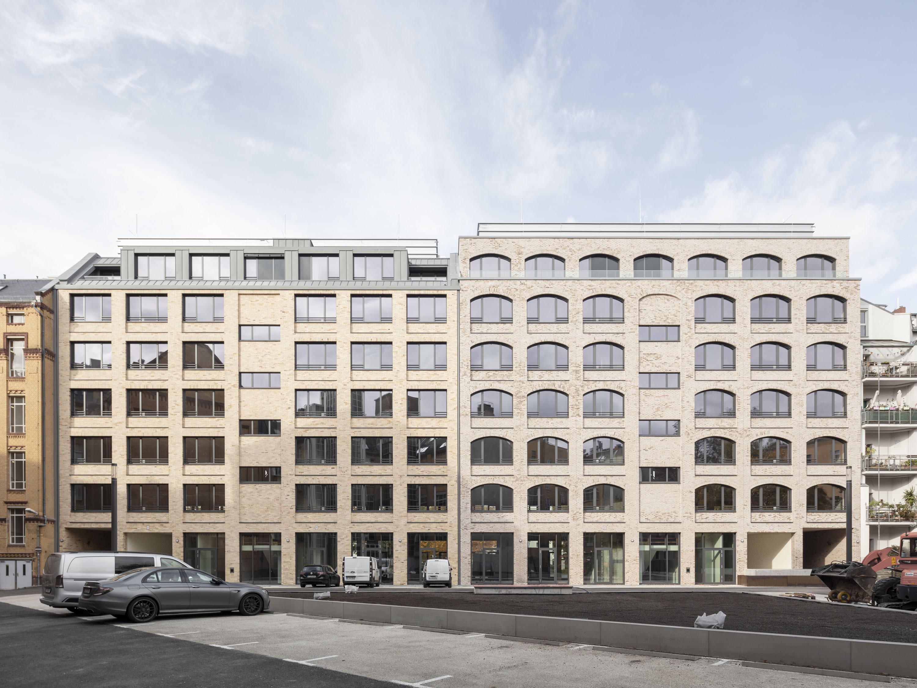 Das linke Gebäude besitzt ebenfalls einen doppelgeschossigen Sockelbereich, darüber allerdings ein Mittelbereich über vier Geschosse mit verglasten, großformatigen Fenstern in Segmentbögen als Referenz an die industrielle Frühmoderne. Dieser Gebäudeteil erhielt ein Staffelgeschoss mit einem Flachdach.