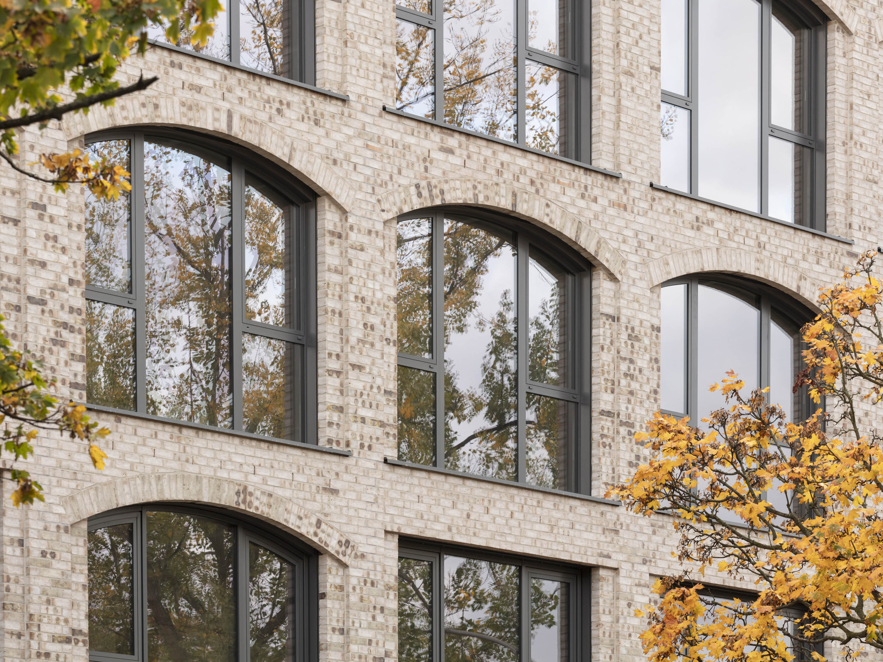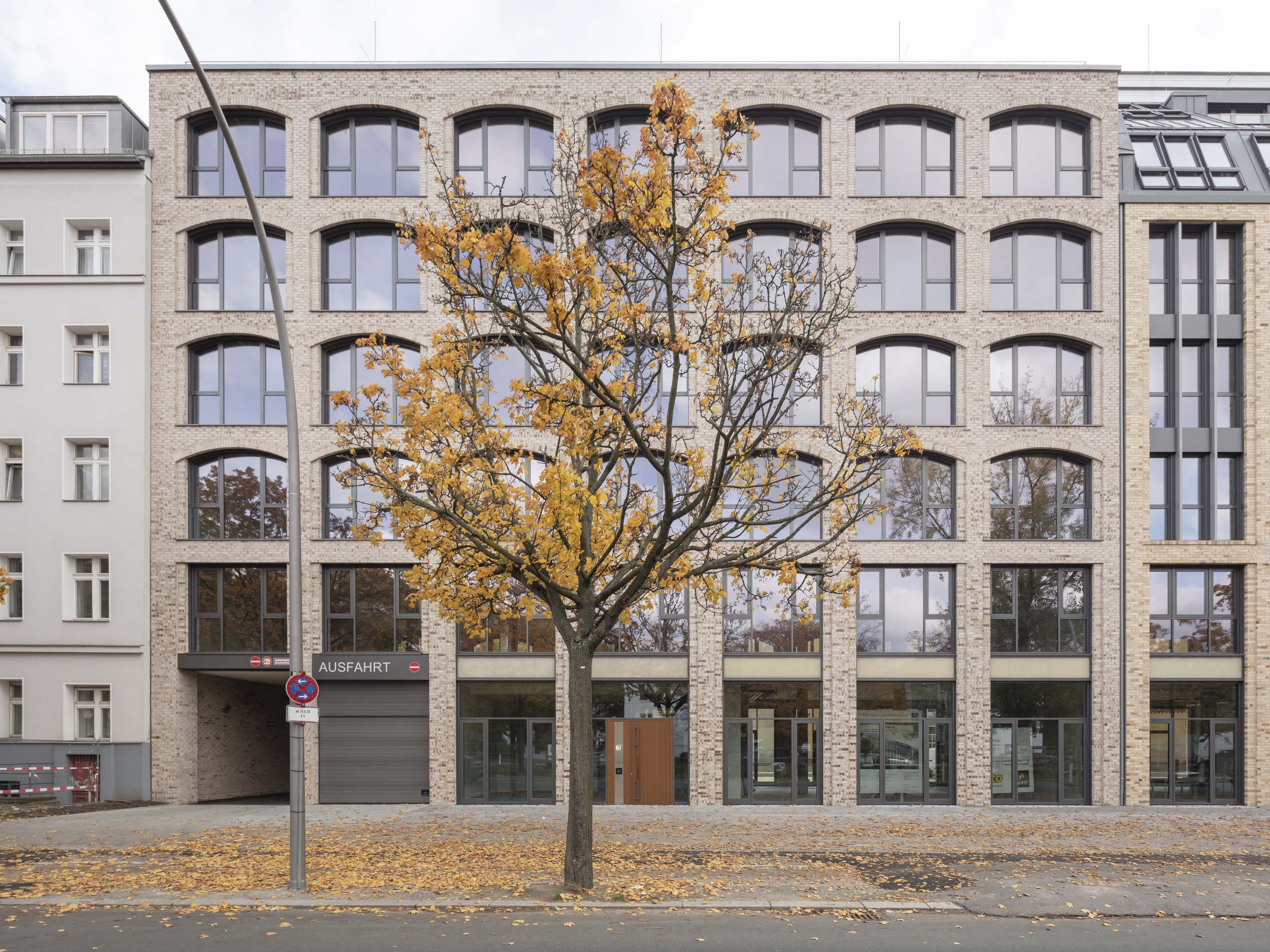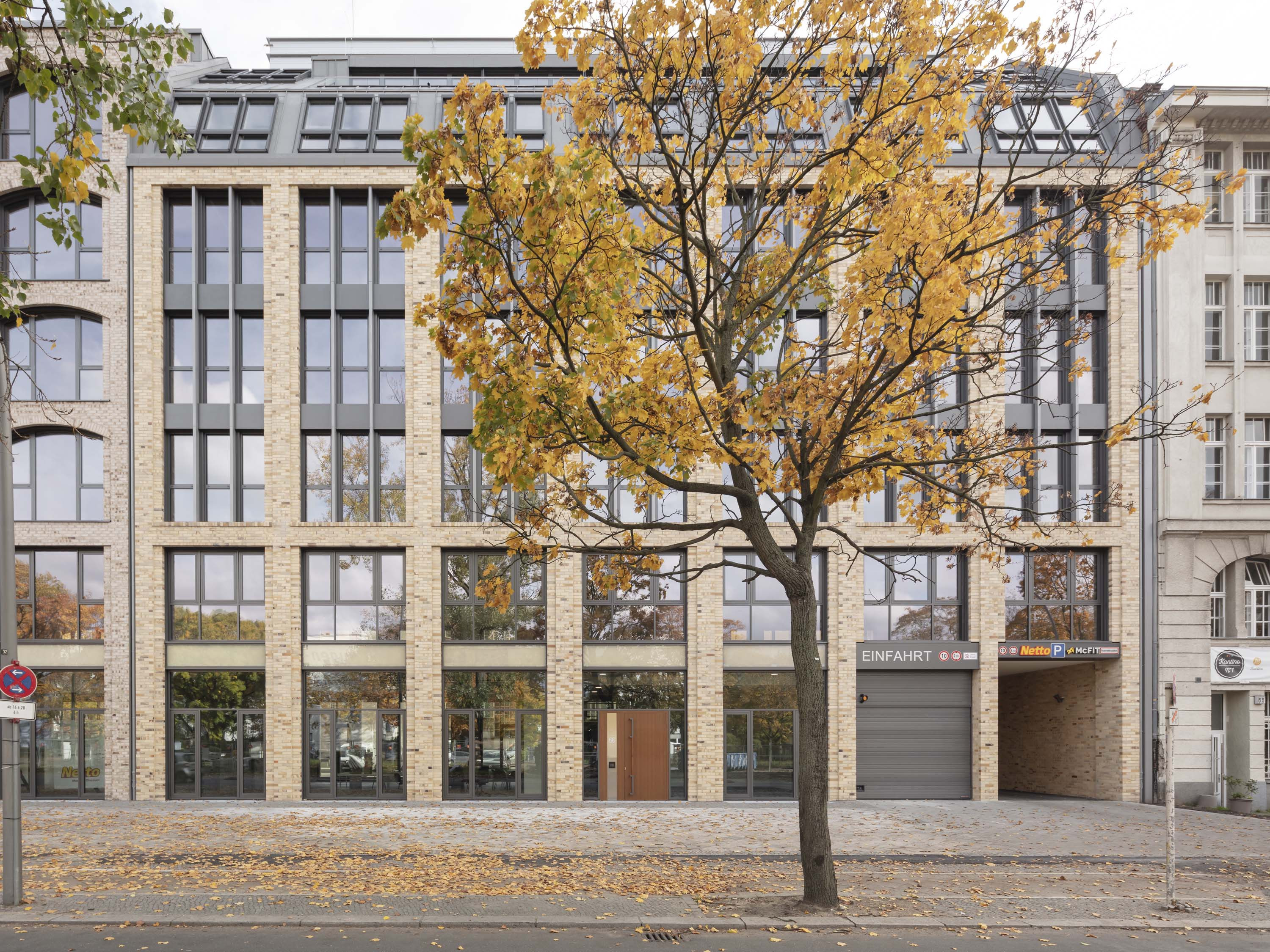 Das linke Gebäude besitzt ebenfalls einen doppelgeschossigen Sockelbereich, darüber allerdings ein Mittelbereich über vier Geschosse mit verglasten, großformatigen Fenstern in Segmentbögen als Referenz an die industrielle Frühmoderne. Dieser Gebäudeteil erhielt ein Staffelgeschoss mit einem Flachdach.