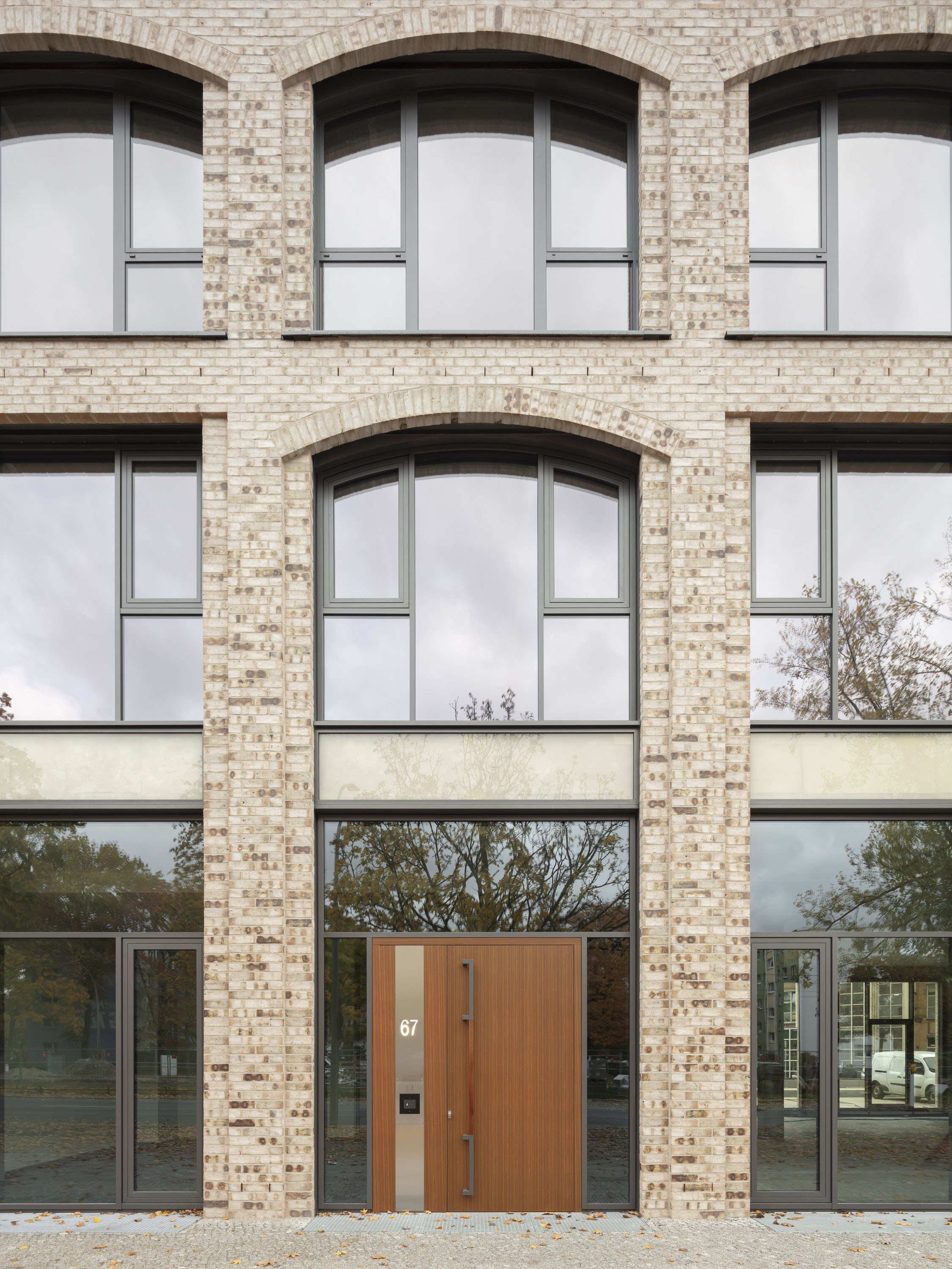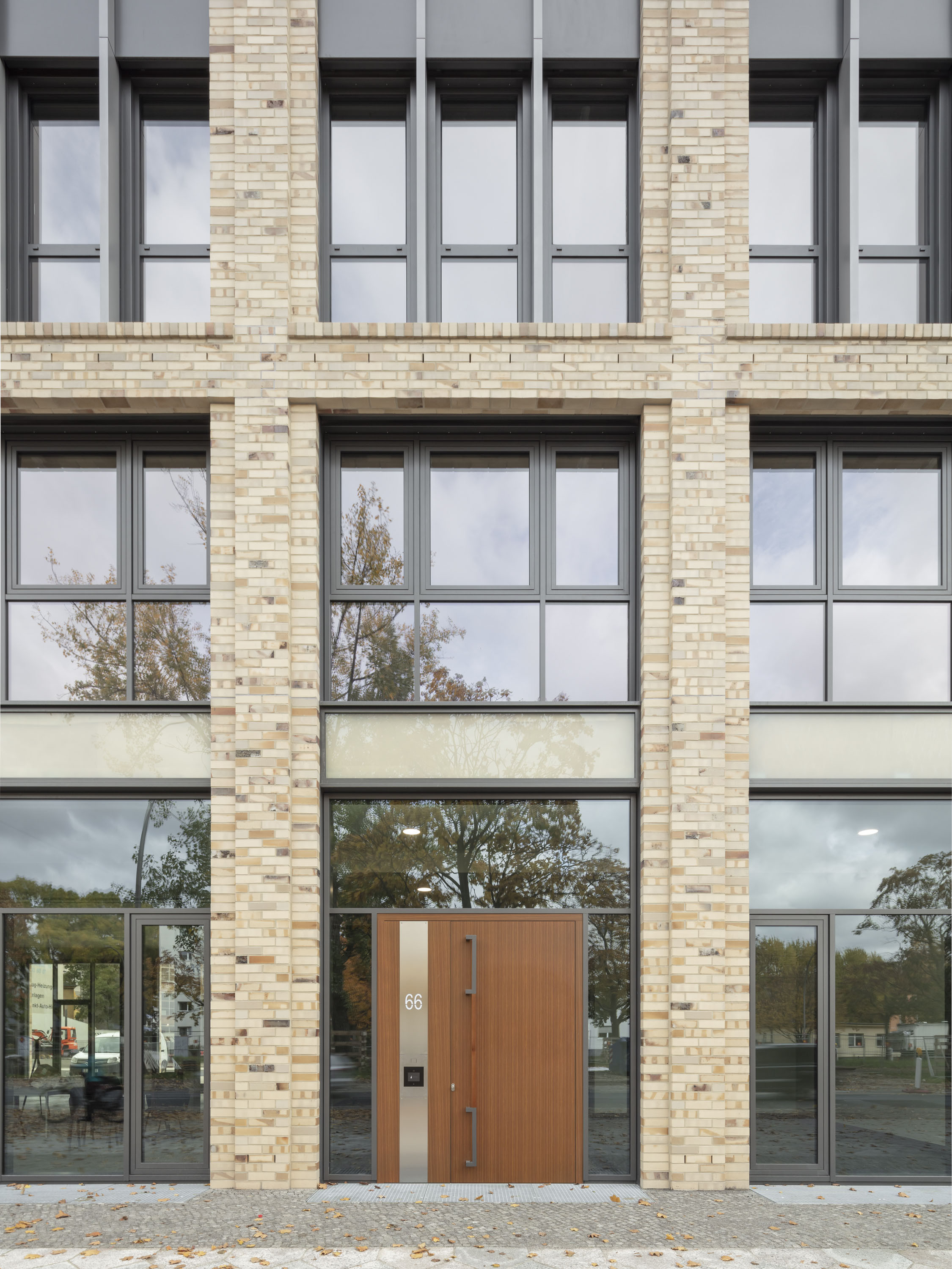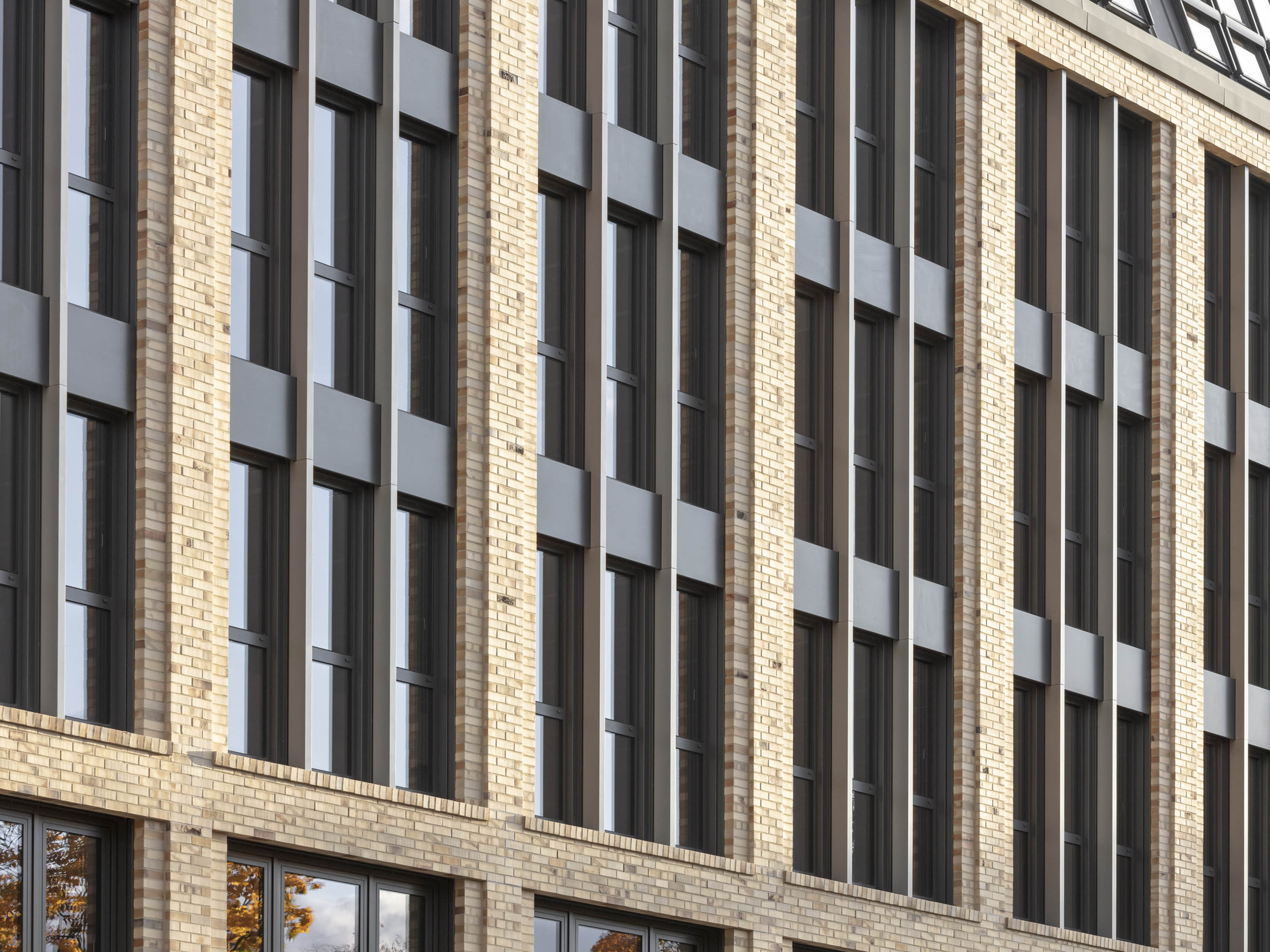 Die Normalgeschosse der Gebäudeteile erhielten unterschiedliche, beige-bunte Fassaden aus Klinkermauerwerk mit differenzierten Gliederungen. Der straßenseits rechte Bauteil wurde mit einer zweigeschossigen Sockelzone und einem dreigeschossigen, vertikal gegliederten Mittelbereich versehen, an die der wiederum zweigeschossige Dachbereich mit einem Titanzink-Schrägdach anschließt.