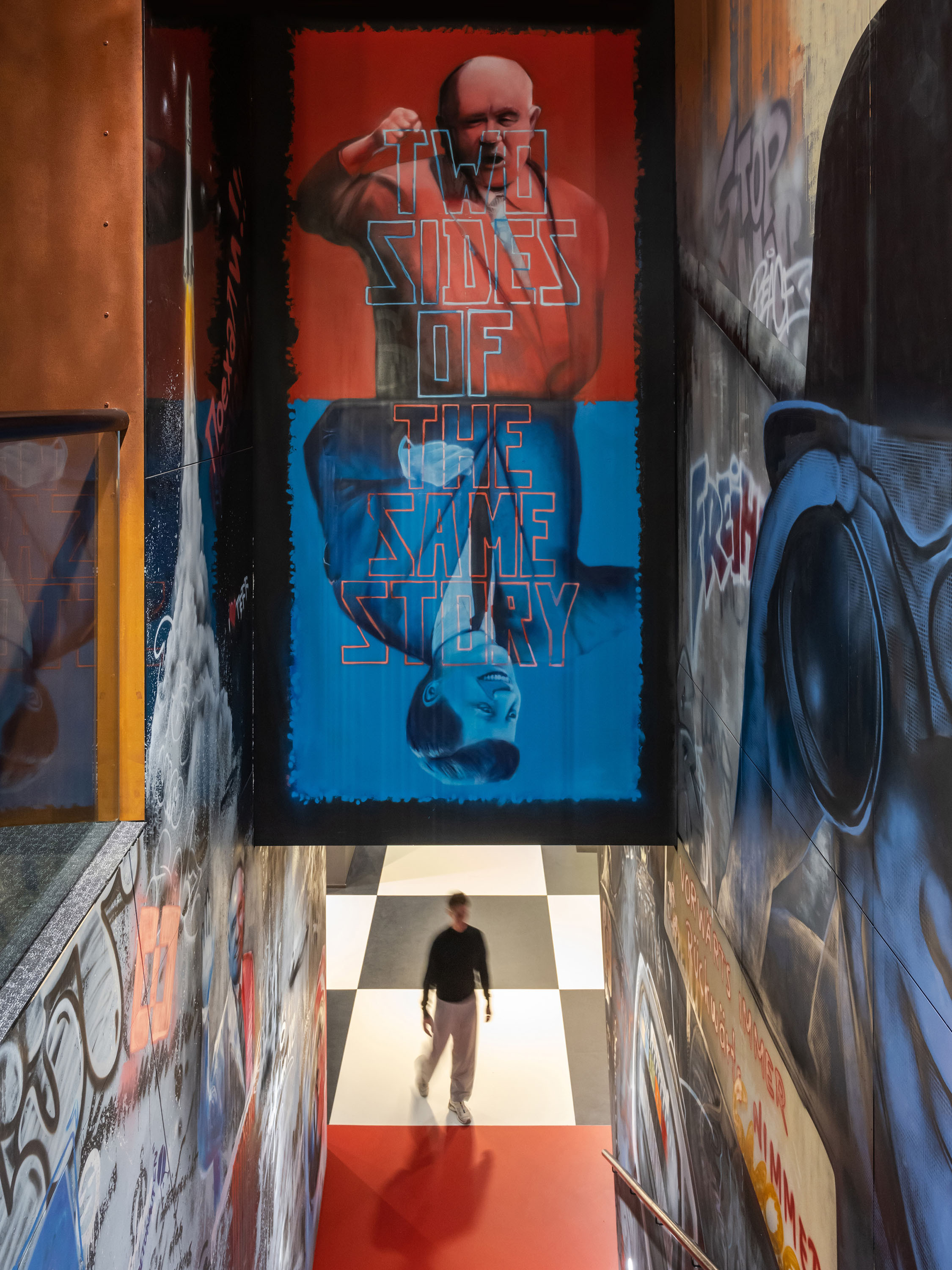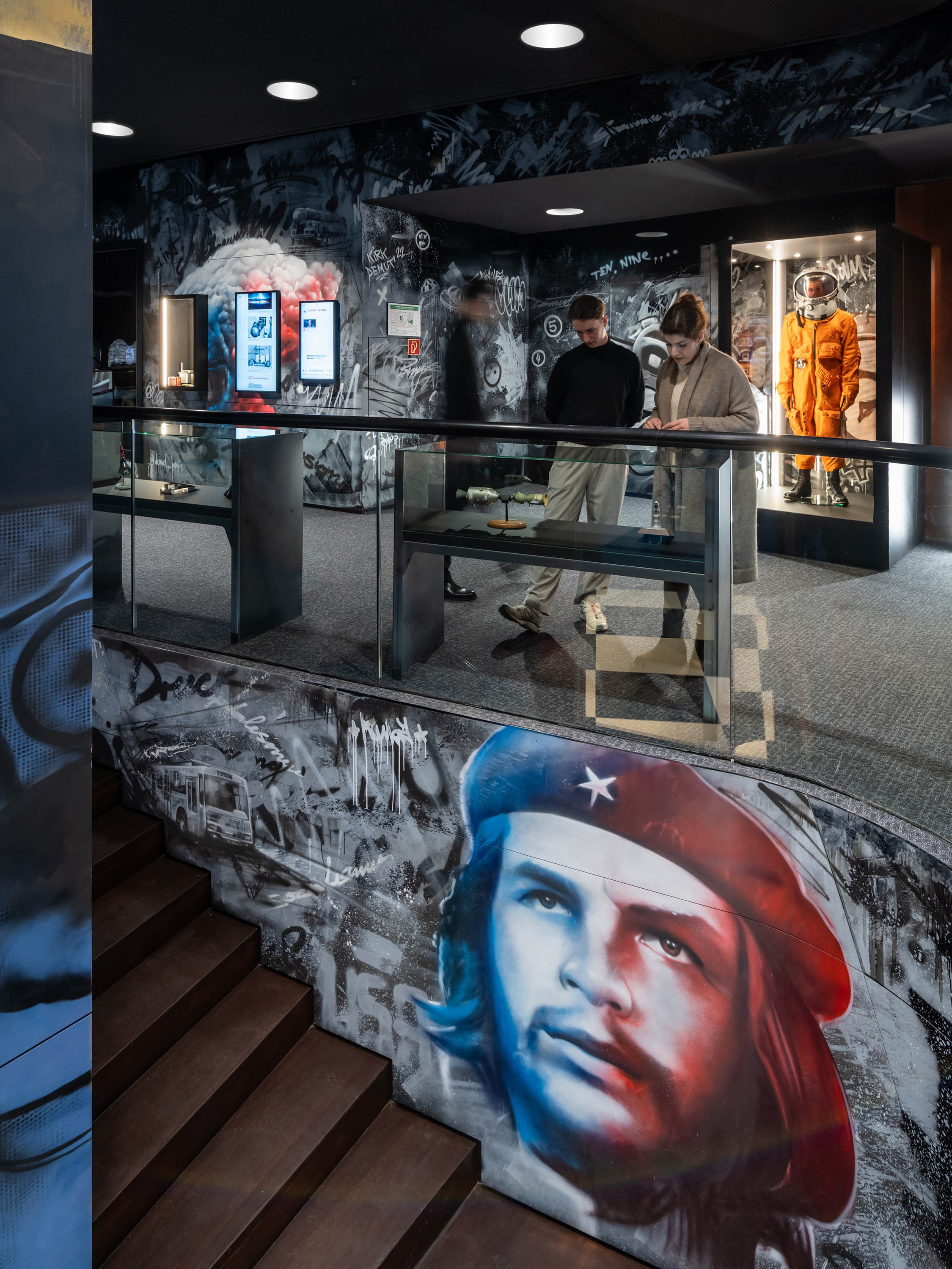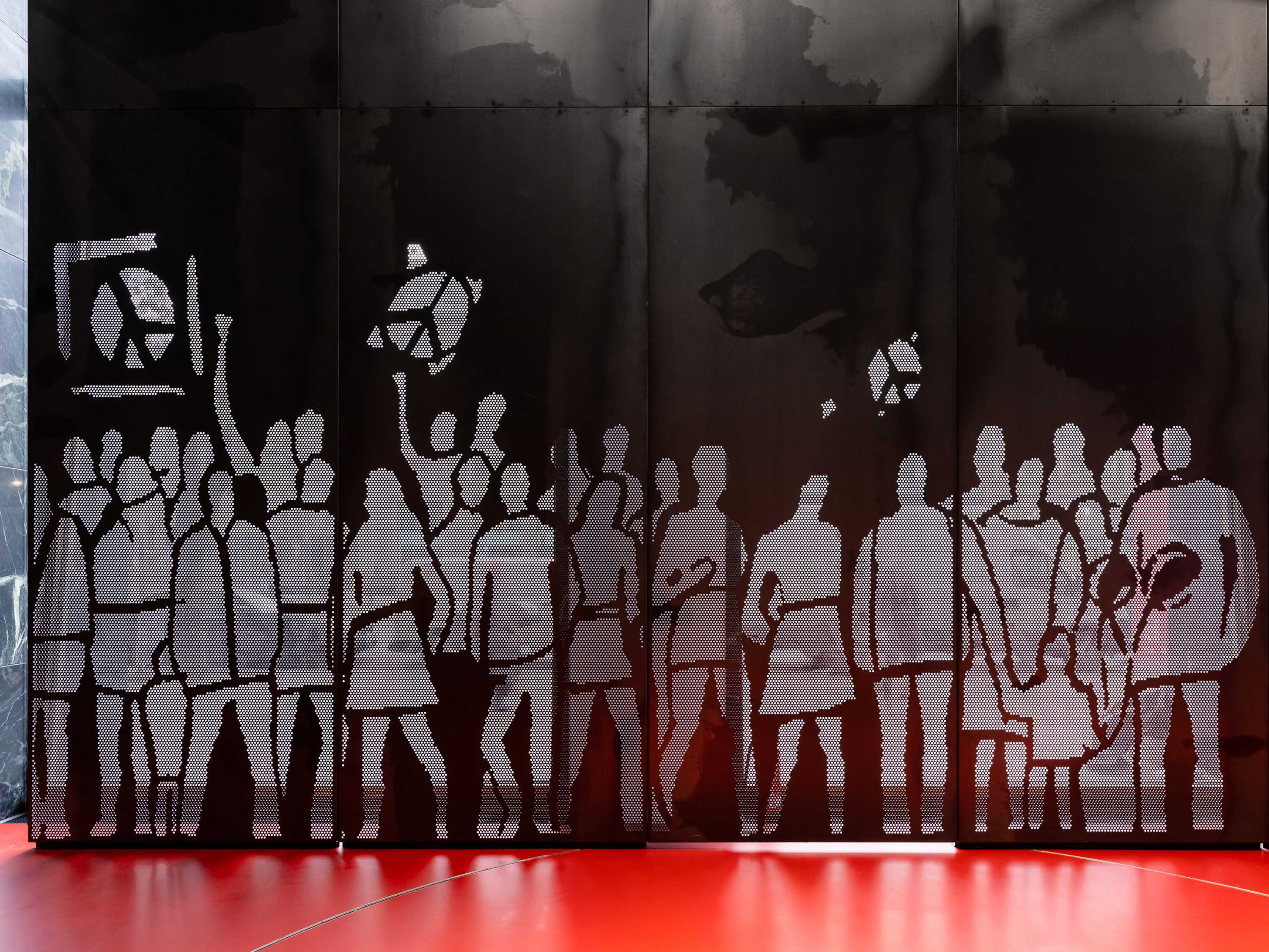 Um das Foyer des Museums zu betreten, durchschreiten die Besucherinnen und Besucher symbolisch einen „Eisernen Vorhang“ mit den Porträts einer Auswahl von Politikern, die die Zeit des Kalten Krieges mitgeprägt haben. Der Entwurf stammt von der ukrainischen Künstlerin Vanda Sakhatska.