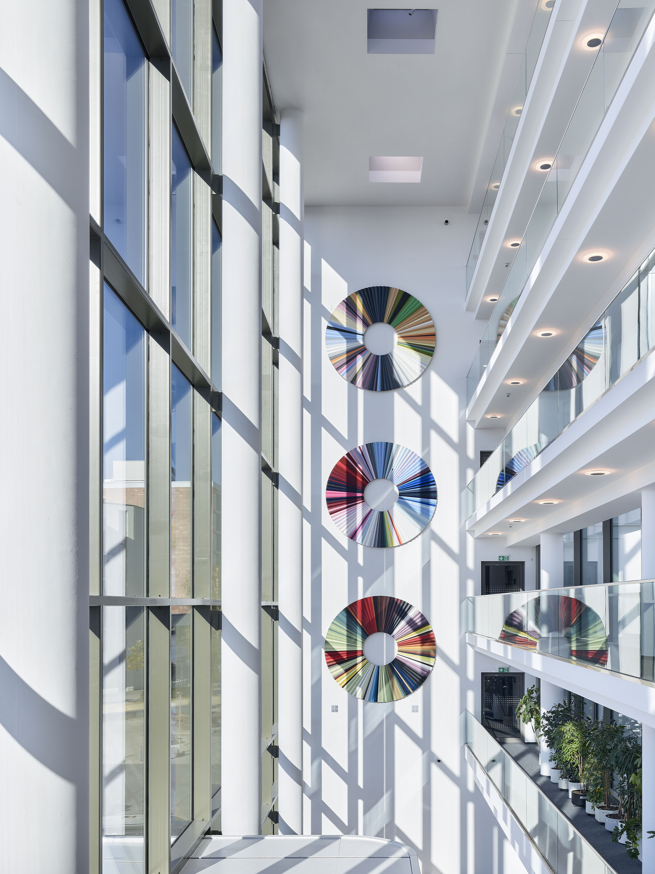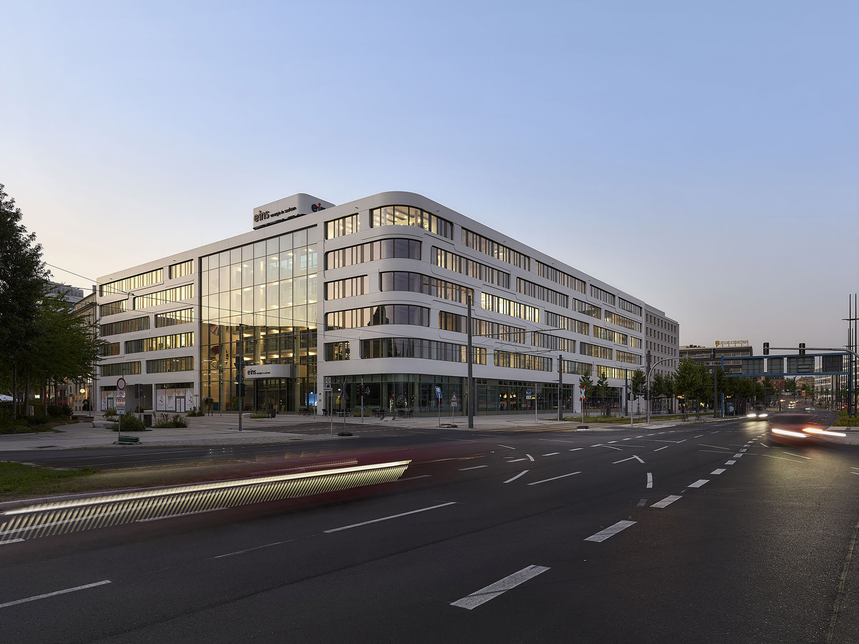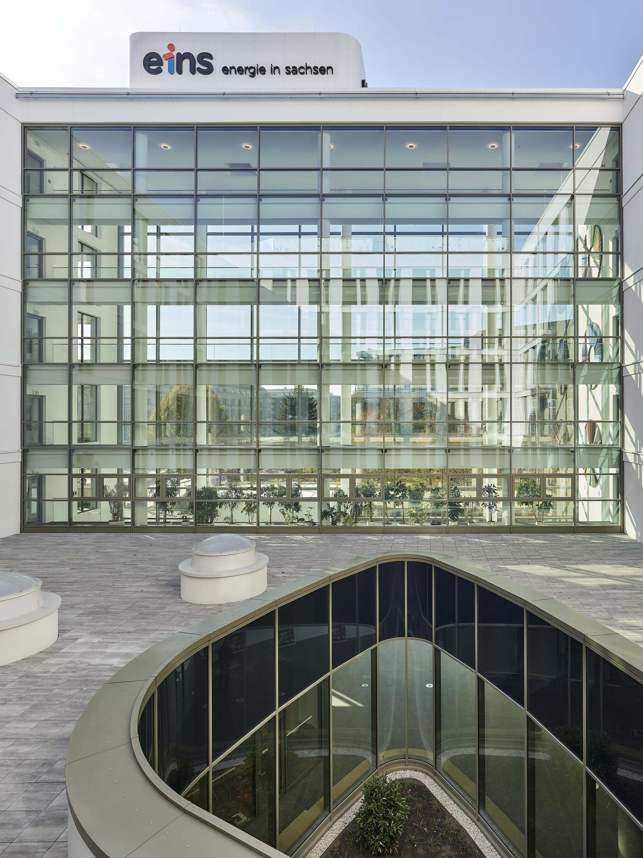 Das Volumen ist horizontal ausgerichtet: Panoramafenster ziehen sich, umrahmt von weißen, skulptural geformten Bandstrukturen, über die gesamte Fassade. Dabei interpretieren die Wellenmotive assoziativ die Gebäudenutzung und stehen für den Austausch, die Bewegung, den Energiefluss.