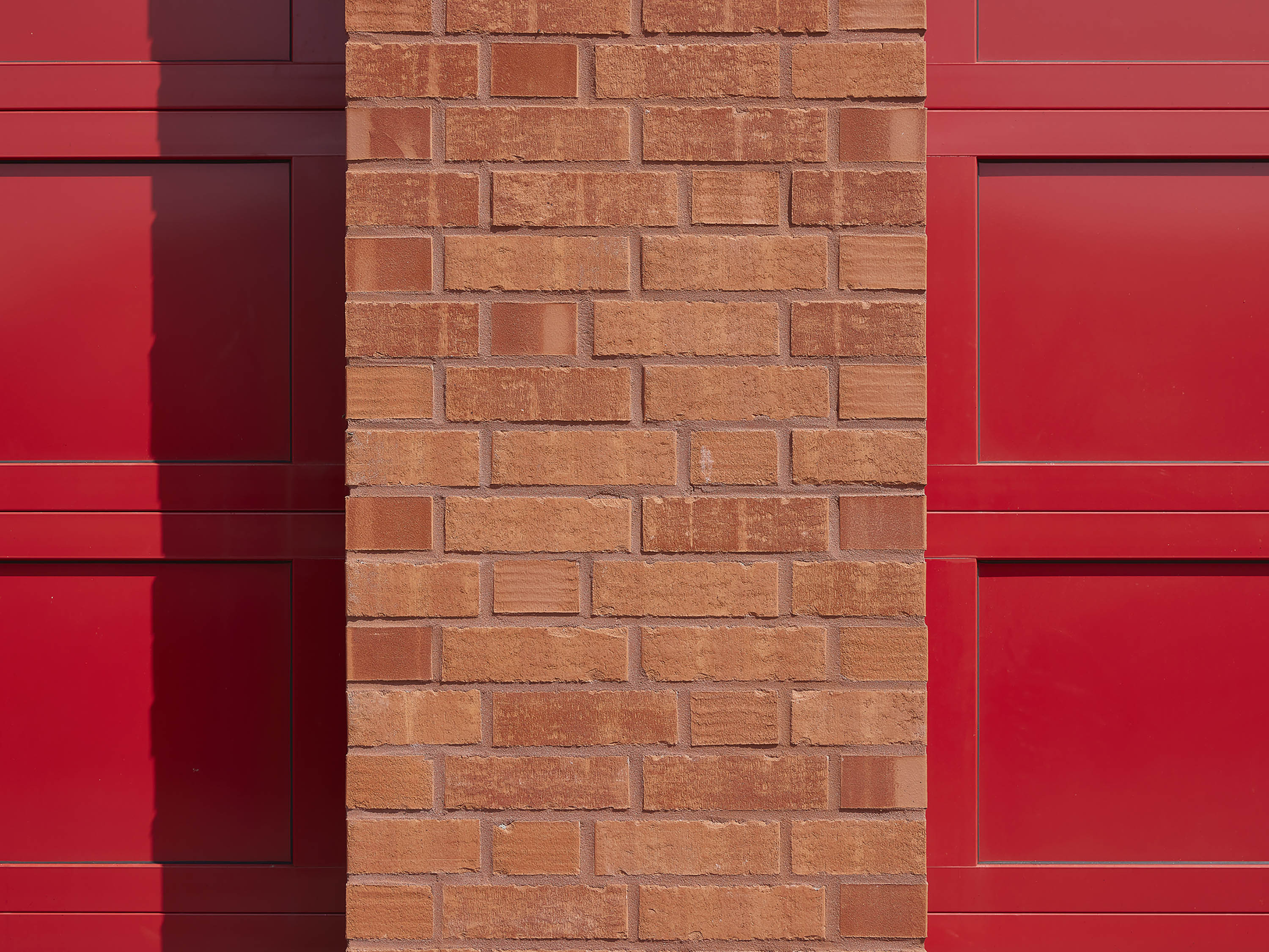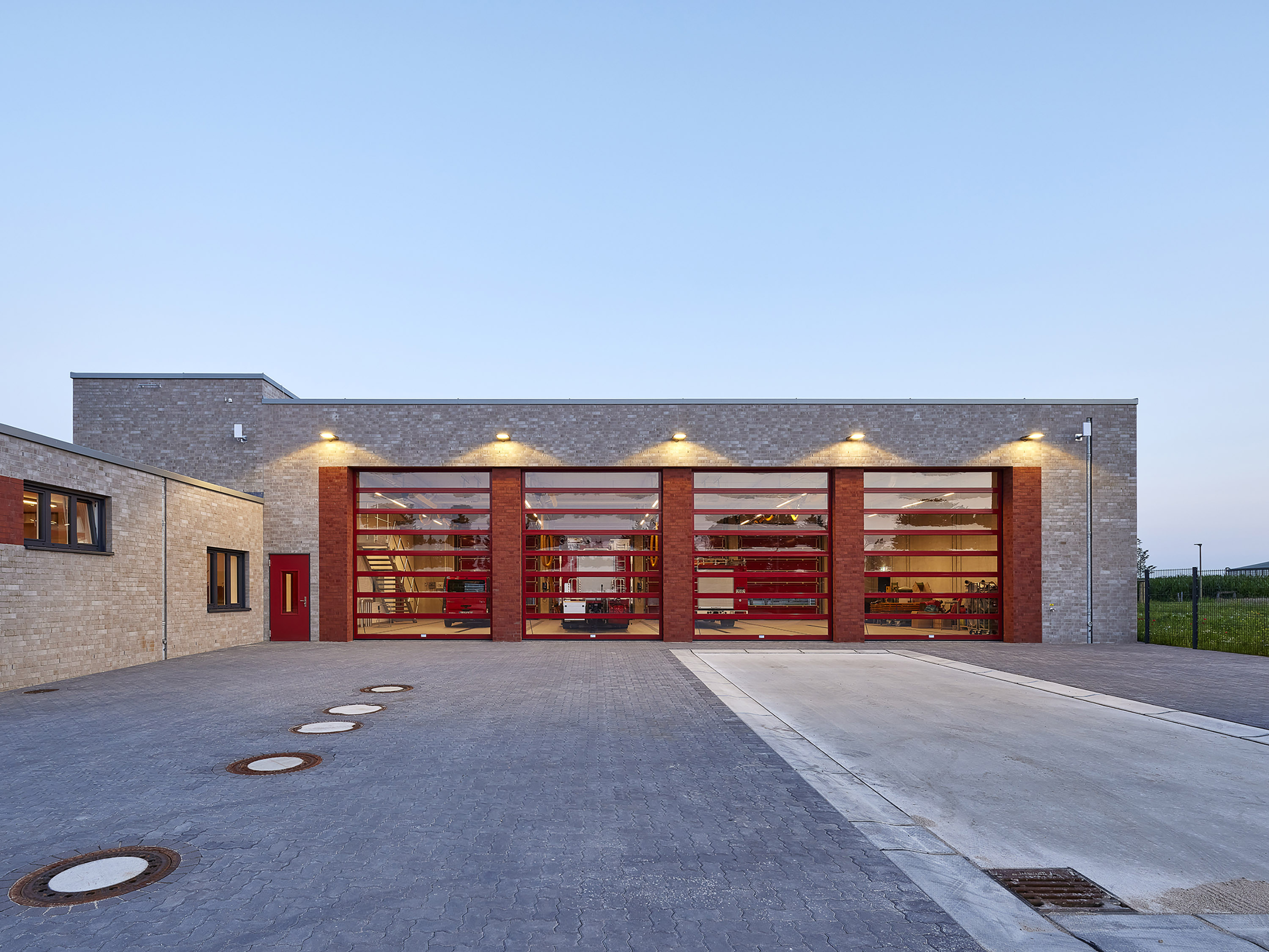 Für die Fassade wurden Klinker im Normalformat der Farbe aquaterra Salinagrau gewählt. Die wesentlichen Öffnungen des Gebäudes wie die Feuerwehrtore und der Haupteingang mit Schulung sowie der Alarmeingang wurden mit rotem Klinker eingefasst und zeigen einen metallisch roten Kern.
