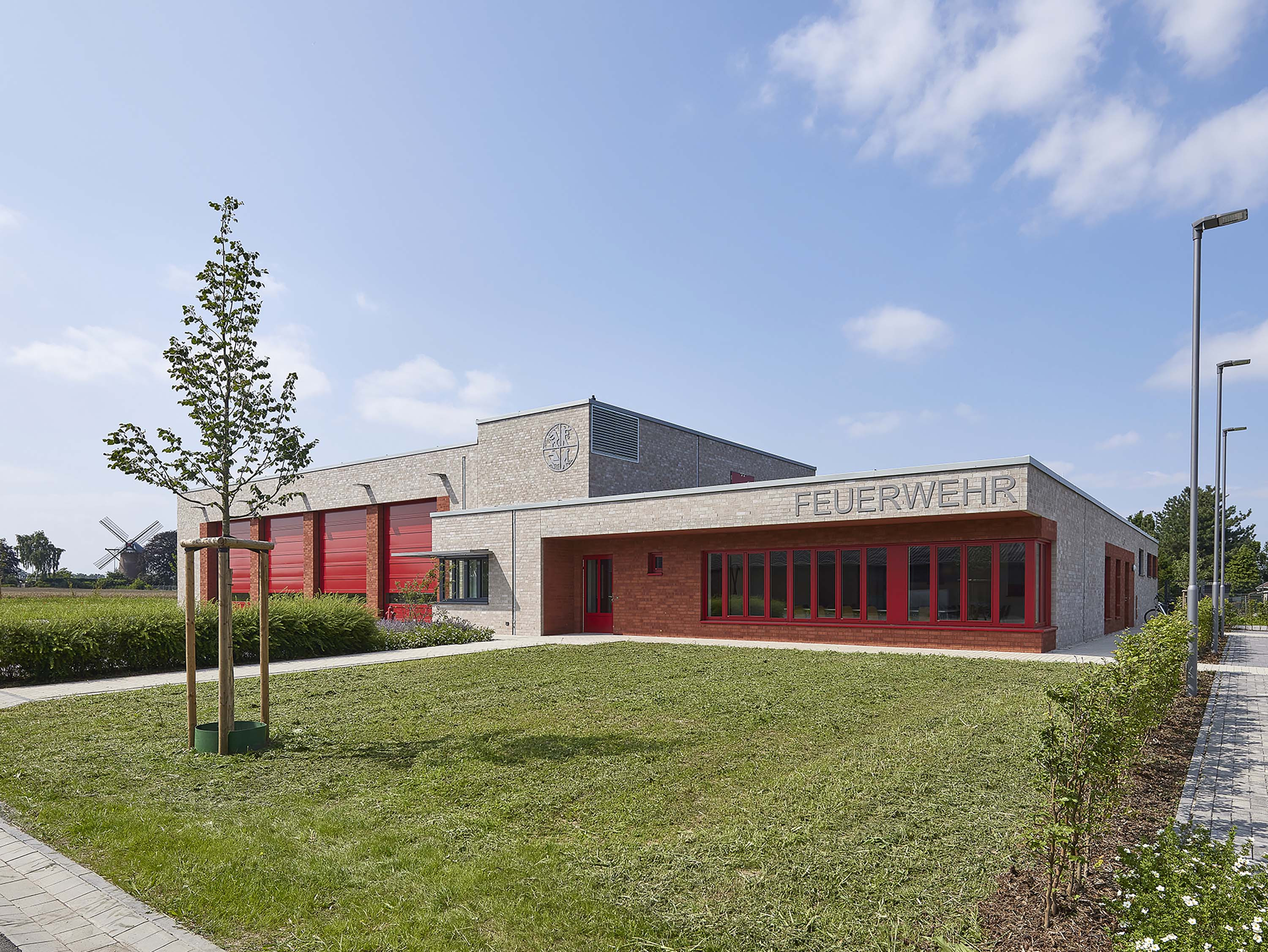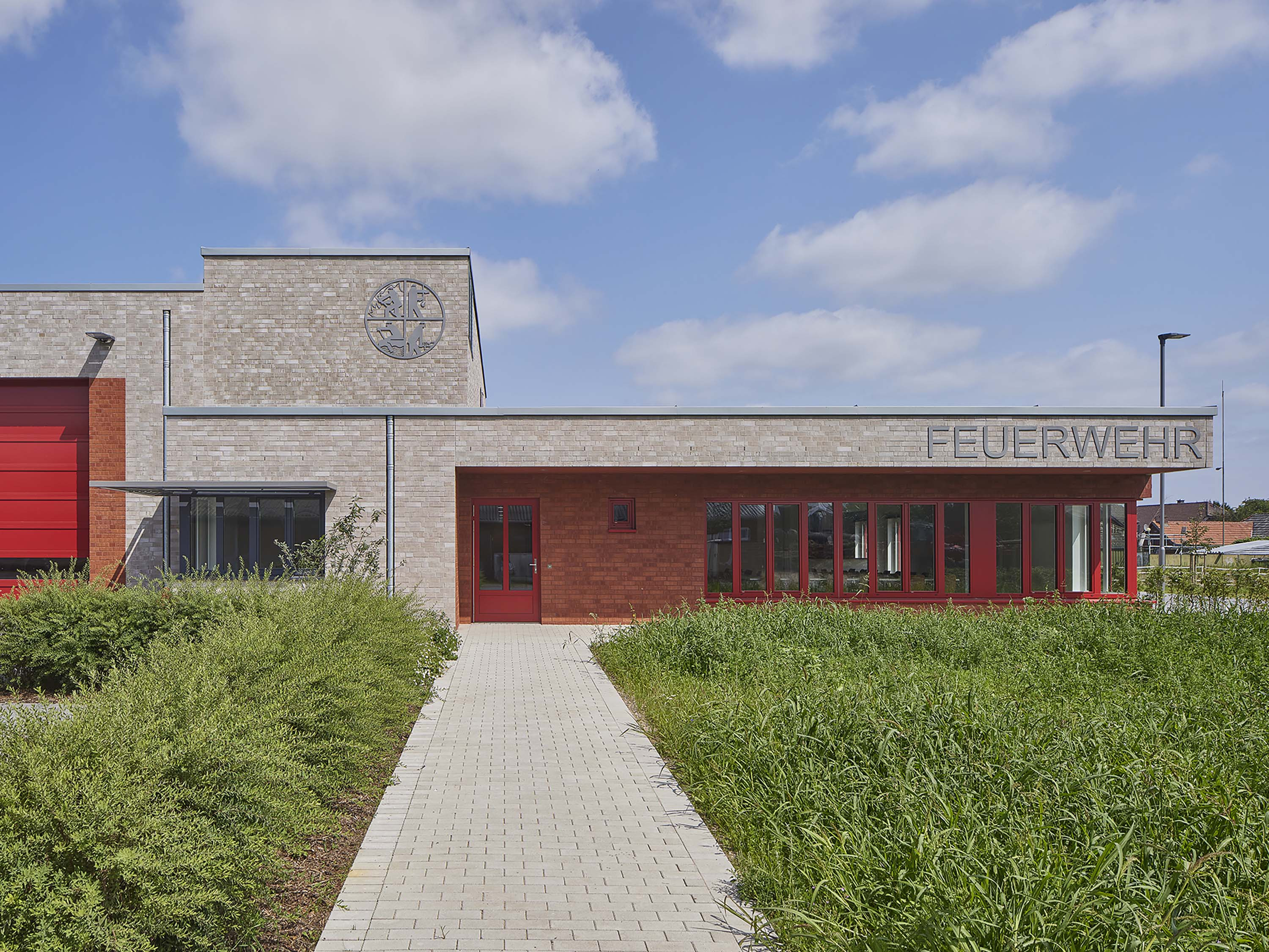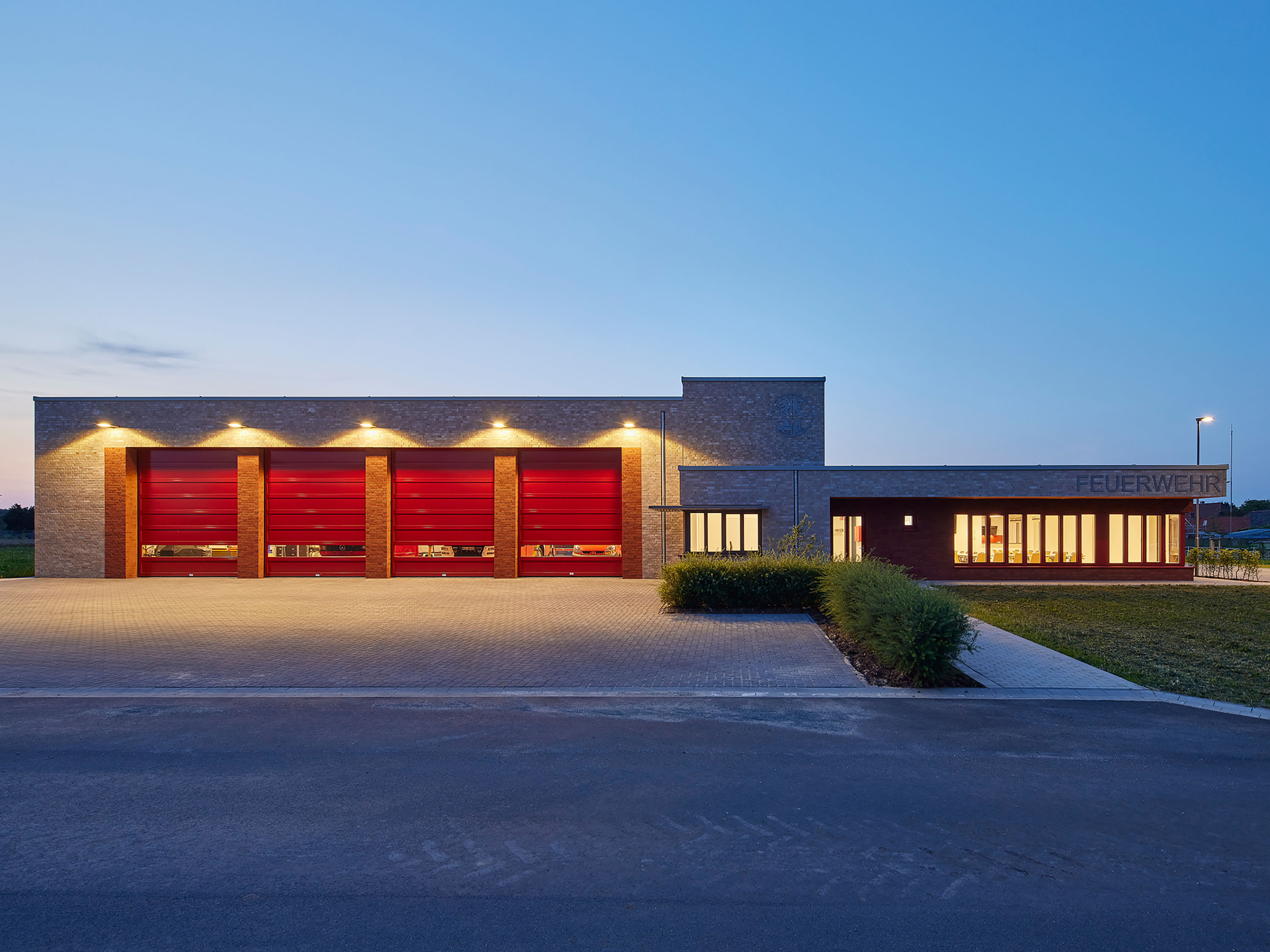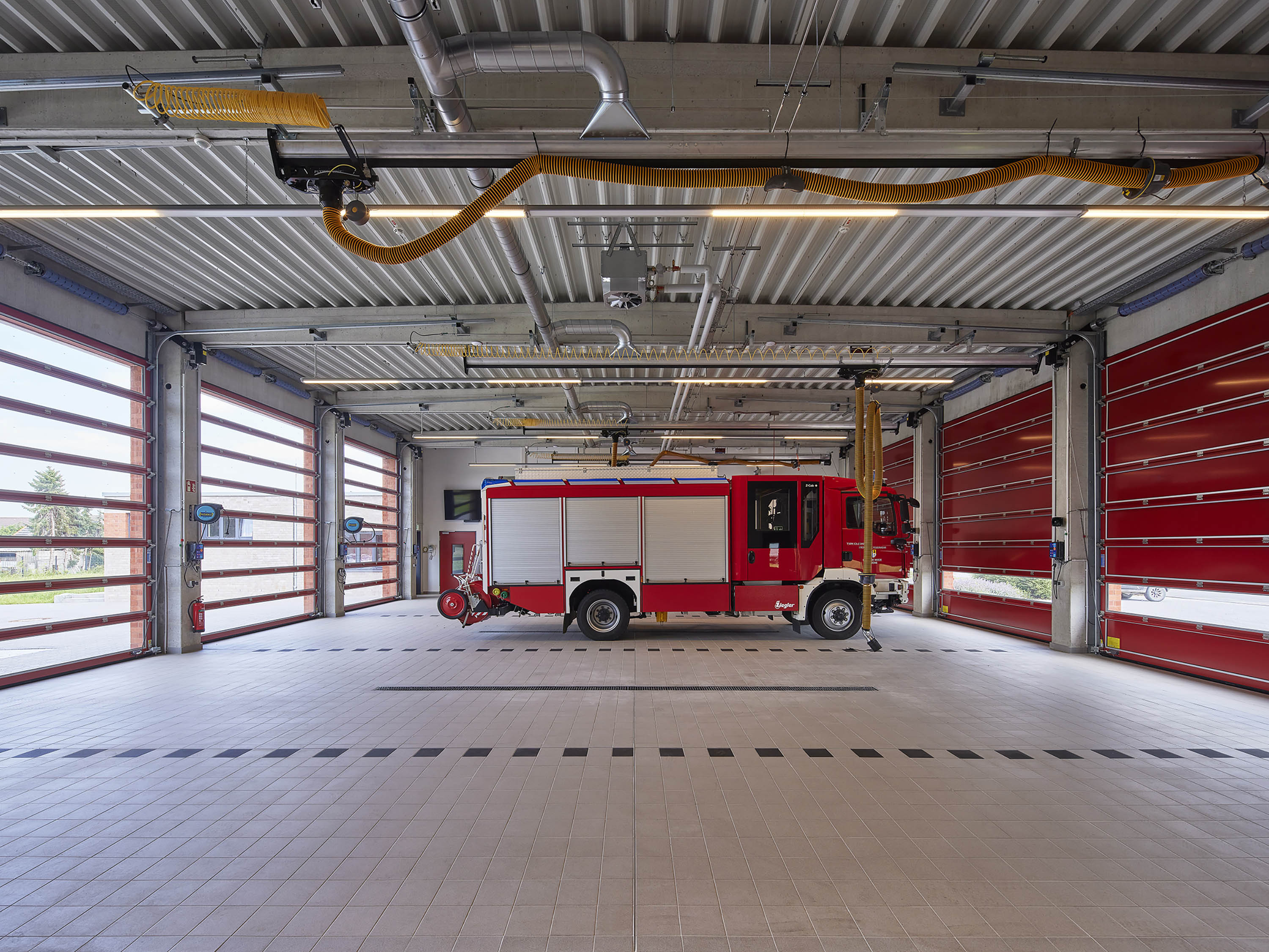 Die erste Kubatur des Gesamtgebäudes ist eine rund 320 m² große und 5,75 m hohe Halle für Feuerwehrfahrzeuge. Rechtwinklig schließt sich an diese das Feuerwehrhaupthaus an, ein Sozialtrakt mit Umkleiden und Schulungsraum. Eine Werkstatt und zusätzliche Lagerräume runden das Raumprogramm des Feuerwehrgerätehauses ab.