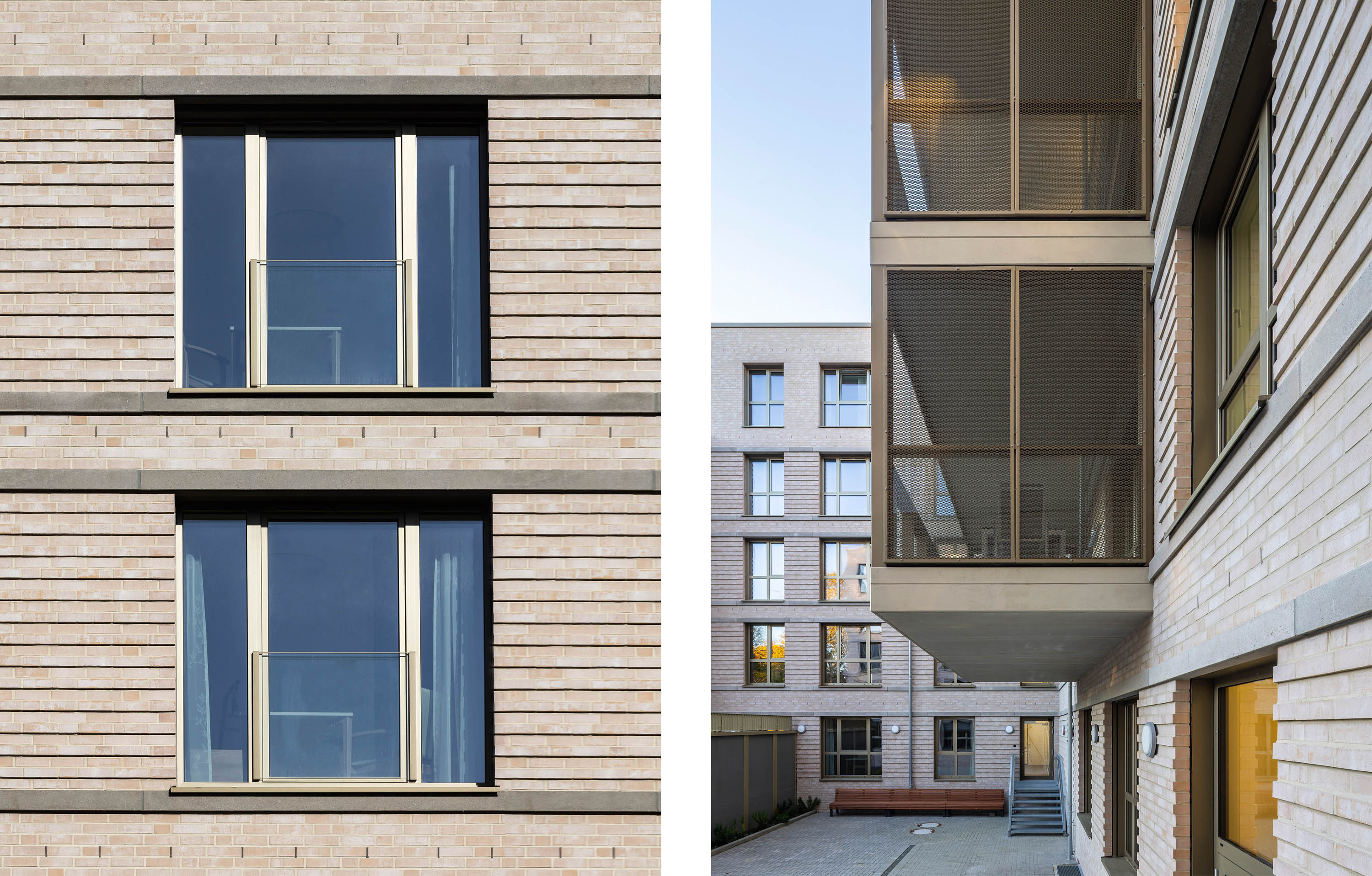 Wesentliches Material der Fassaden beider Gebäude ist ein hellbeiges und hell verfugtes Verblendmauerwerk mit feiner Farbnuancierung. Es wurde bewusst auf eine starke farbliche und materielle Differenzierung der beiden Gebäude verzichtet, um den Zusammenhalt und die Ablesbarkeit der Gebäudekubaturen zu stärken. Kleine, auf den zweiten Blick erkennbare Differenzierungen der Detaillösungen sorgen für eine stärkere Lebendigkeit und Vielfalt des Ensembles.