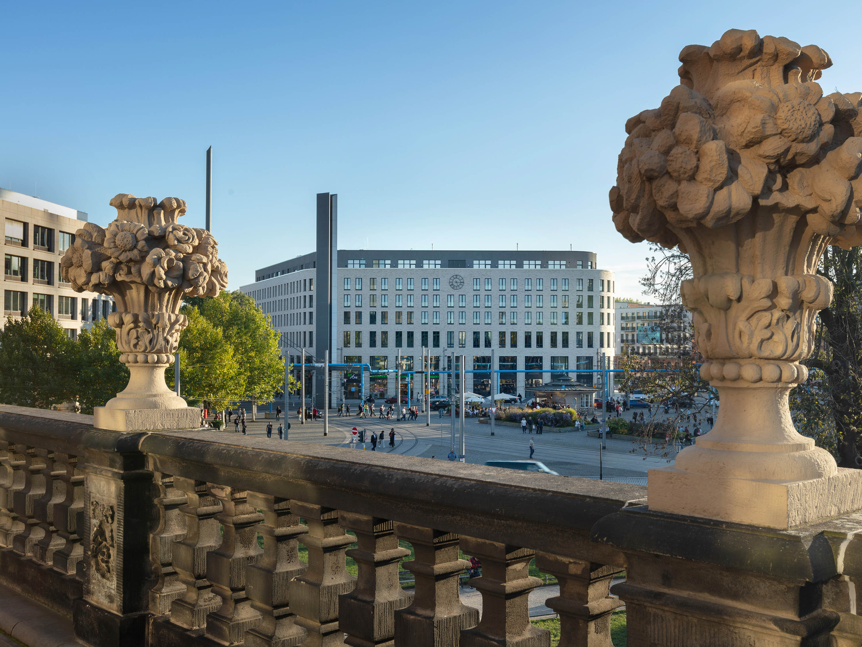 Der Platz gilt als zentraler Verkehrsknotenpunkt und Mittelpunkt des urbanen Lebens der sächsischen Landeshauptstadt. Anstelle der in den 1940ern zerstörten Postdirektion eröffnet das Büro-, Wohn- und Geschäftsgebäude Haus Postplatz ein neues Kapitel in der Dresdner Stadtgeschichte, nicht jedoch ohne Bezug auf die Historie und den Genius loci zu nehmen: Die Mittelachse des Neubaus wird in Richtung Postplatz wie bereits in der Gründerzeit von einer Uhr bekrönt.