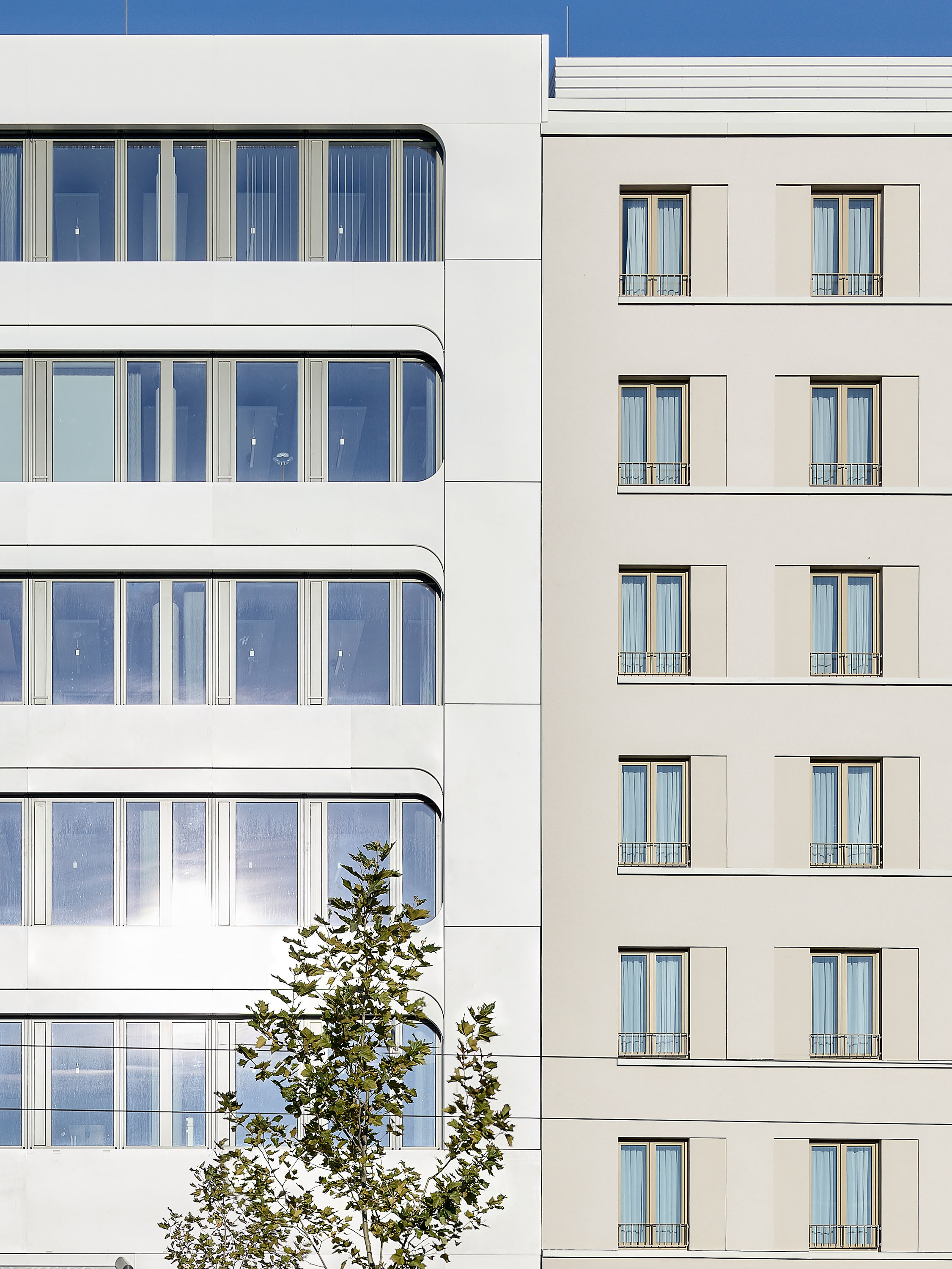 Die Fassade des Gebäudes wurde im Erdgeschoss mit einer Verkleidung aus Naturstein versehen und erhielt in den Obergeschossen ein Wärmedämmverbundsystem. Geschossweise Gesimse und um die Fenster vertiefte Laibungen sorgen für Gliederung, Ruhe und Plastizität. In der Garage im Untergeschoss befinden sich 40 PKW-Stellplätze.