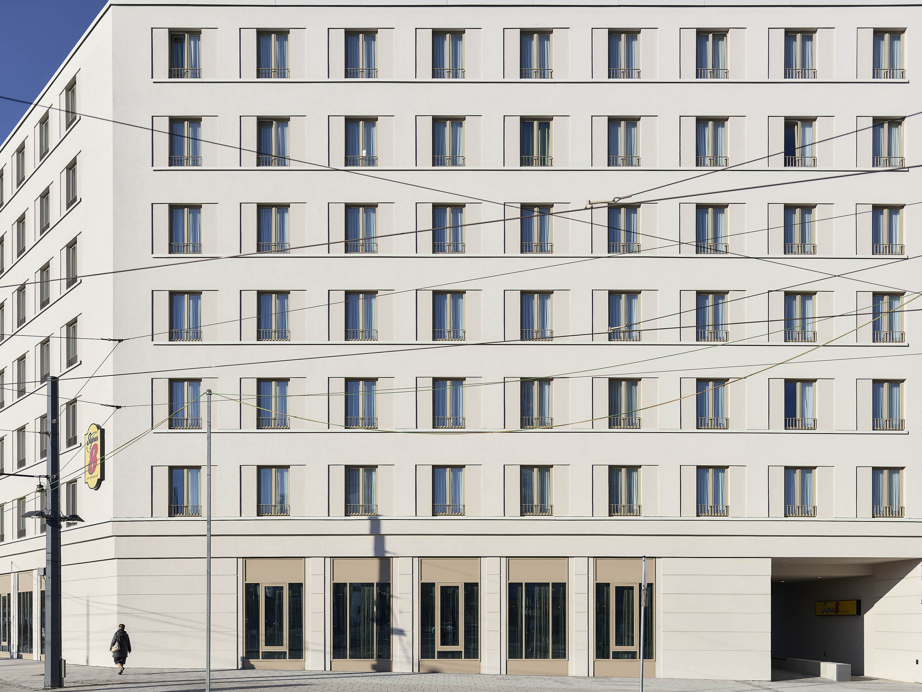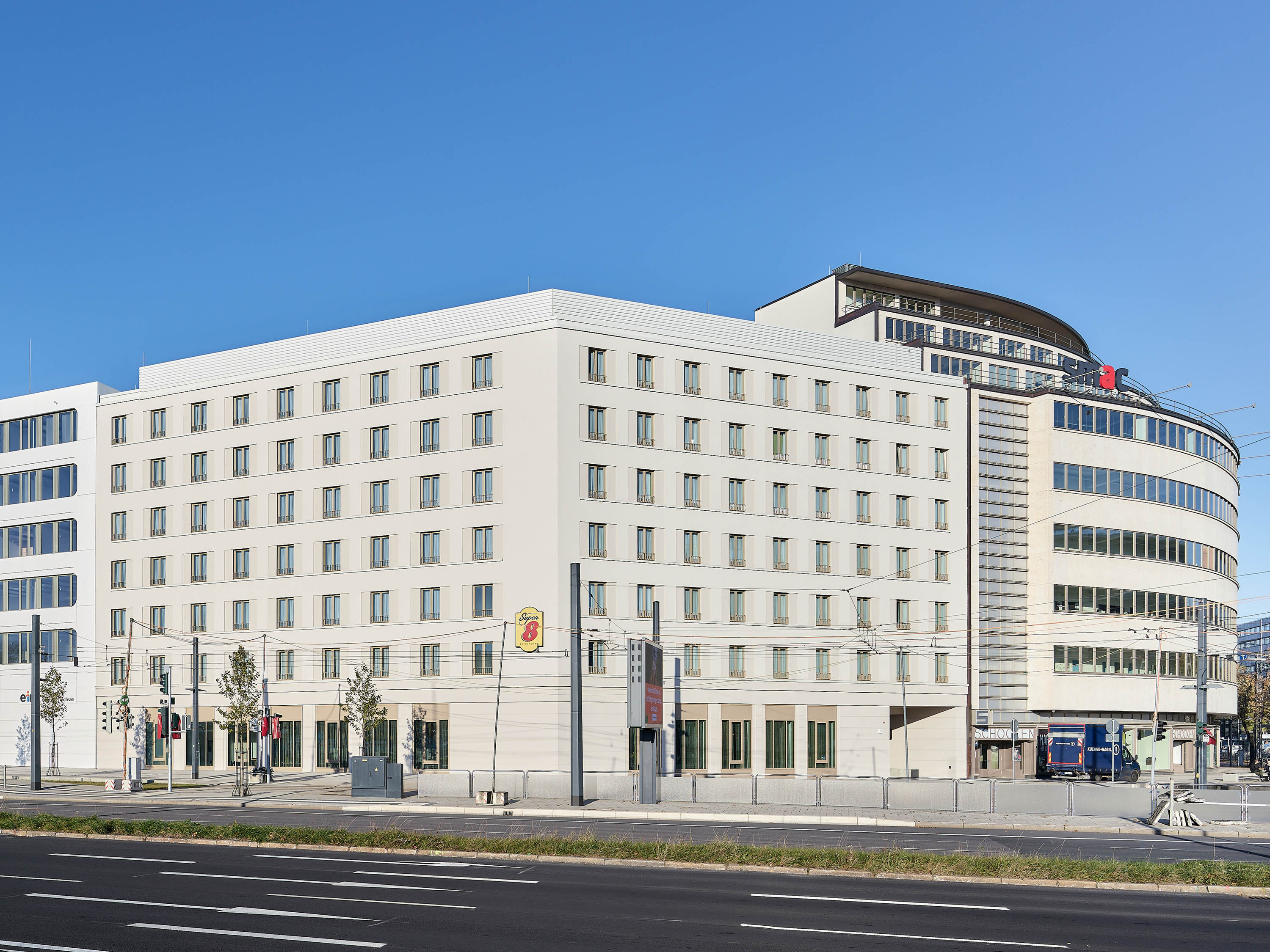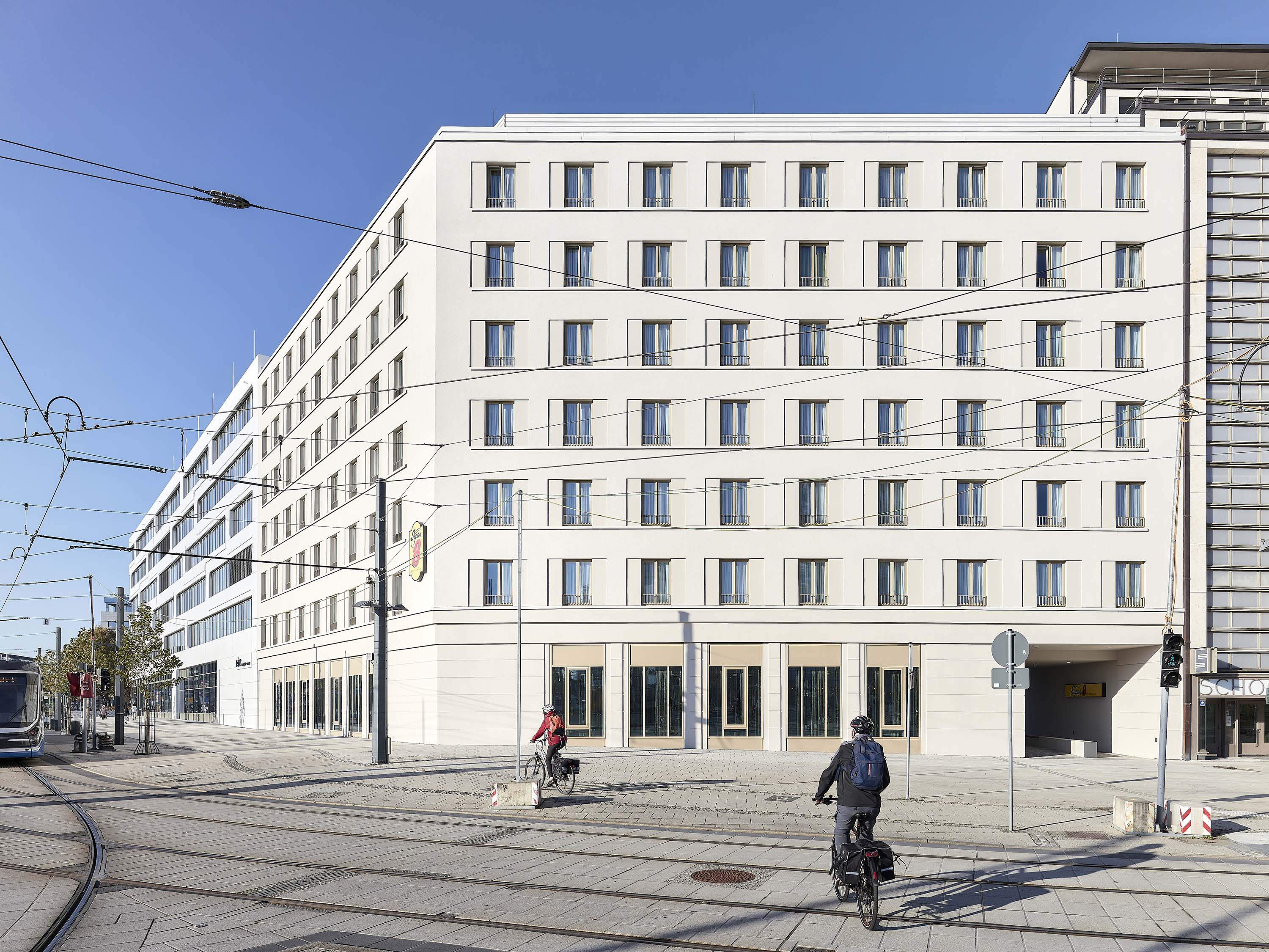 Der Hotelneubau mit seinen sieben oberirdischen Geschossen und zu 20% barrierefreien Zimmern wurde in nur 18 Monaten Bauzeit fertiggestellt. Es schließt an das von Erich Mendelsohn Ende der 1920er Jahre errichtete Kaufhaus Schocken an, das seit 2014 als Sächsisches Museum für Archäologie genutzt wird.