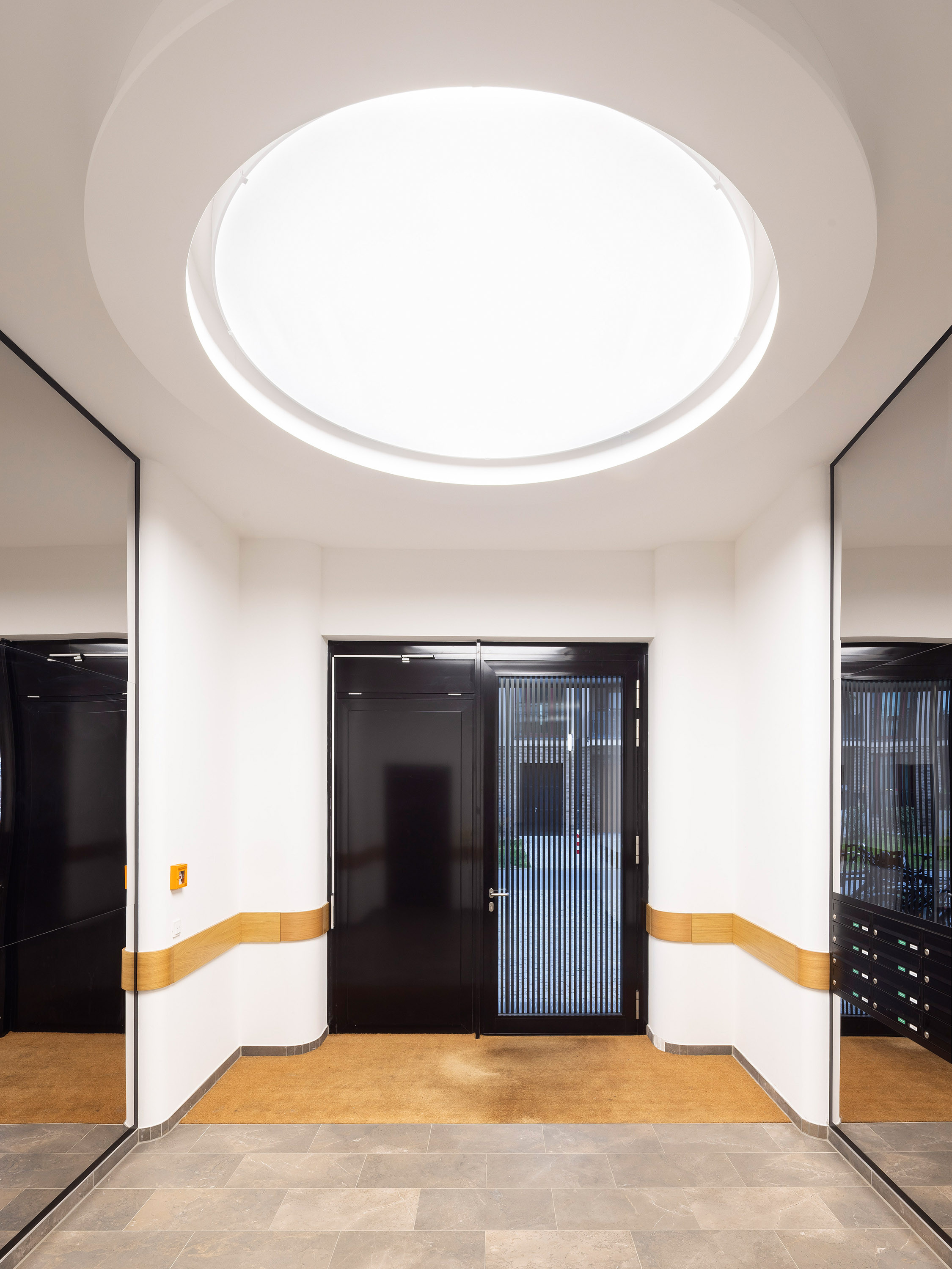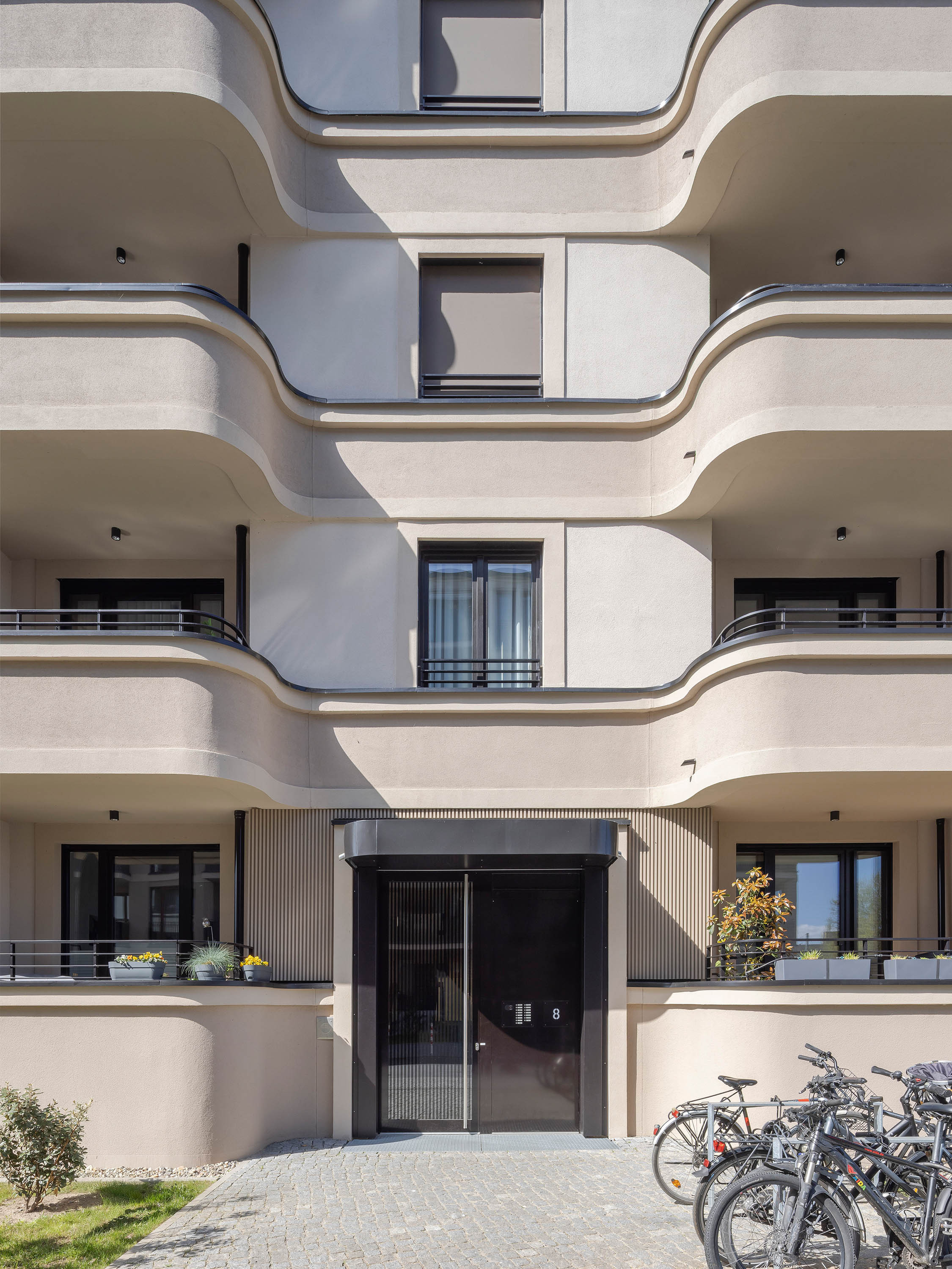 Sechs mehrgeschossige Wohngebäude mit halboffenen Wohnhöfen ergänzen das Quartier. TCHOBAN VOSS Architeken wurden mit dem Entwurf zweier sechsgeschossiger Gebäude mit Tiefgaragen beauftragt: Haus E – VUE mit 53 Eigentumswohnungen sowie Haus F – VIDU mit 120 Mietwohnungen sowie Gastronomie im Erdgeschoss.