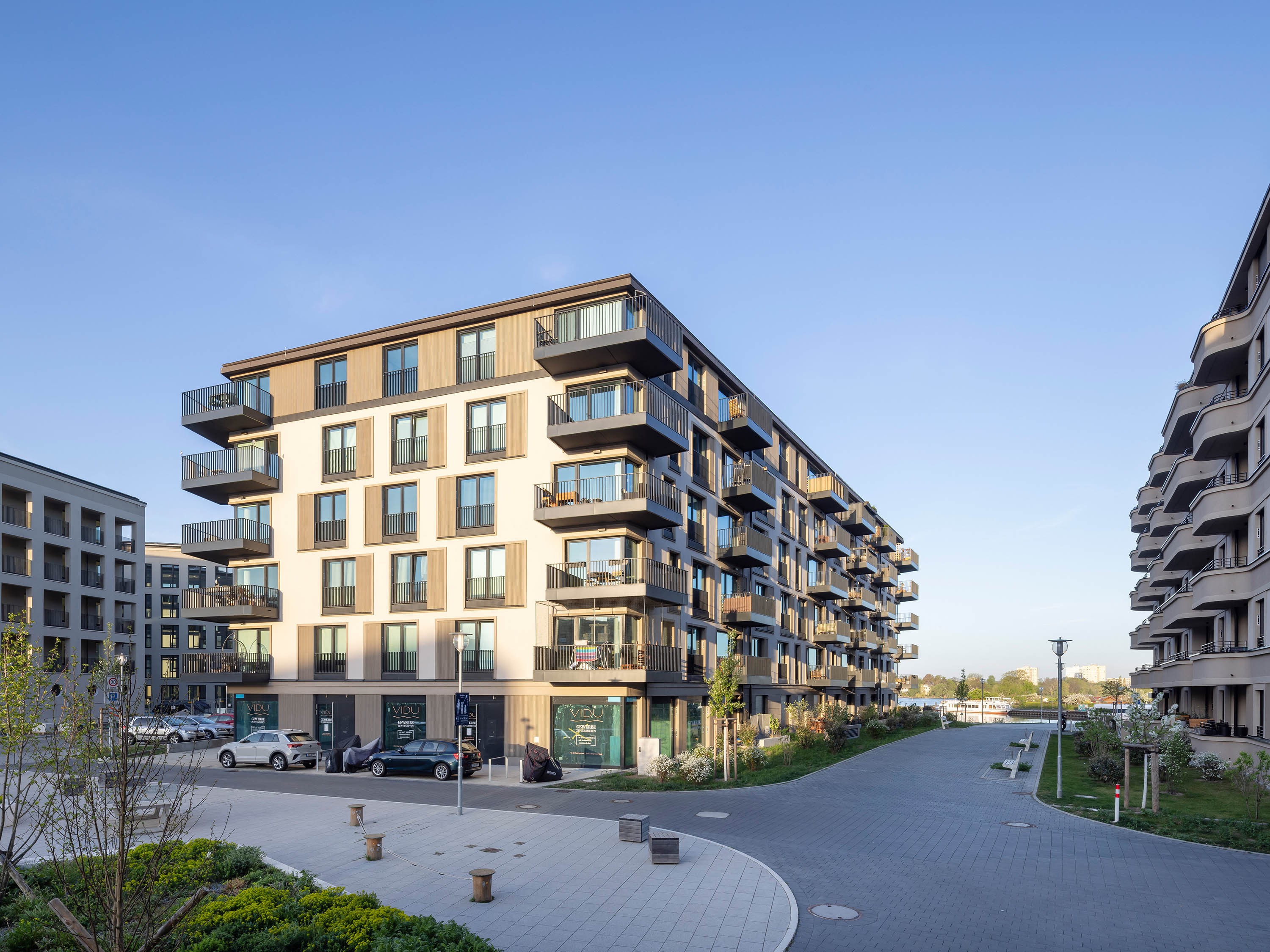 Sechs mehrgeschossige Wohngebäude mit halboffenen Wohnhöfen ergänzen das Quartier. TCHOBAN VOSS Architeken wurden mit dem Entwurf zweier sechsgeschossiger Gebäude mit Tiefgaragen beauftragt: Haus E – VUE mit 53 Eigentumswohnungen sowie Haus F – VIDU mit 120 Mietwohnungen sowie Gastronomie im Erdgeschoss.