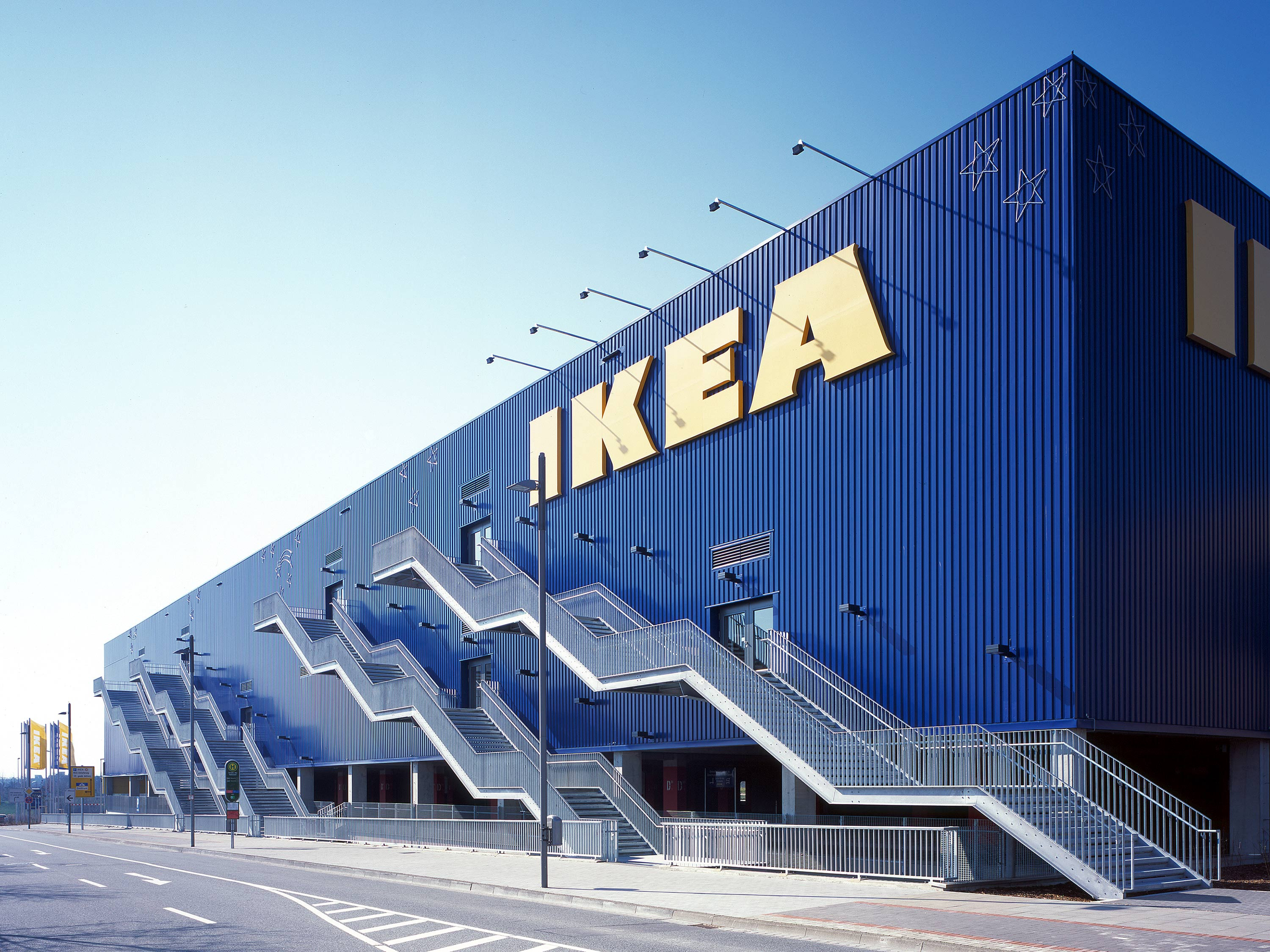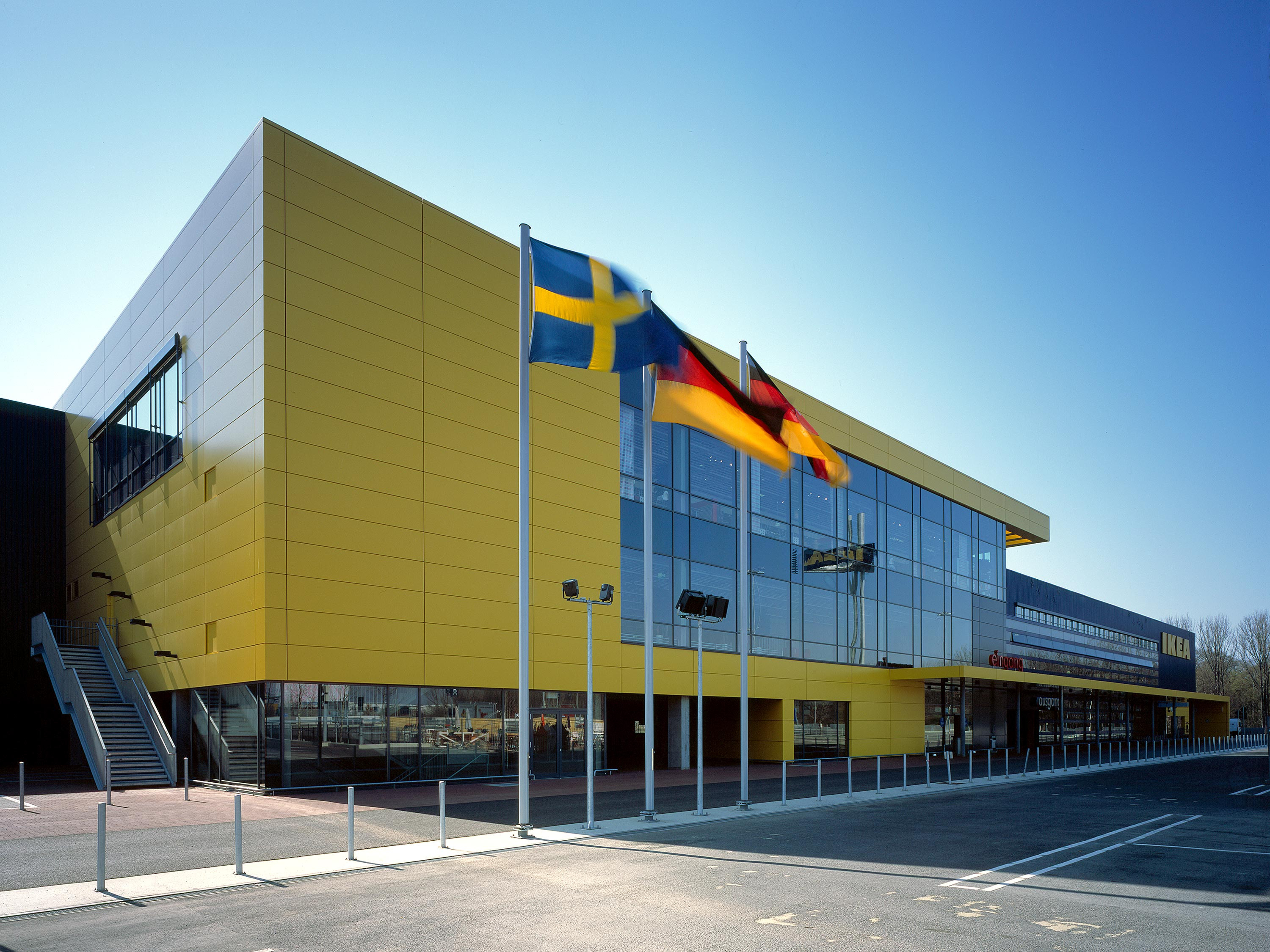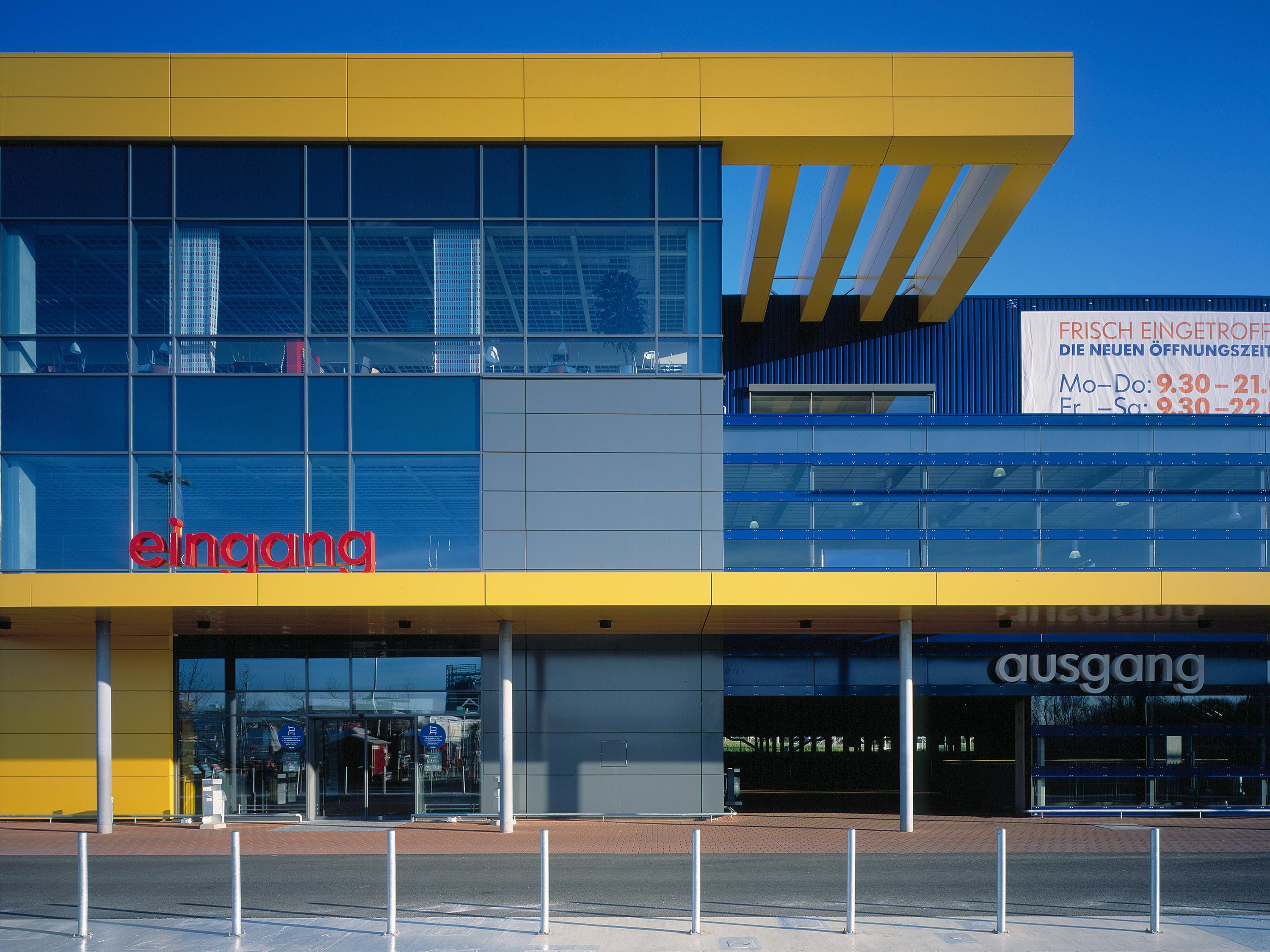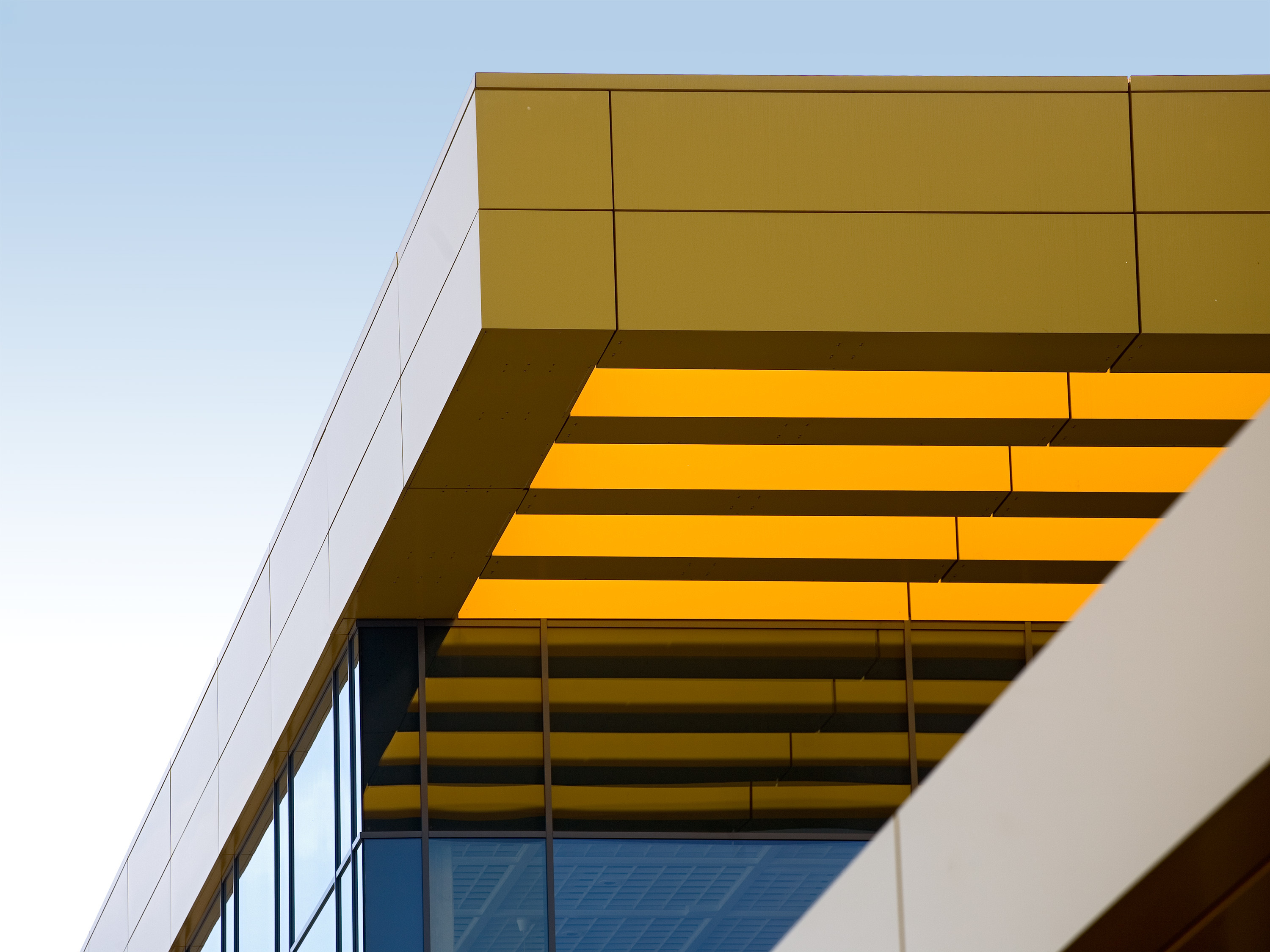 Die Fassadengestaltung aus farbigem Trapezblech wurde gemäß der Corporate Identity des Unternehmens entworfen. Der Haupteingangsbereich und das darüber liegende Restaurant werden durch einen vorstehenden, großzügig verglasten Baukörper hervorgehoben.