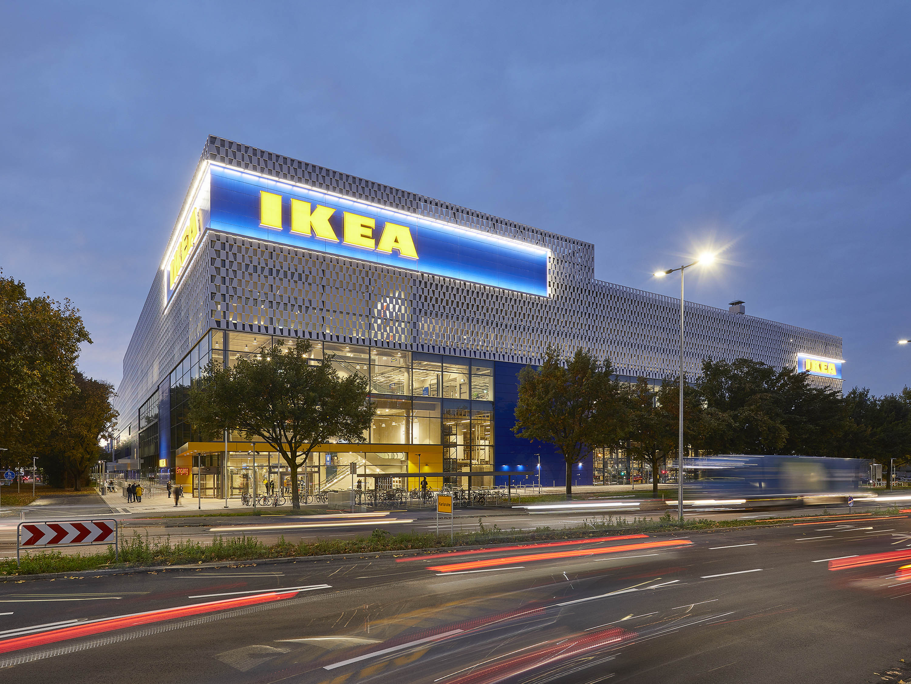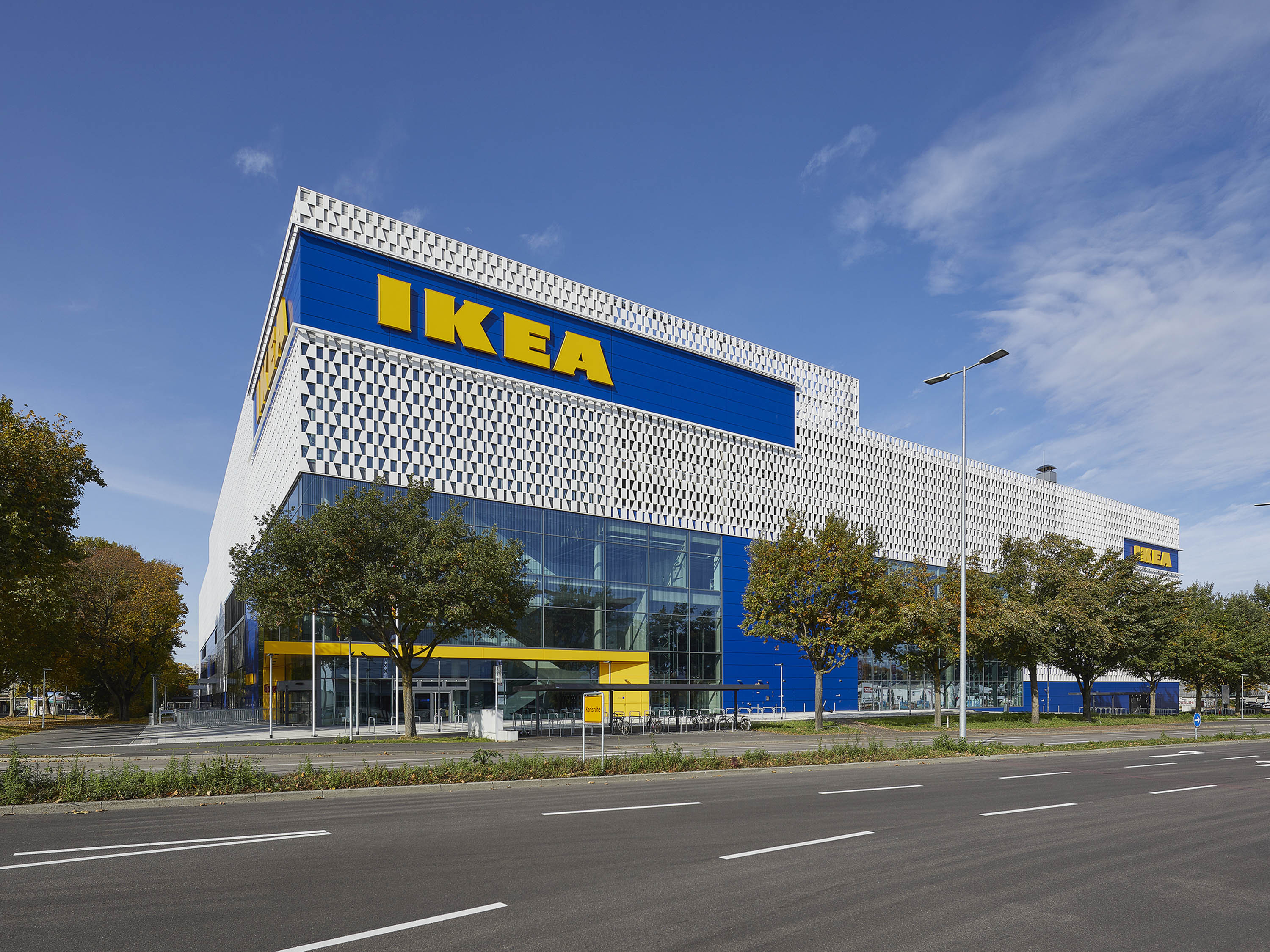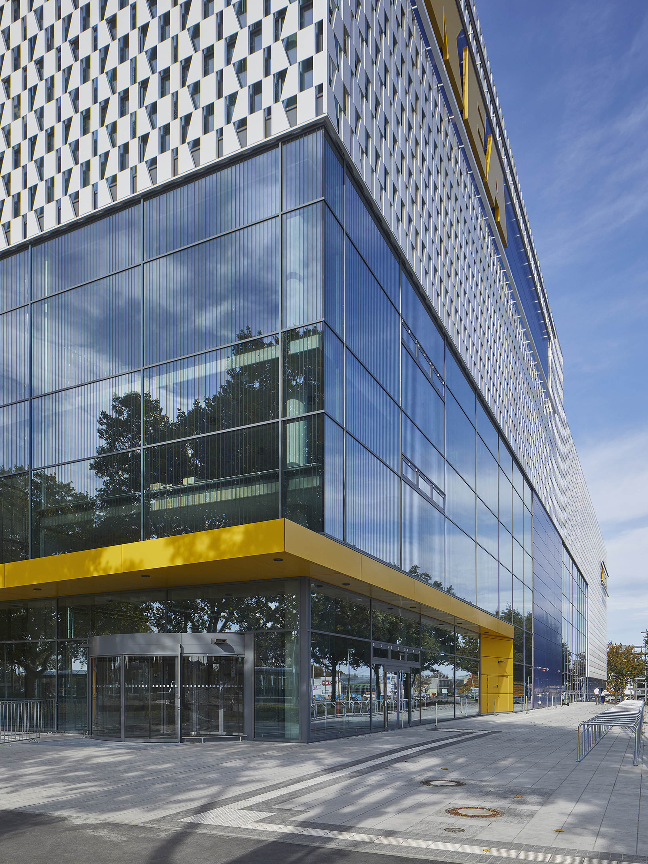 Im Rahmen der IKEA-Nachhaltigkeitsstrategie „People Planet Positive" wurden energetisch optimierte haustechnische Maßnahmen umgesetzt. Die weißen Fassadenmodule verhindern durch Reflexion eine Aufheizung und tragen so zur Verbesserung des städtischen Klimas bei. Die Dachflächen sind zum größten Teil extensiv begrünt.
