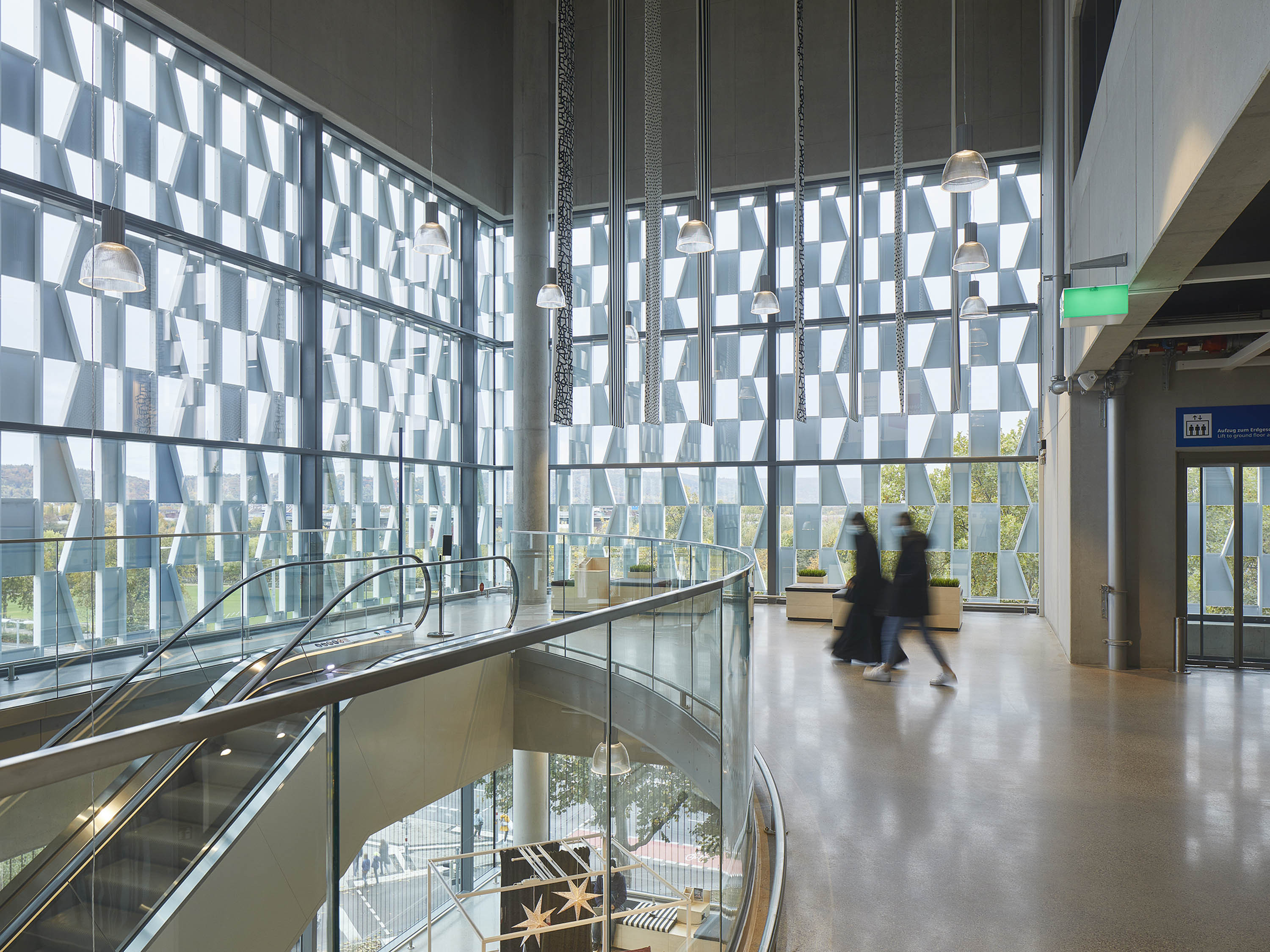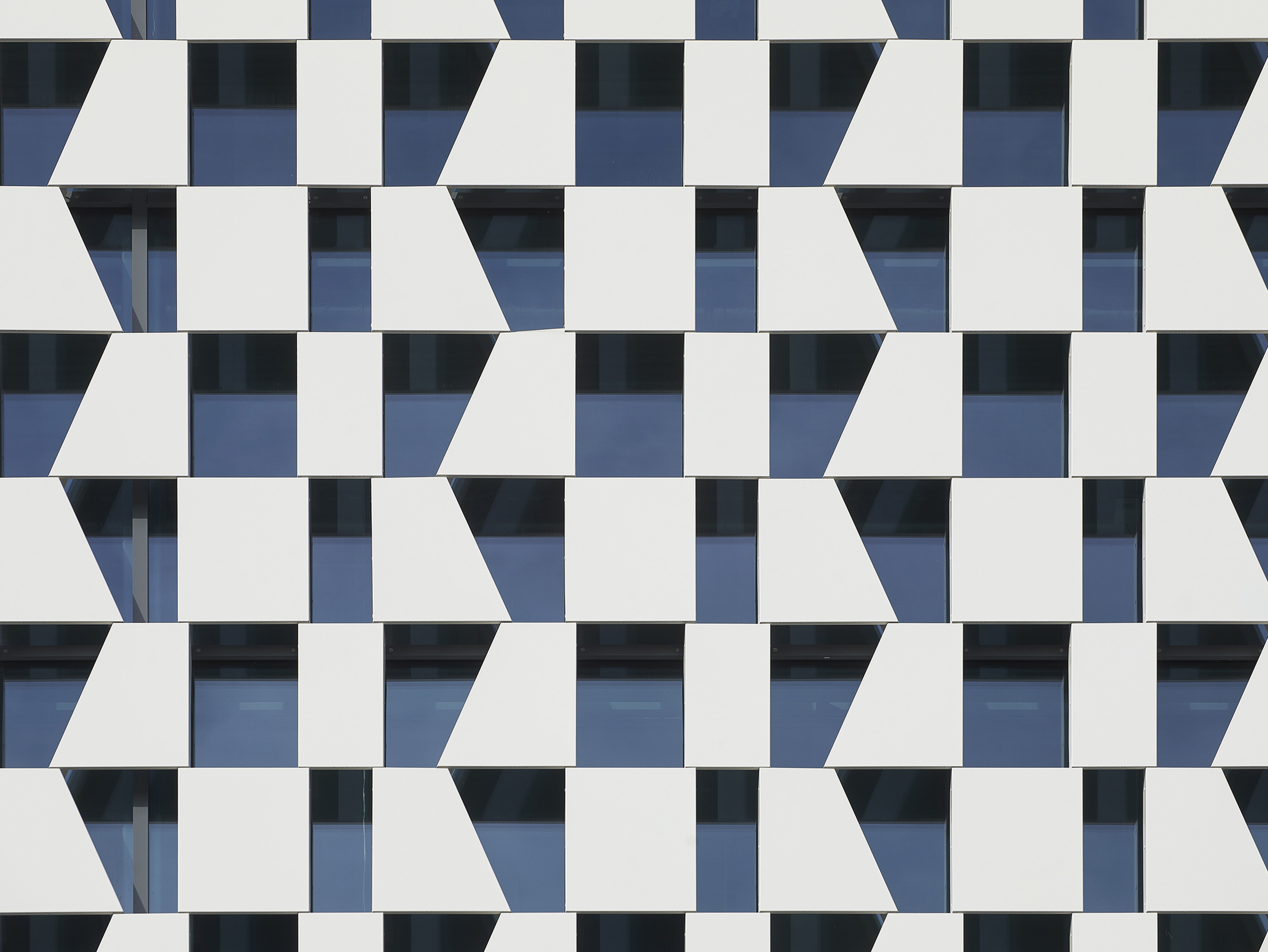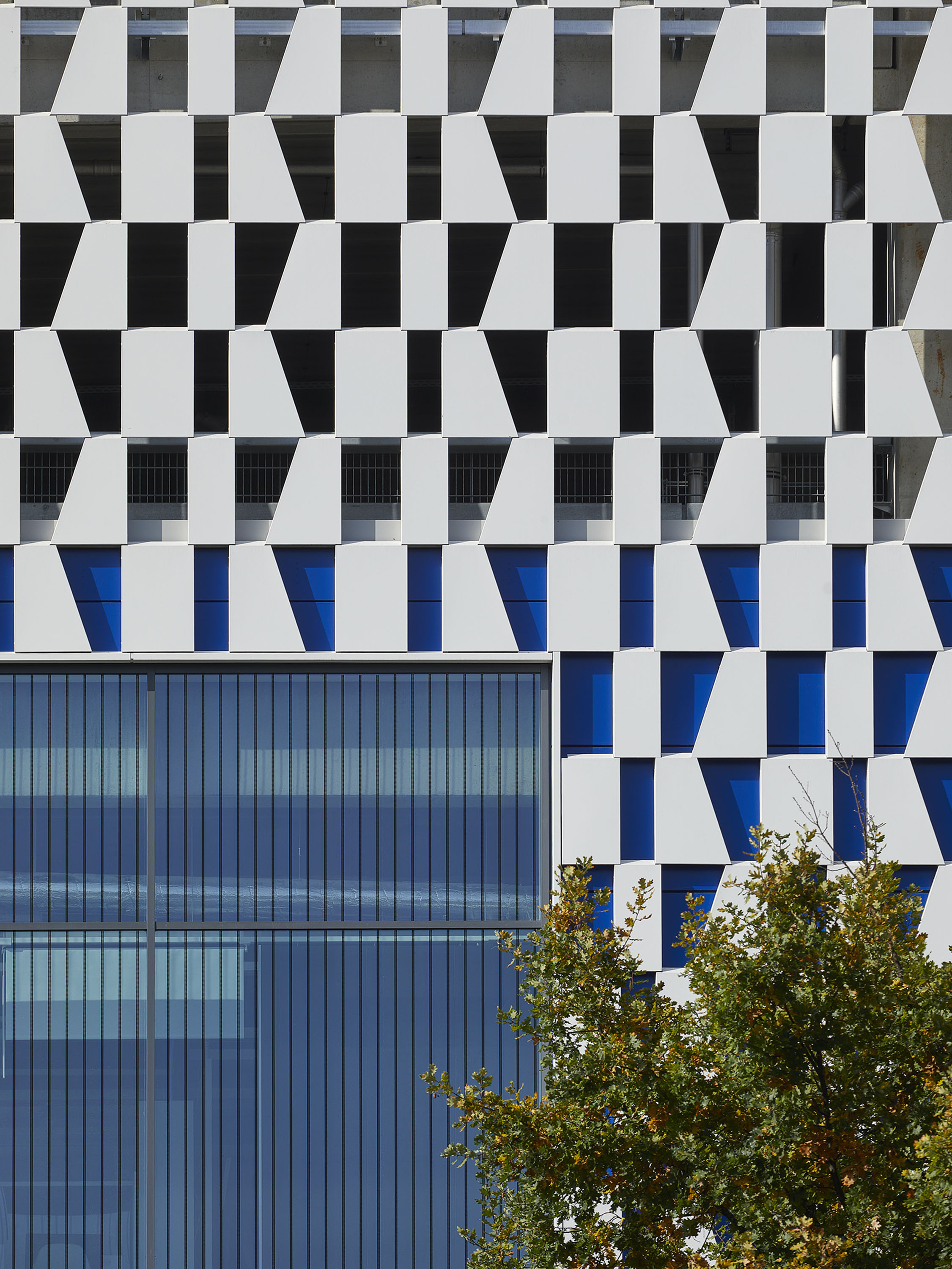 Das weiße Fassadenkleid besteht aus U-förmig gekanteten Aluminiumblechen, die als offene Vorsatzschale in einer Netzstruktur auf die hinterlüfteten Kassettenwände der Blaublechfassade montiert wurden. TCHOBAN VOSS Architekten arbeiten hier bewusst mit der variierenden Transparenz. Durch die Tiefe der weißen Blechmodule präsentieren sich dem Betrachter – je nach Blickwinkel und Entfernung – Fassadenansichten mit unterschiedlichen Weiß- und Blauanteilen. Je nach Tages- bzw. Jahreszeit kann dieses Fassadenspiel unterschiedlich wahrgenommen werden.
