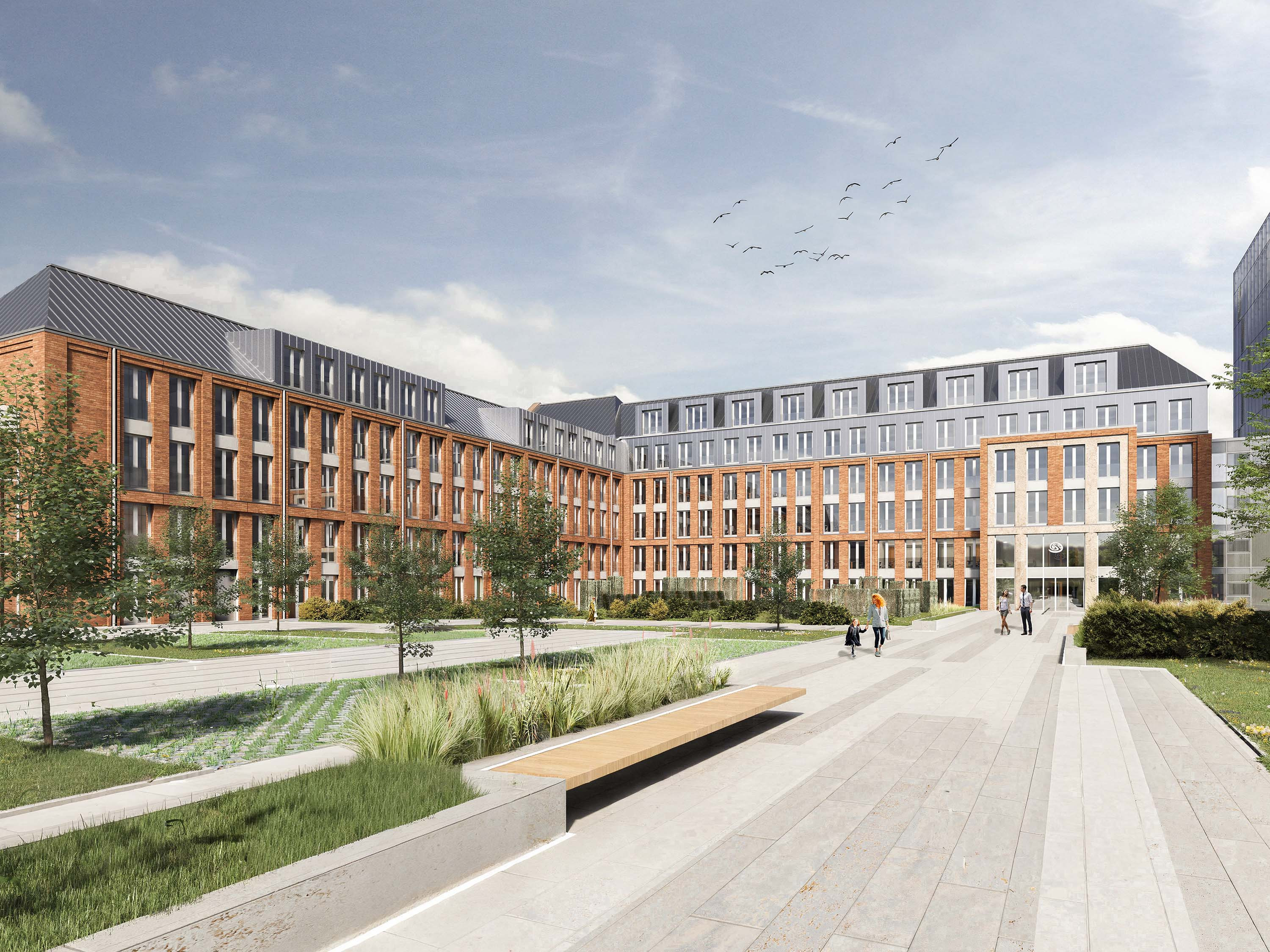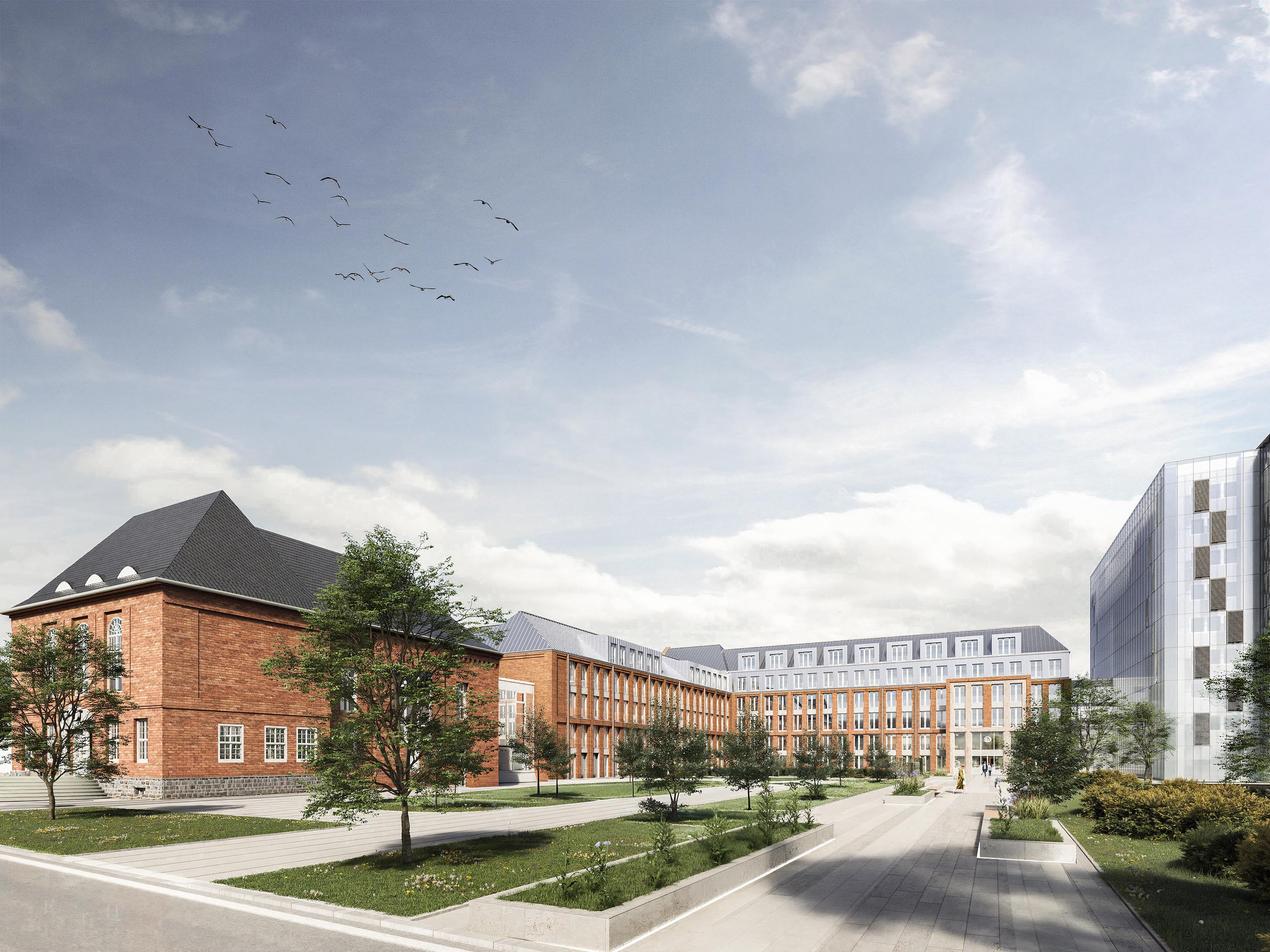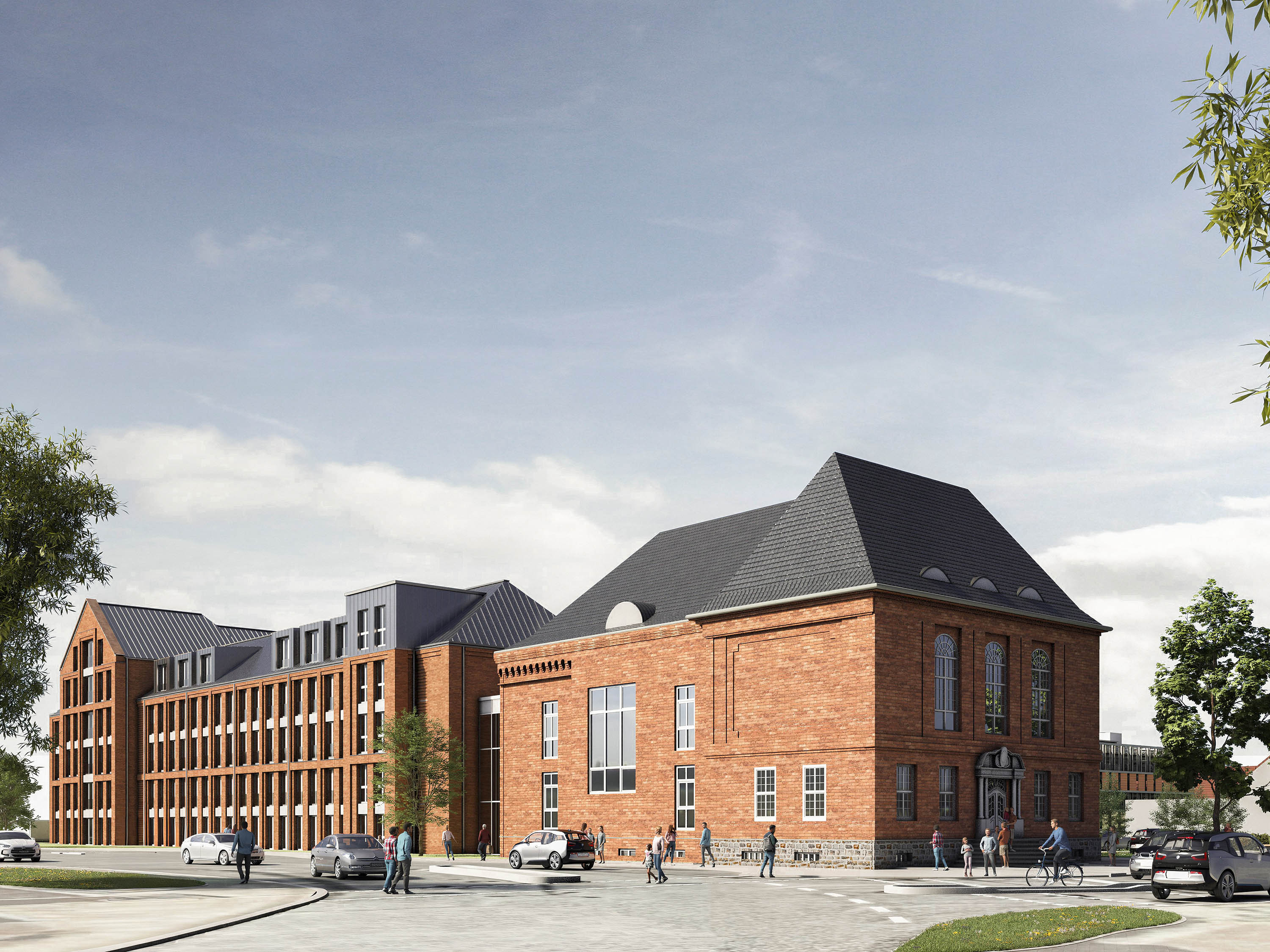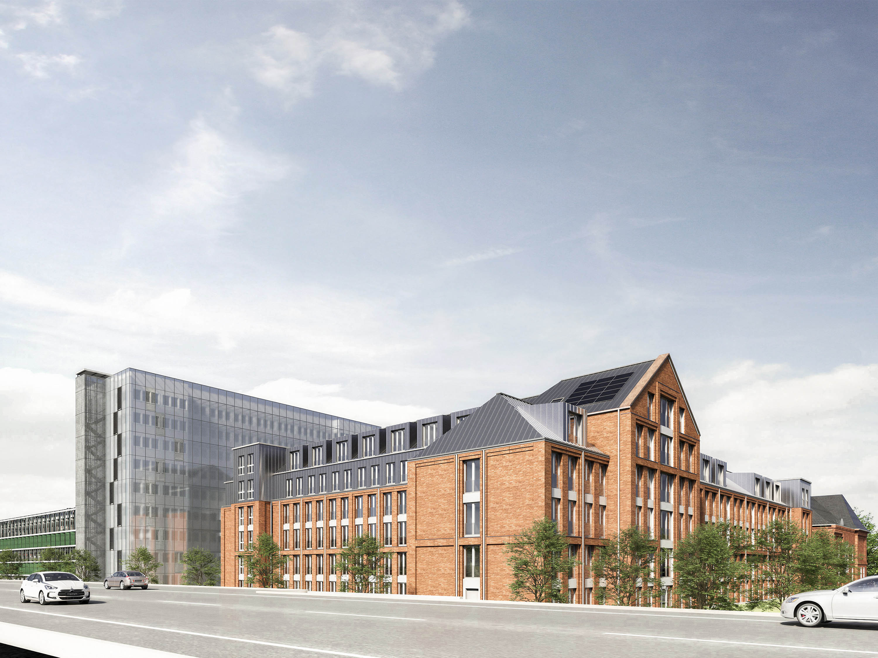 Haus A ist als vollunterkellertes Gebäude mit fünf bis sechs Geschossen und geneigtem Dach geplant. Ergänzend entsteht westlich des bestehenden Hauses B ein System-Parkhaus mit 387 Stellplätzen auf zwölf Halbebenen.