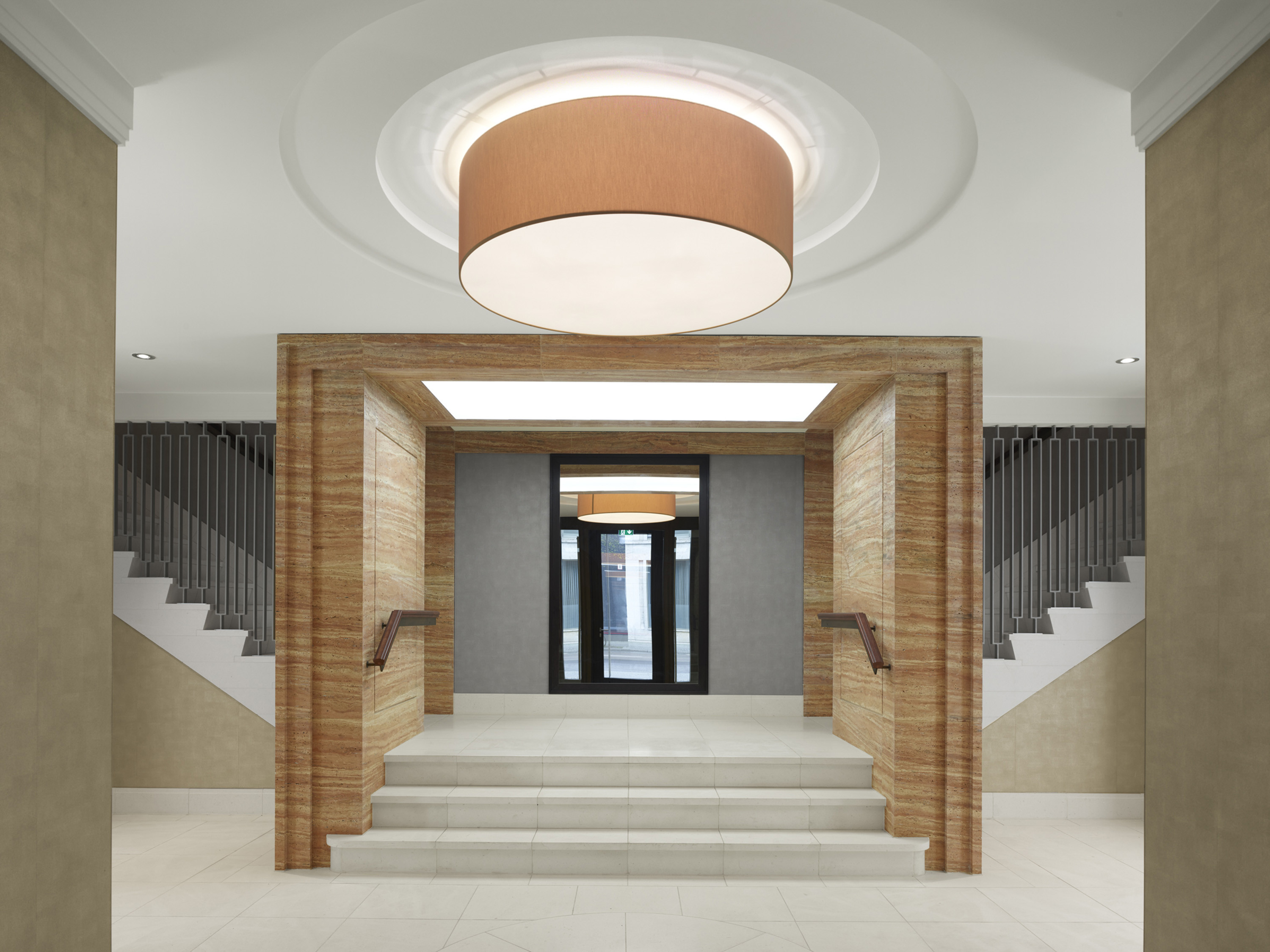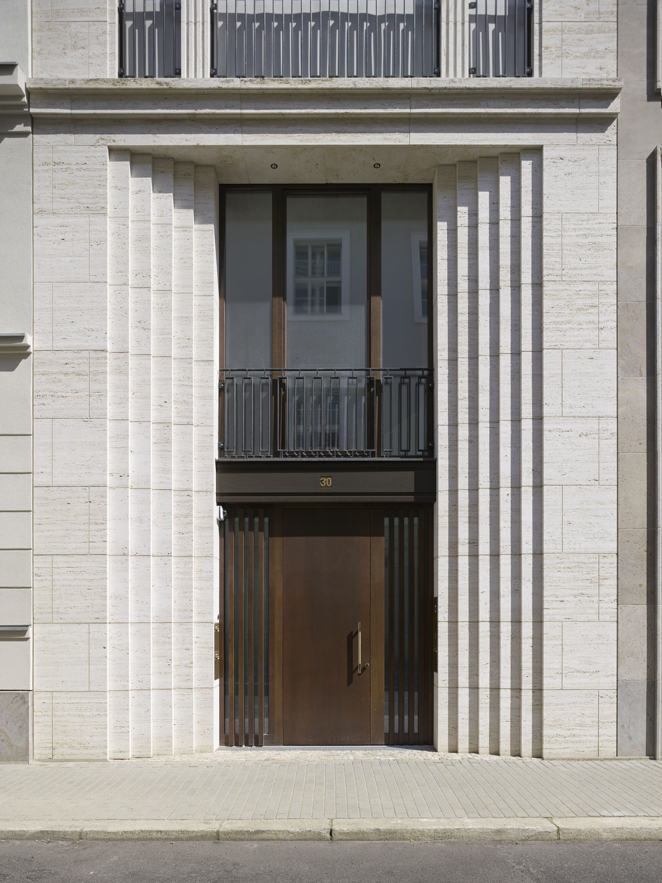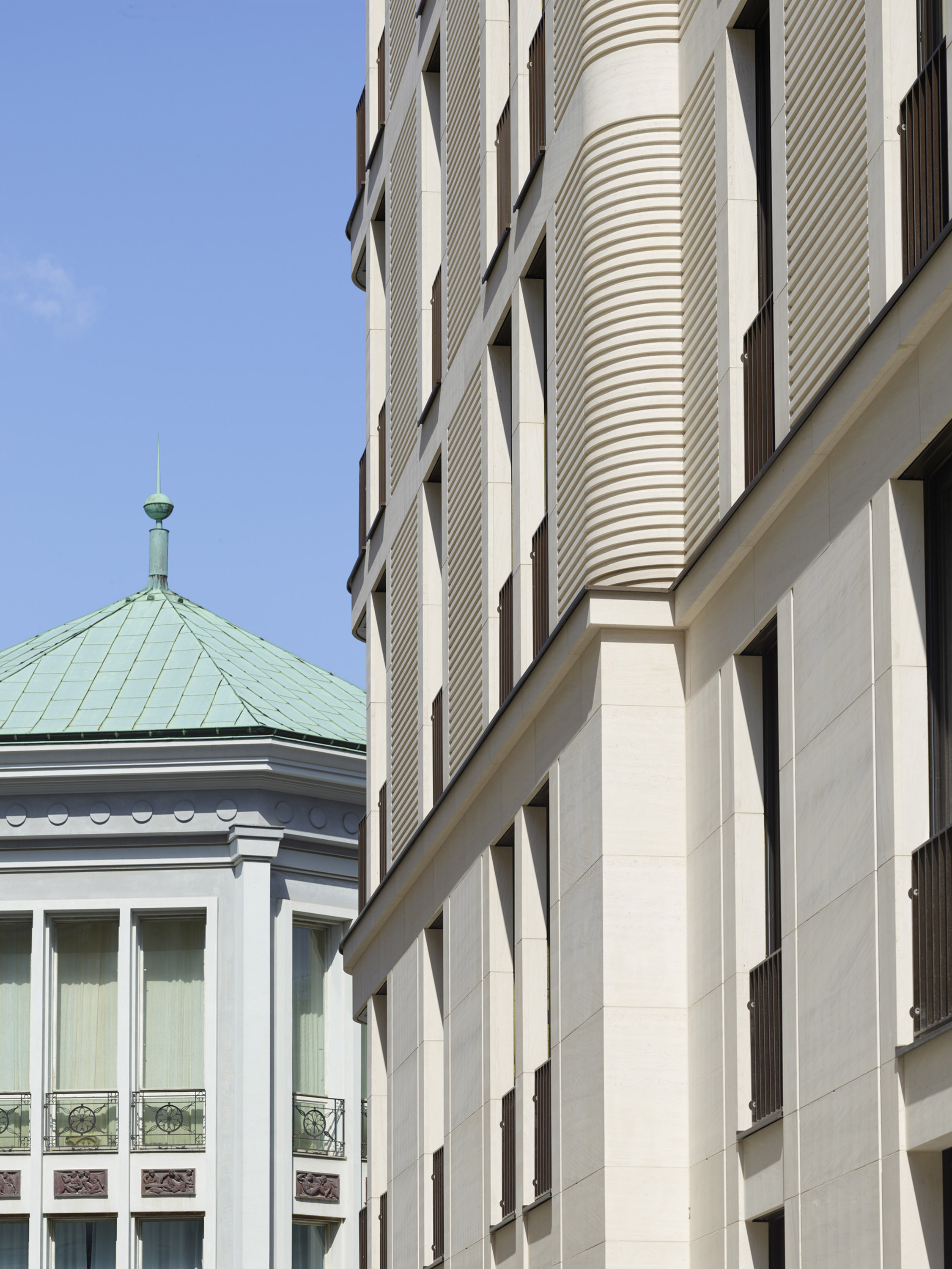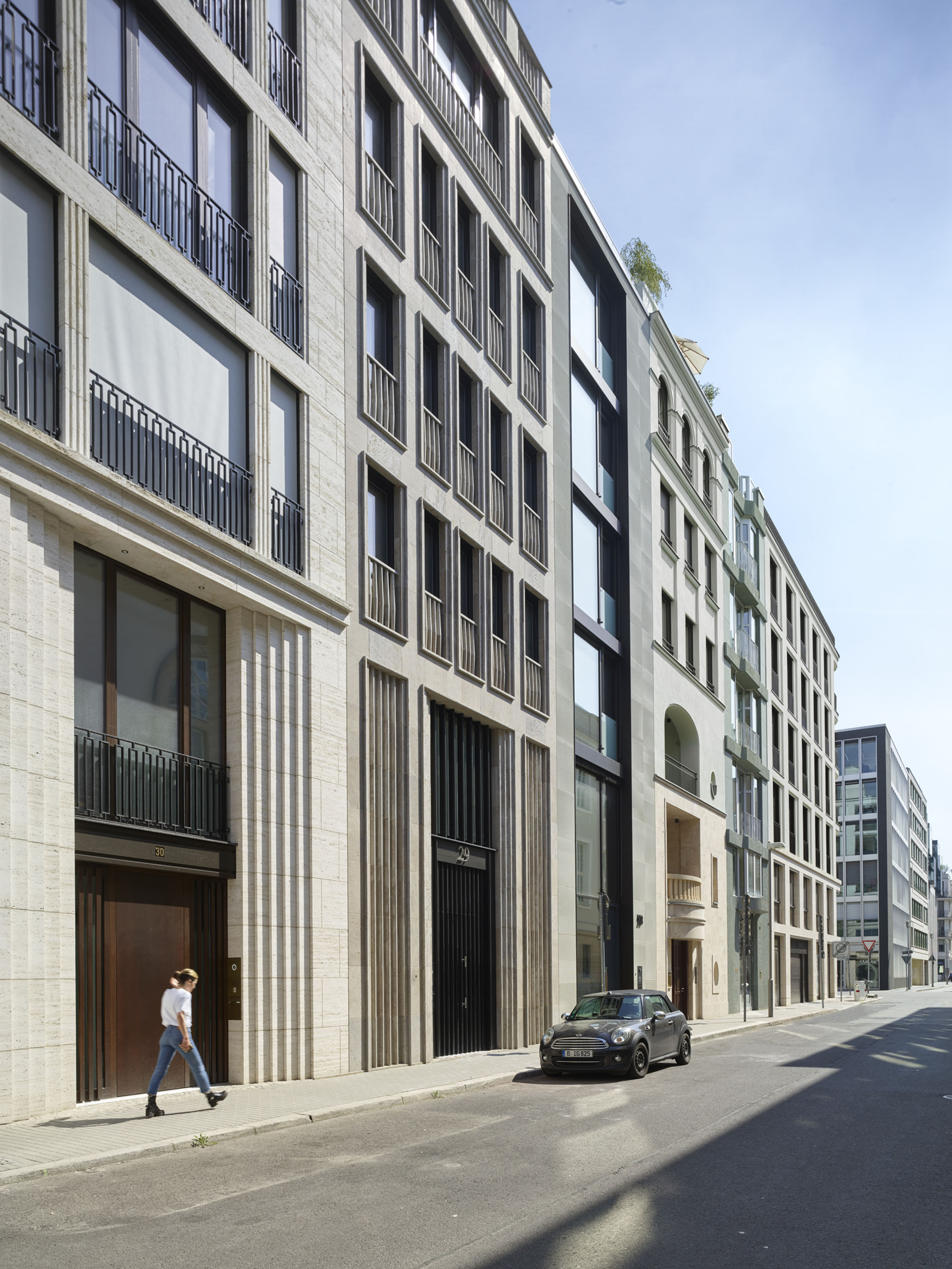 Die Townhouses 2 und 3 an der Oberwallstraße, das Haus 11 an der Falkoniergasse und der Erdgeschossbereich der beiden Häuser 7 und 8 am Werderschen Markt sind mit Travertin oder Kalkstein verkleidet. Jedes der Häuser hat sein unverwechselbares Gesicht, das sich in den Details widerspiegelt. Die Eingangsbereiche sind teils zurückgesetzt und durch unterschiedlich geformte Rücksprünge betont.