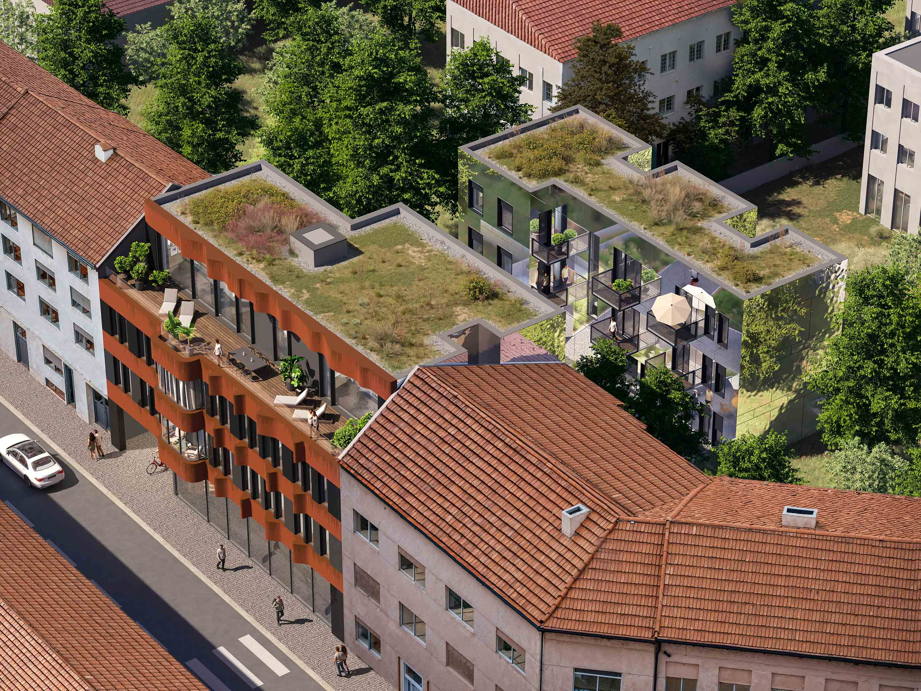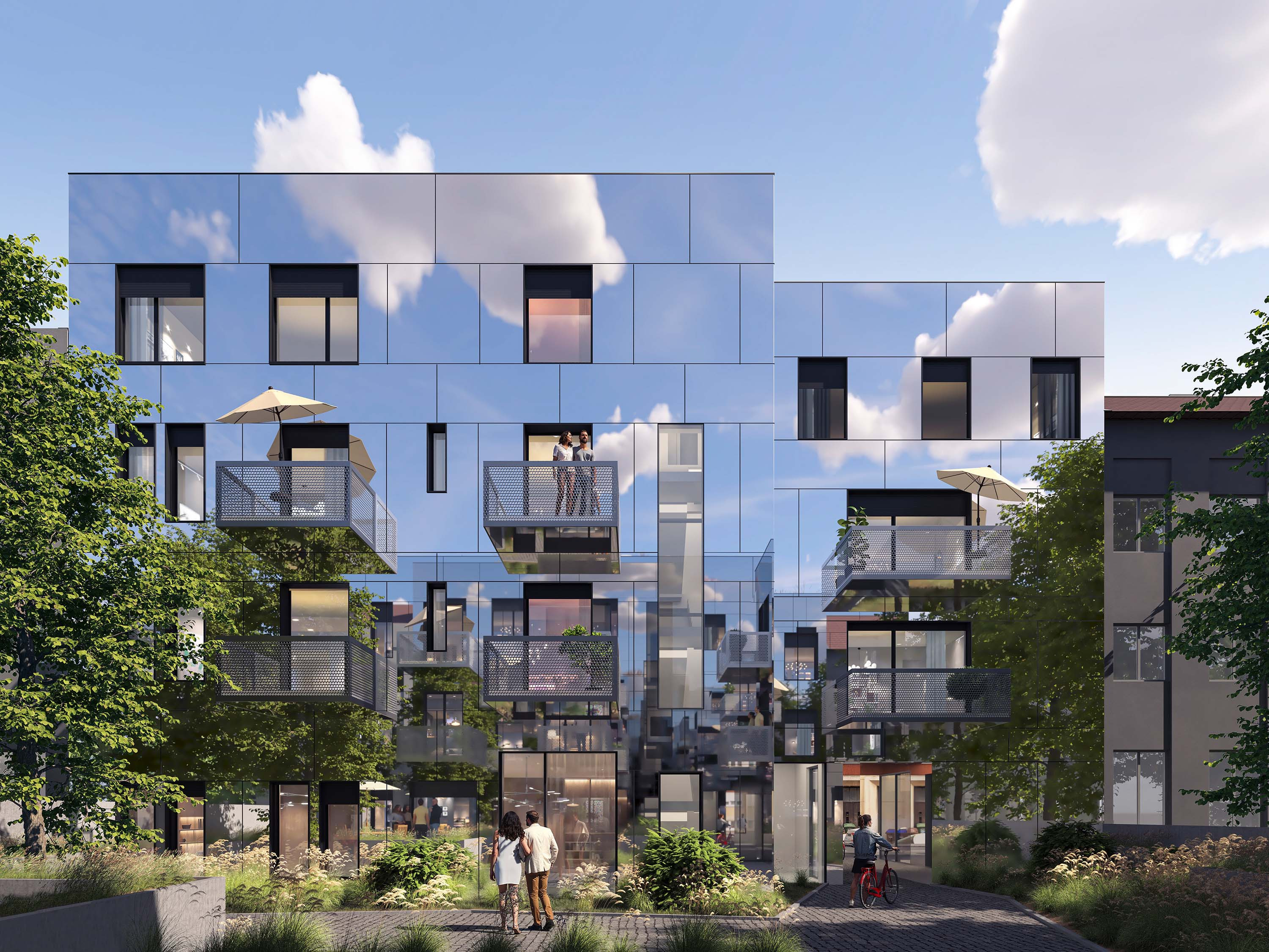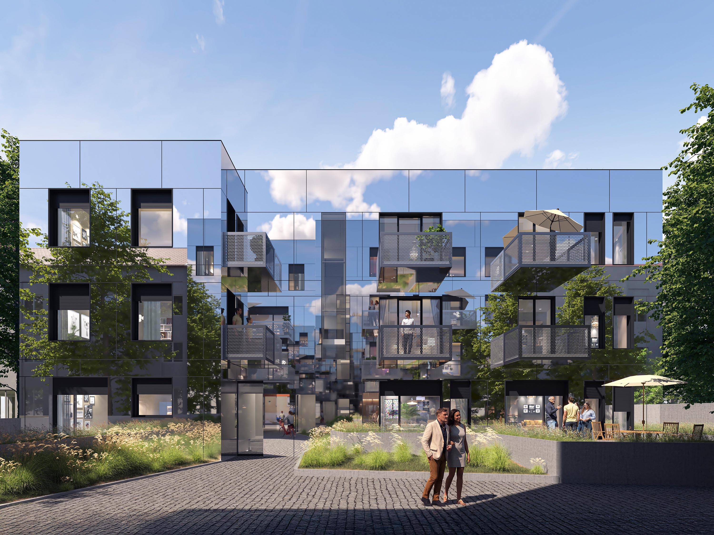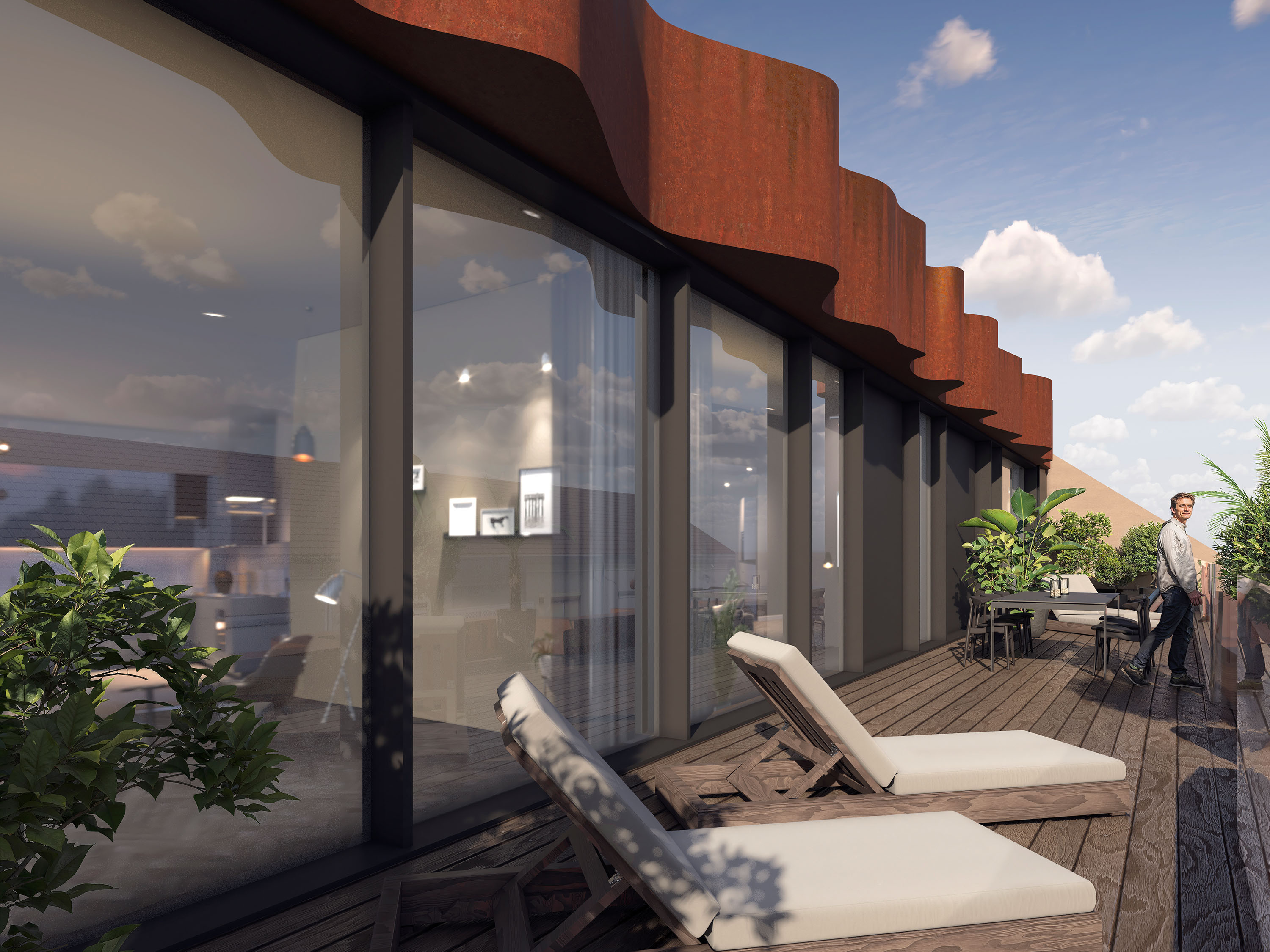 Eines mit einer expressiven wellenförmigen Straßenfassade aus patinierten dreidimensional ausgeformten Corten-Stahl-Kassettenelementen. Im Erdgeschoss findet sich eine Gewerbefläche.