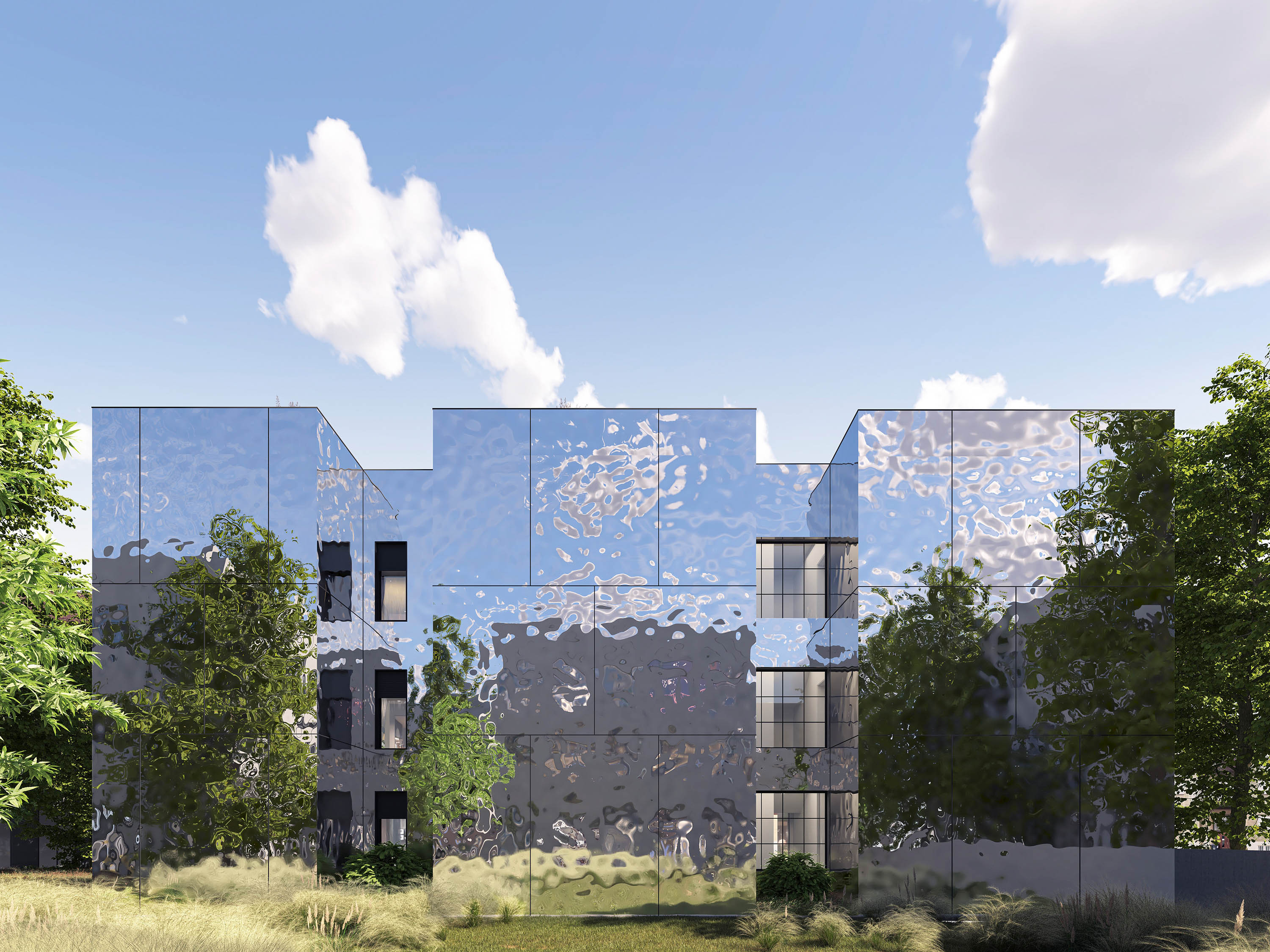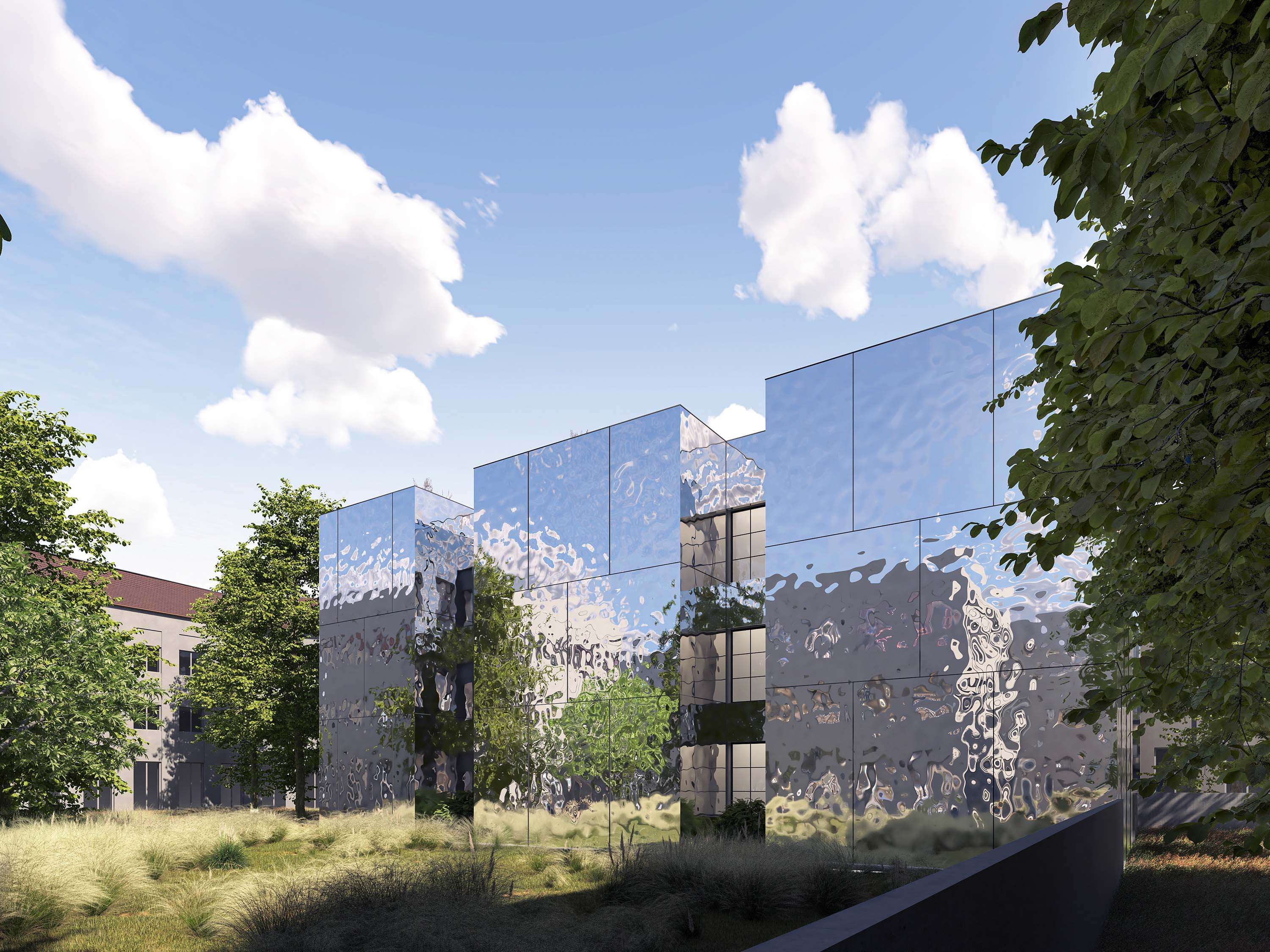 Nicht minder spektakulär präsentiert sich die Hoffassade des zweiten Gebäudes aus planen, strukturierten spiegelpolierten Edelstahlblechen, die optisch an eine wellige Wasseroberfläche erinnert.