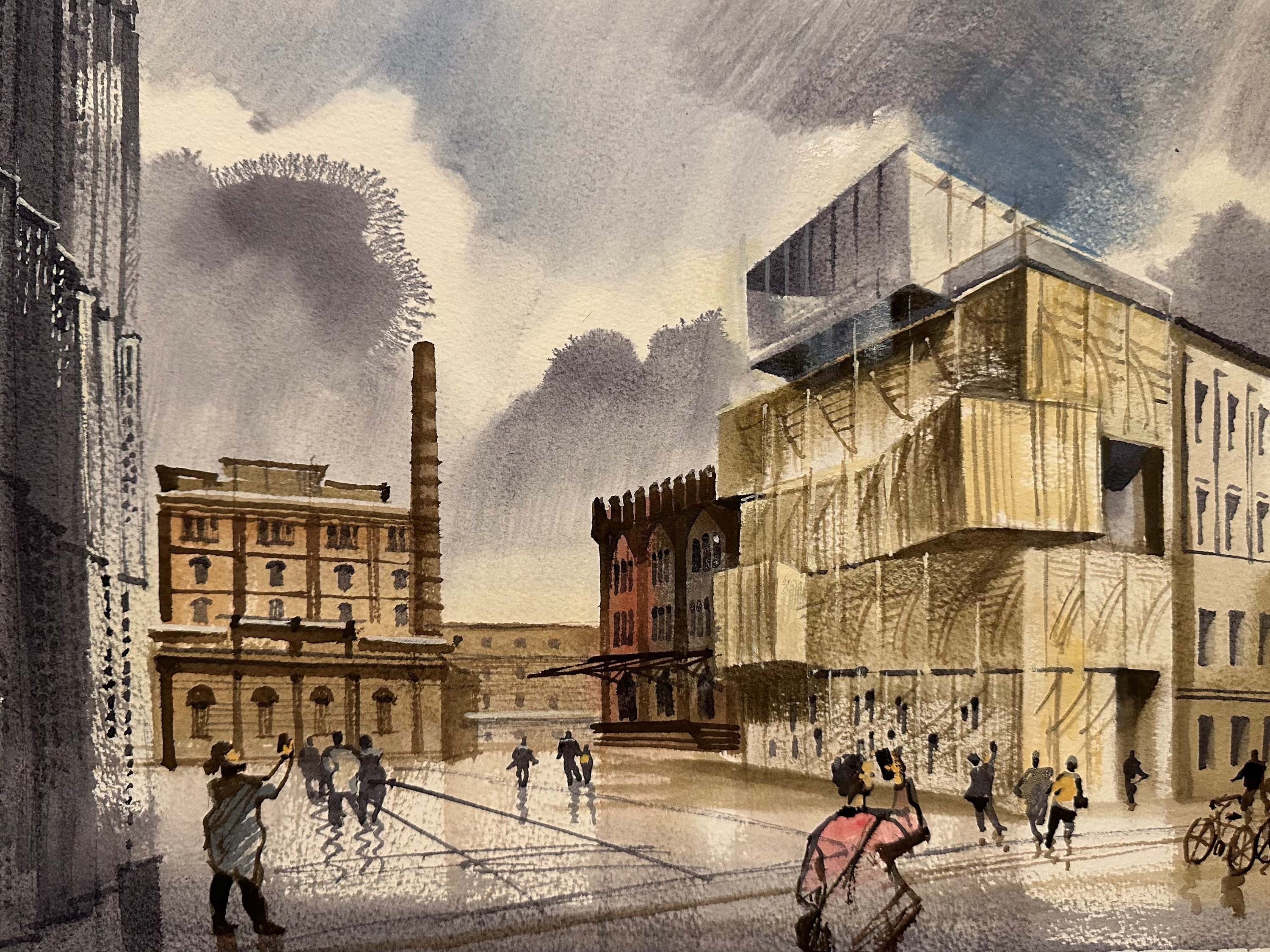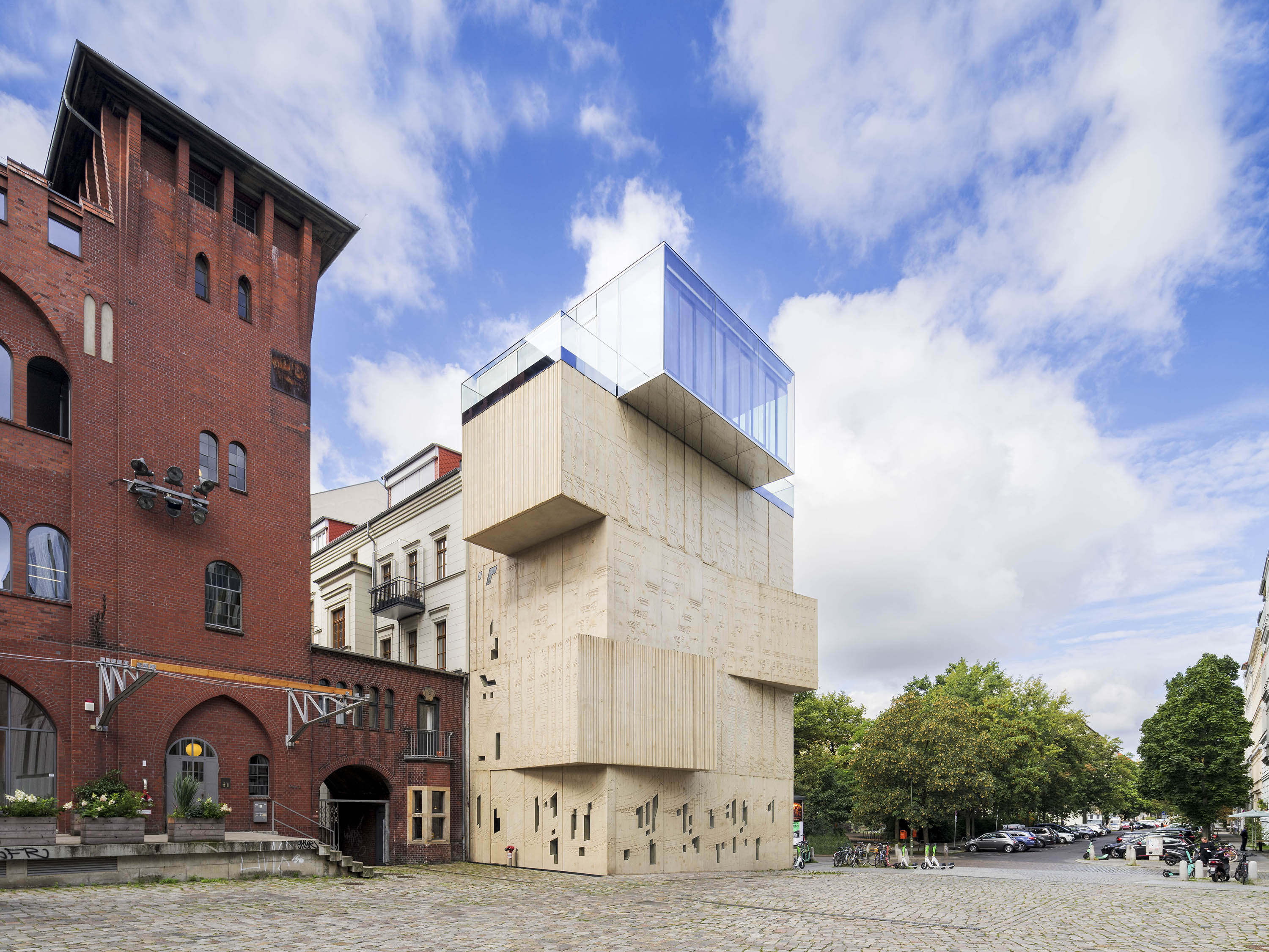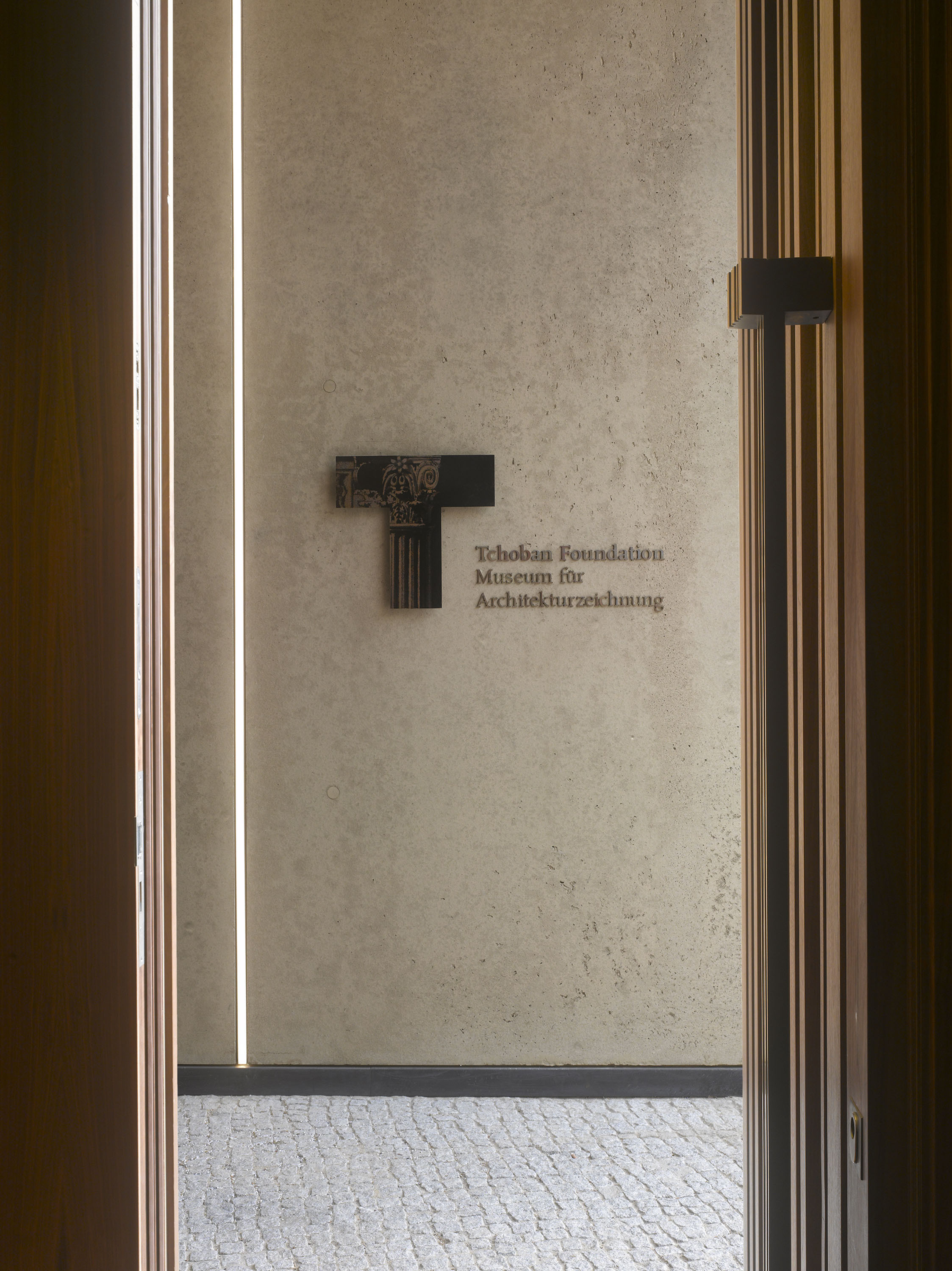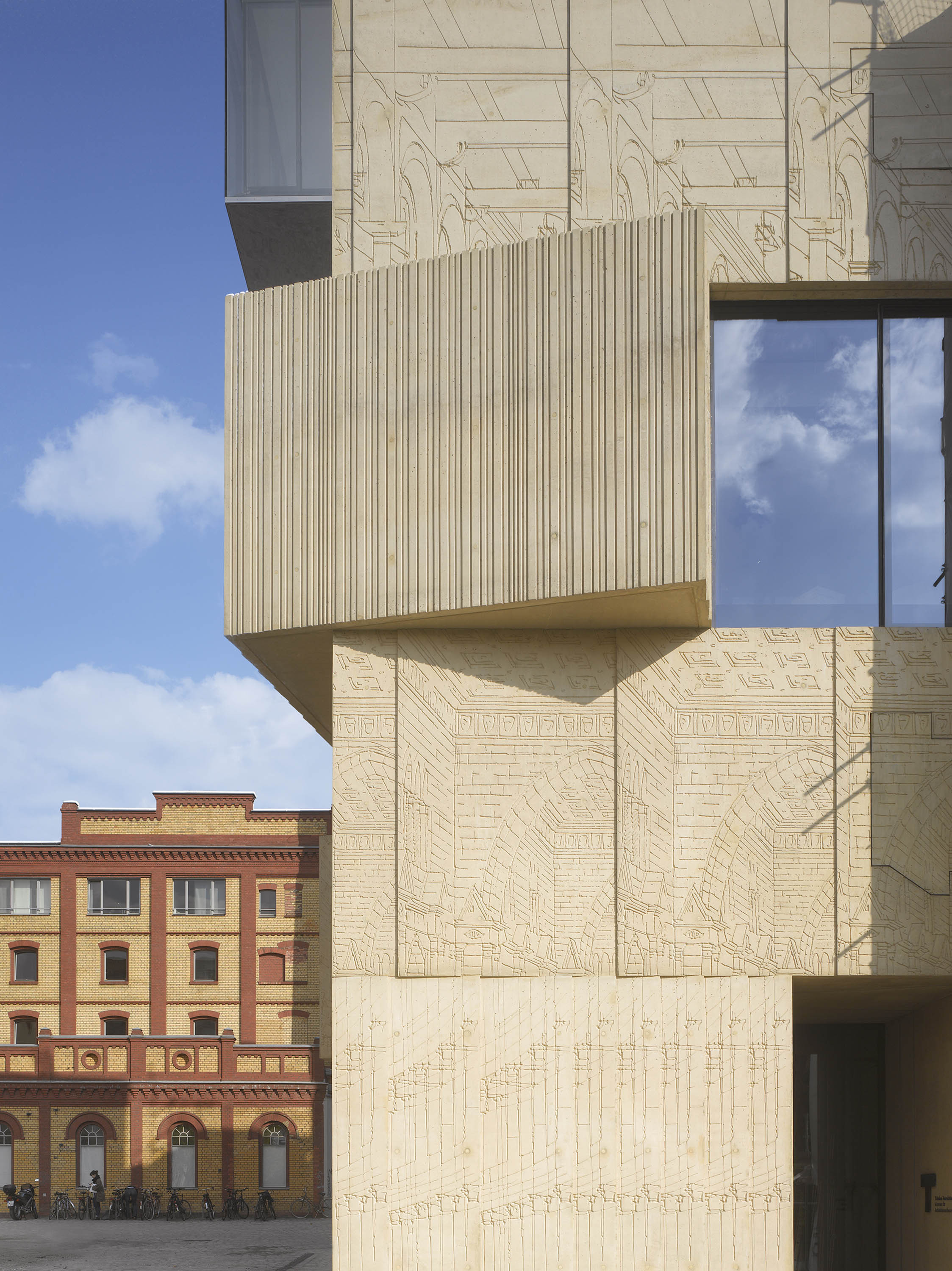 Als Hinweis auf die Funktion zeigt die sandfarbene Betonfassade großformatige Fragmente historischer Architekturzeichnungen, die mithilfe plastischer Matrizenschalungen vor Ort hergestellt wurden.