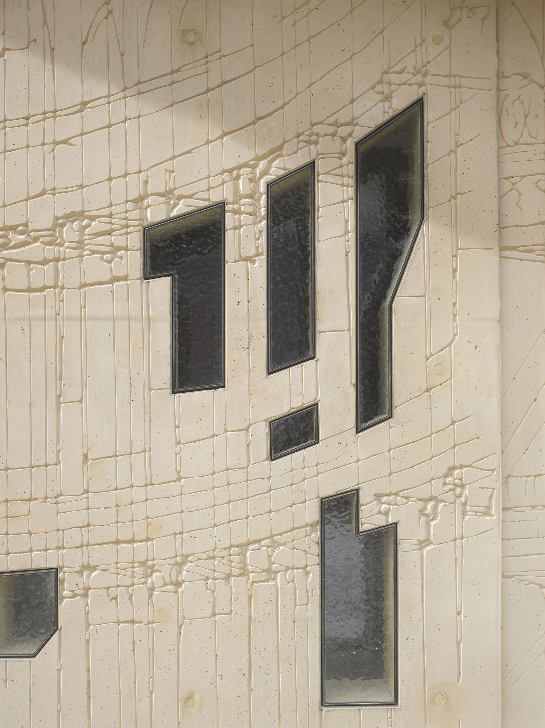Im Erdgeschoss und über die gesamte Höhe des Treppenhauses sind hofseitig kleine, das Licht diffus brechende Fenster aus Kathedralenglas in teils schiefwinkligen Geometrien in die Betonflächen geschnitten. Sie brechen die Fassadenillustration baulich auf.