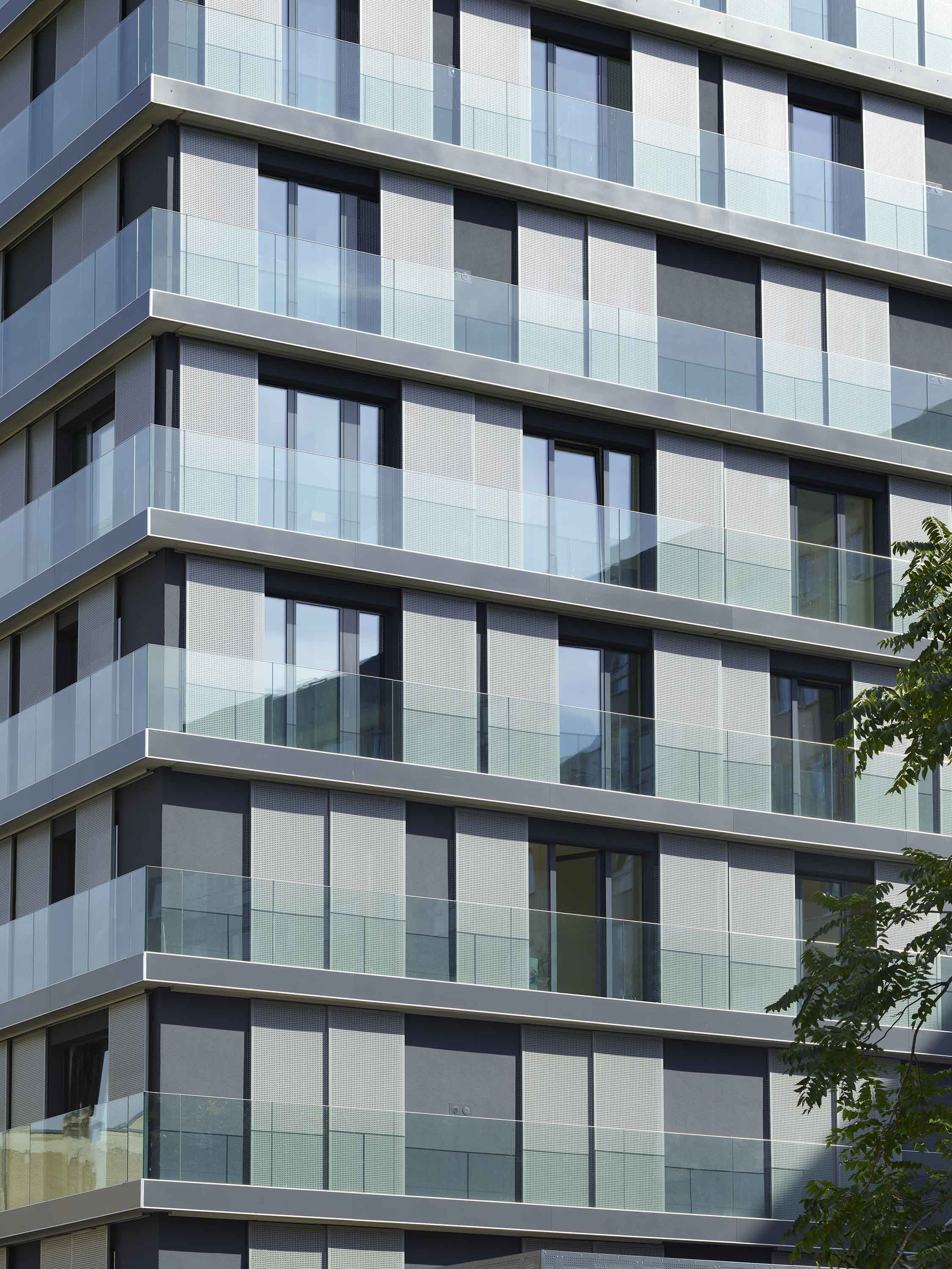 Die Fassaden des neuen Wohnturms sind im Anschlussbereich zum Bestandsgebäude mit hellen Alucobond-Platten verkleidet, die in Ihrer Farbigkeit mit der Kolorierung der Bestandsfassaden harmonisiert.