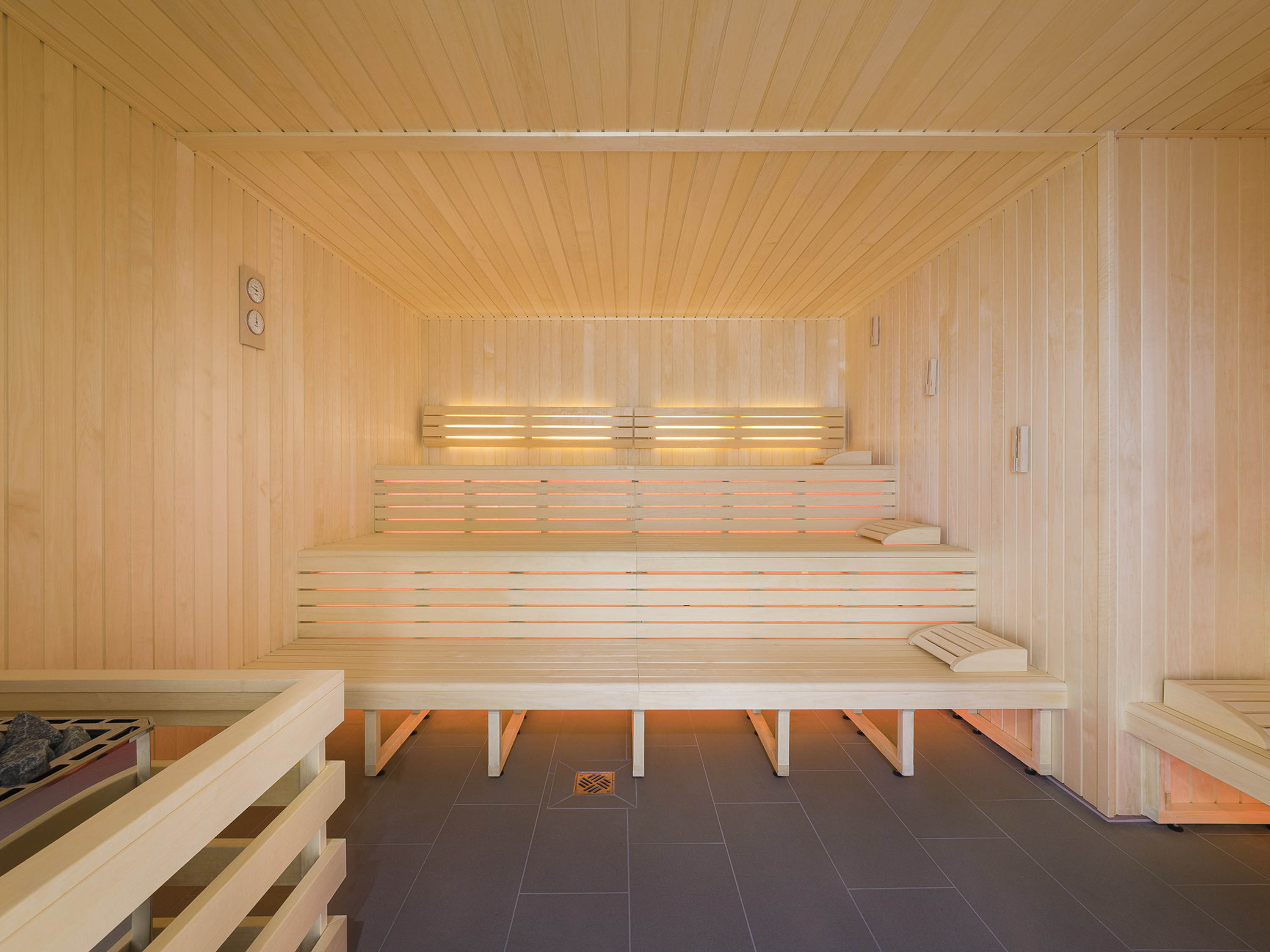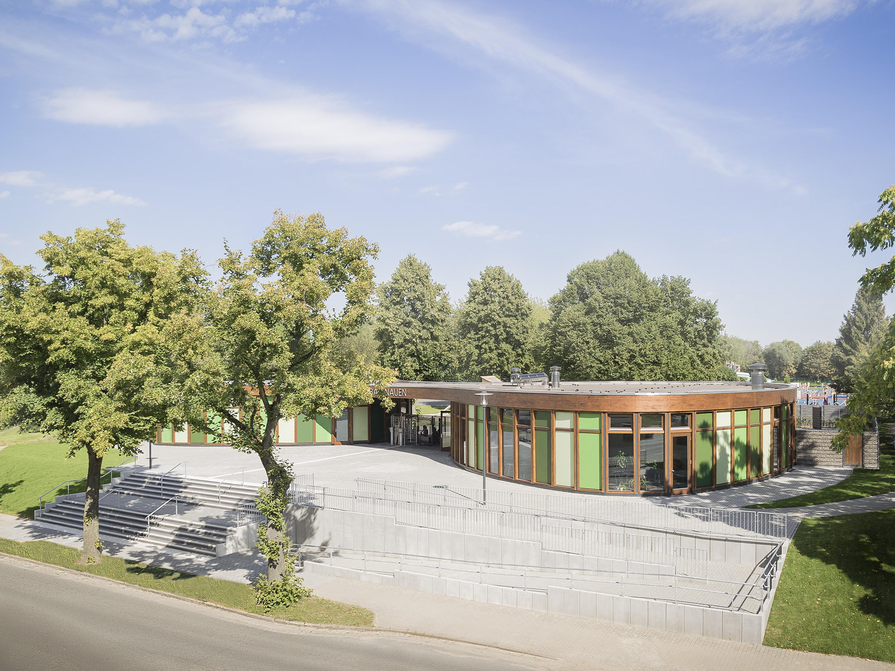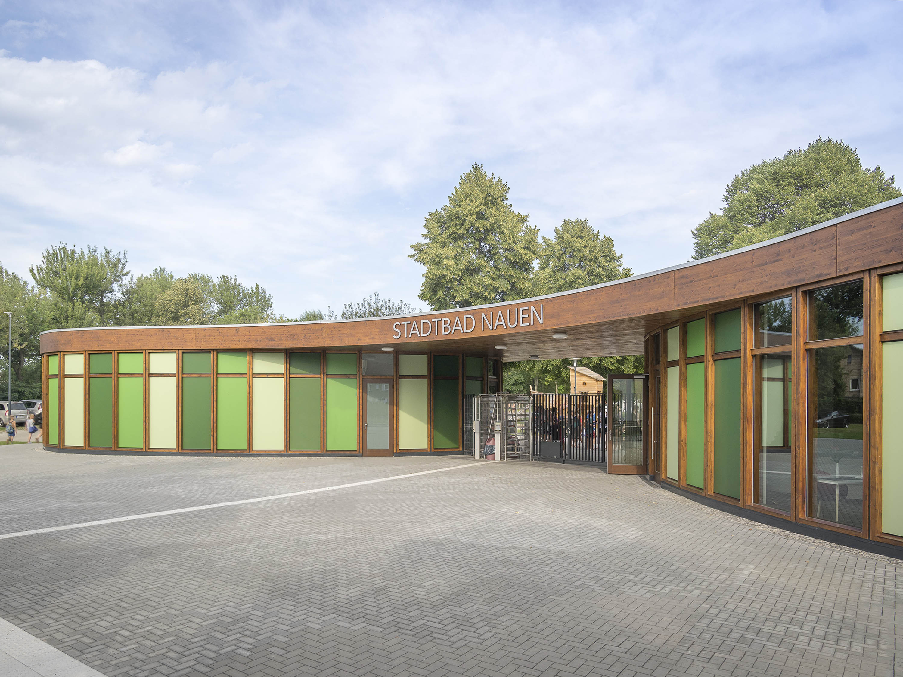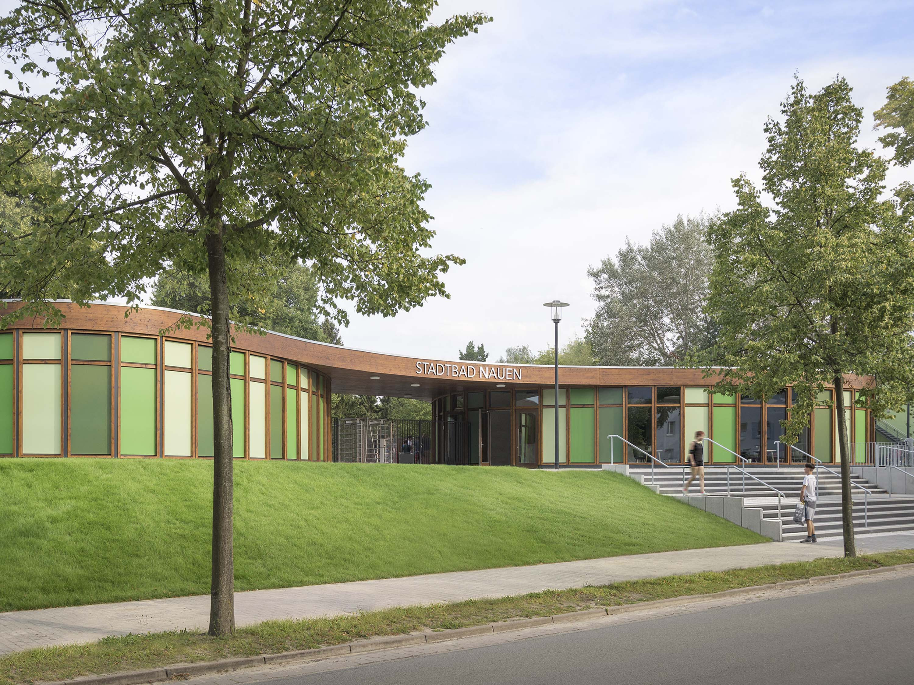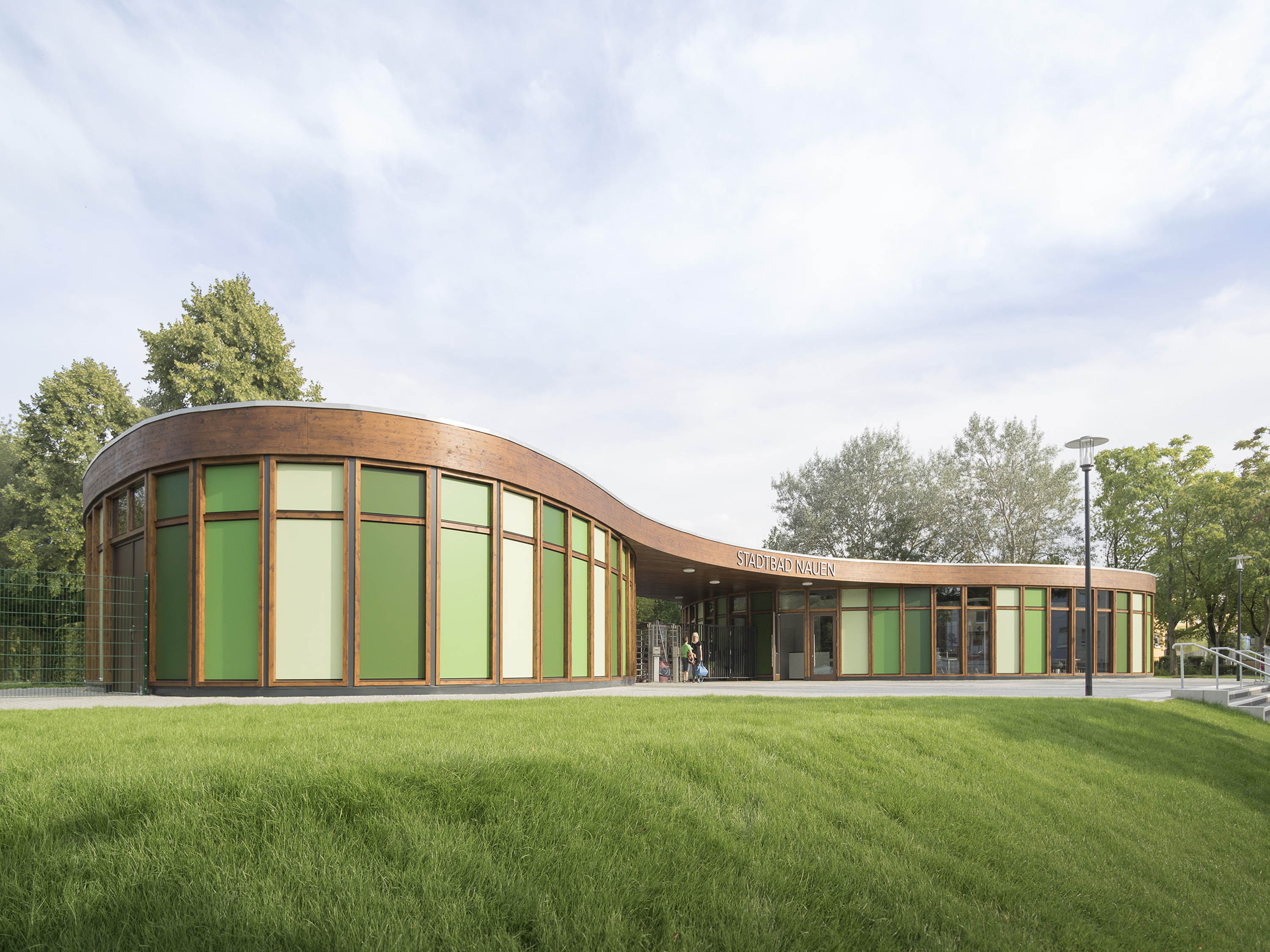 Die organische Form der beiden eingeschossigen Baukörper sowie die Farbpalette der Fassaden harmonieren mit der naturnahen Landschaftsgestaltung. Das markante, geschwungene Attikaband umläuft die beiden Volumen, verbindet sie gleichzeitig und schafft damit eine Torsituation am Eingang zum Stadtbad. Holzrahmen bilden die Tragstruktur und gleichzeitig die Fassade des Gebäudes. Sie besteht aus vorgefertigten polygonalen Holzrahmen mit Zweifachverglasung und gedämmten Holzpaneelen in geschlossenen Fassadenbereichen.