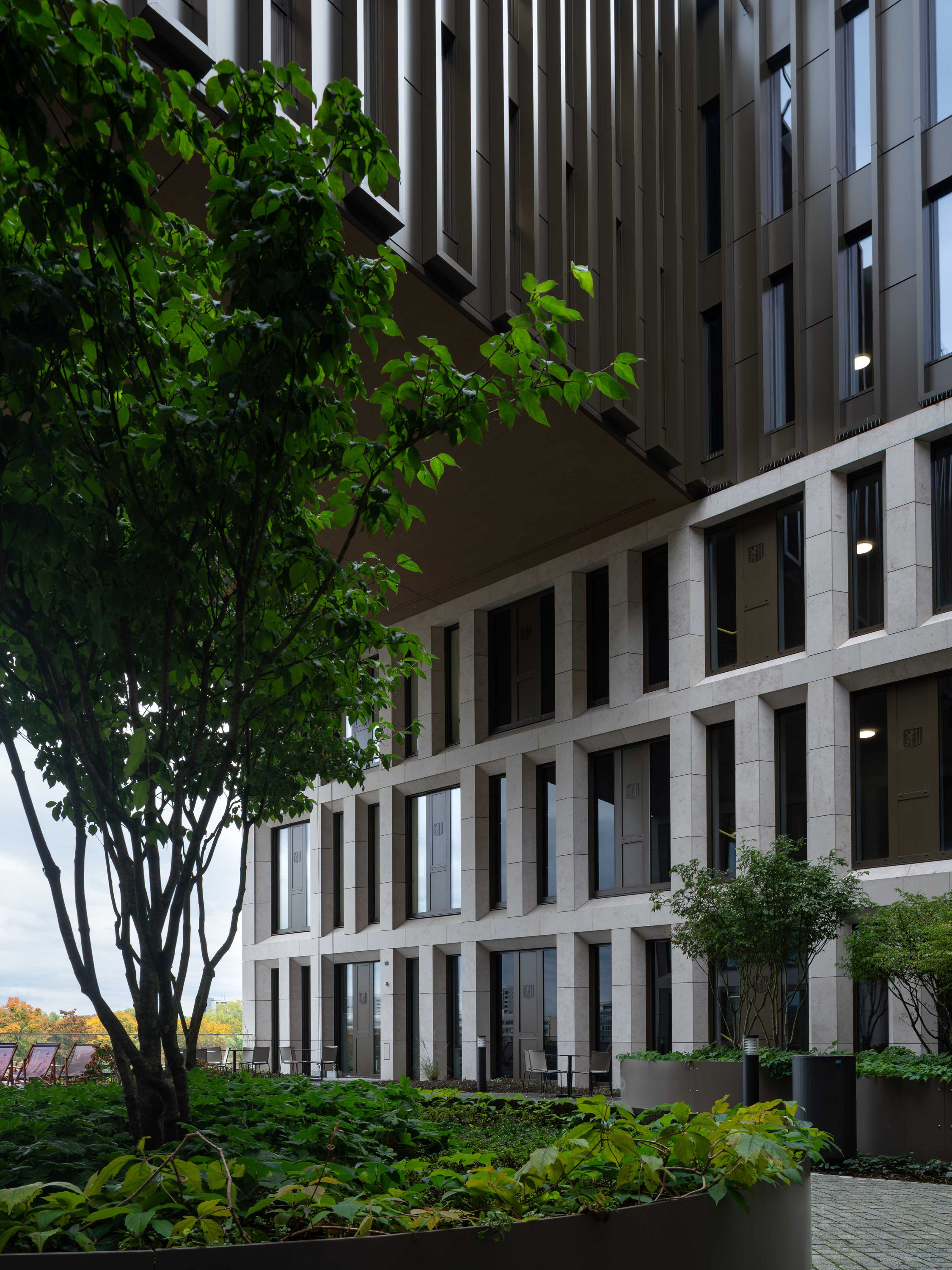 Fünf Bürogeschosse sind der rein dienstlichen Nutzung vorbehalten und um zwei begrünte Innenhöfe organisiert, die für natürliche Belichtung und ein angenehmes Arbeitsumfeld sorgen.
