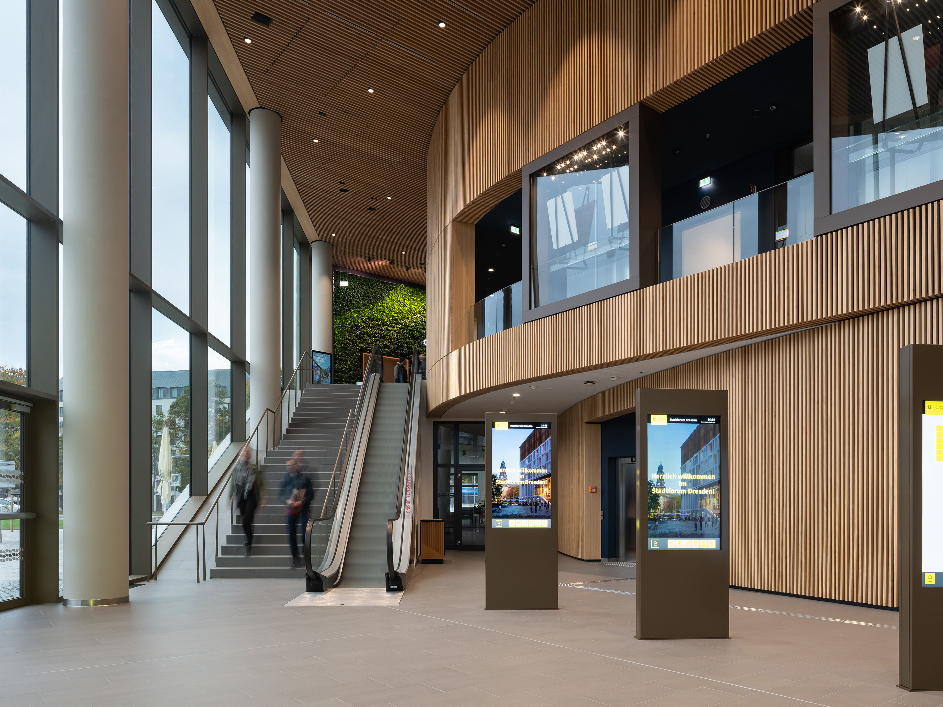 Im Erdgeschoss befinden sich öffentlich zugängliche Bereiche wie das Foyer mit Information, Restaurant, das städtische Fundbüro und Räume zur Bürgerberatung. Die Foyerbereiche knüpfen mit einzelnen bronzefarbenen Elementen und homogen grauem Bodenbelag an die Materialität der Fassade und der Außenanlagen an. Prägendes Element der Räume ist die Lamellen-Wandbekleidung aus Weißtanne.