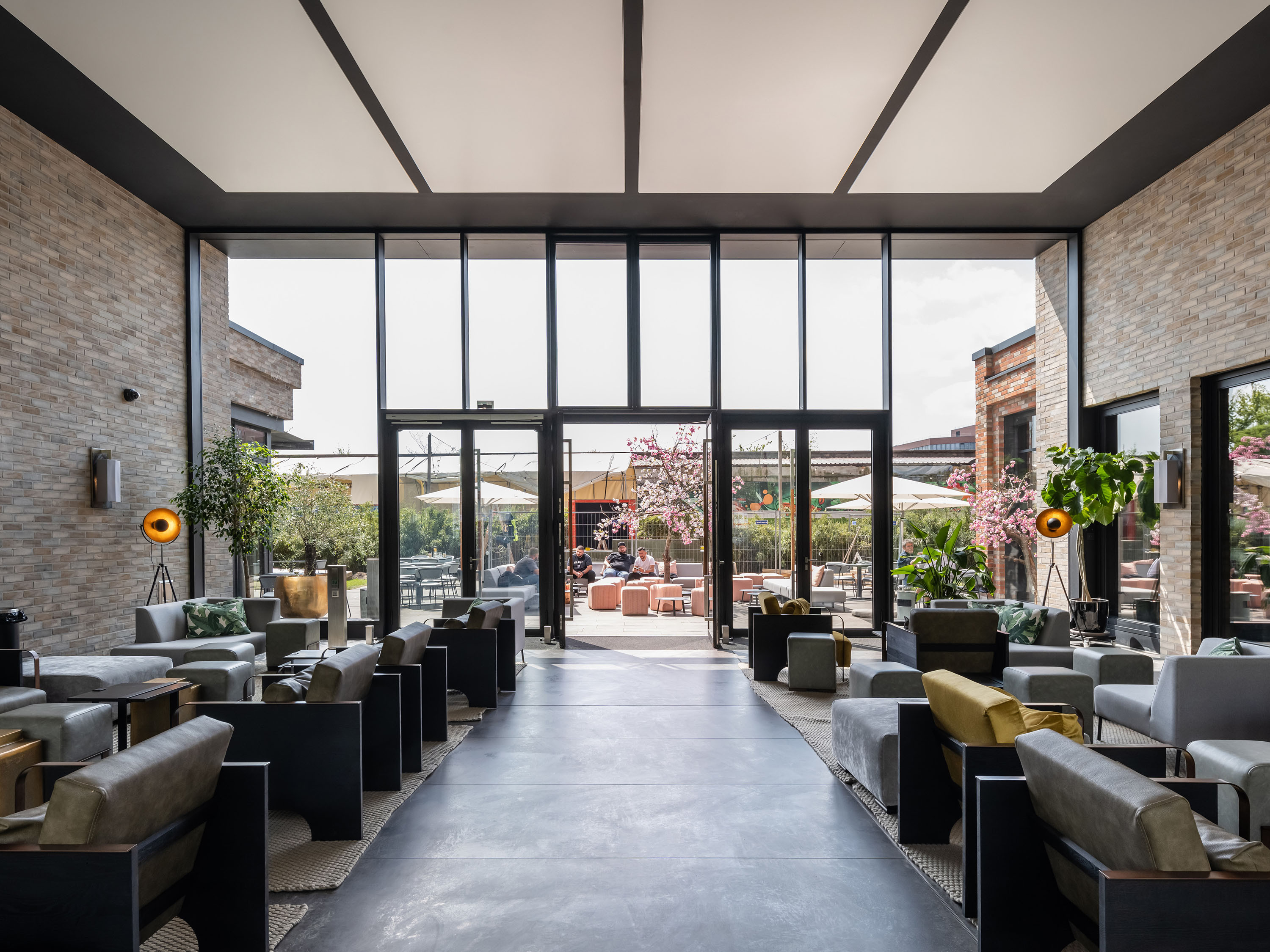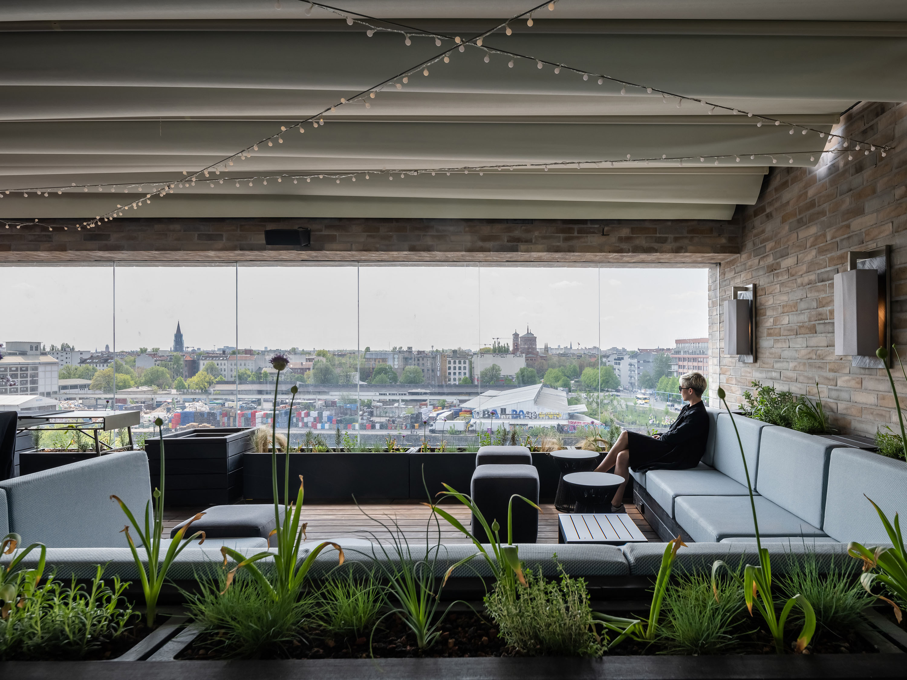 Die Fassade des Büroteils im Gegenzug ist vertikal durch fortlaufende Klinkerbänder in rot-braunem Farbmuster gegliedert. Durch horizontale Klinkerstege in jedem zweiten Geschoss wird hier eine doppelte Geschossigkeit der Büroetagen suggeriert. Die regelmäßige Anordnung der fast quadratischen Fensterfelder gibt der Fassade einen ruhigen, großzügigen Charakter und zitiert die Gestaltung industrieller Lofts.