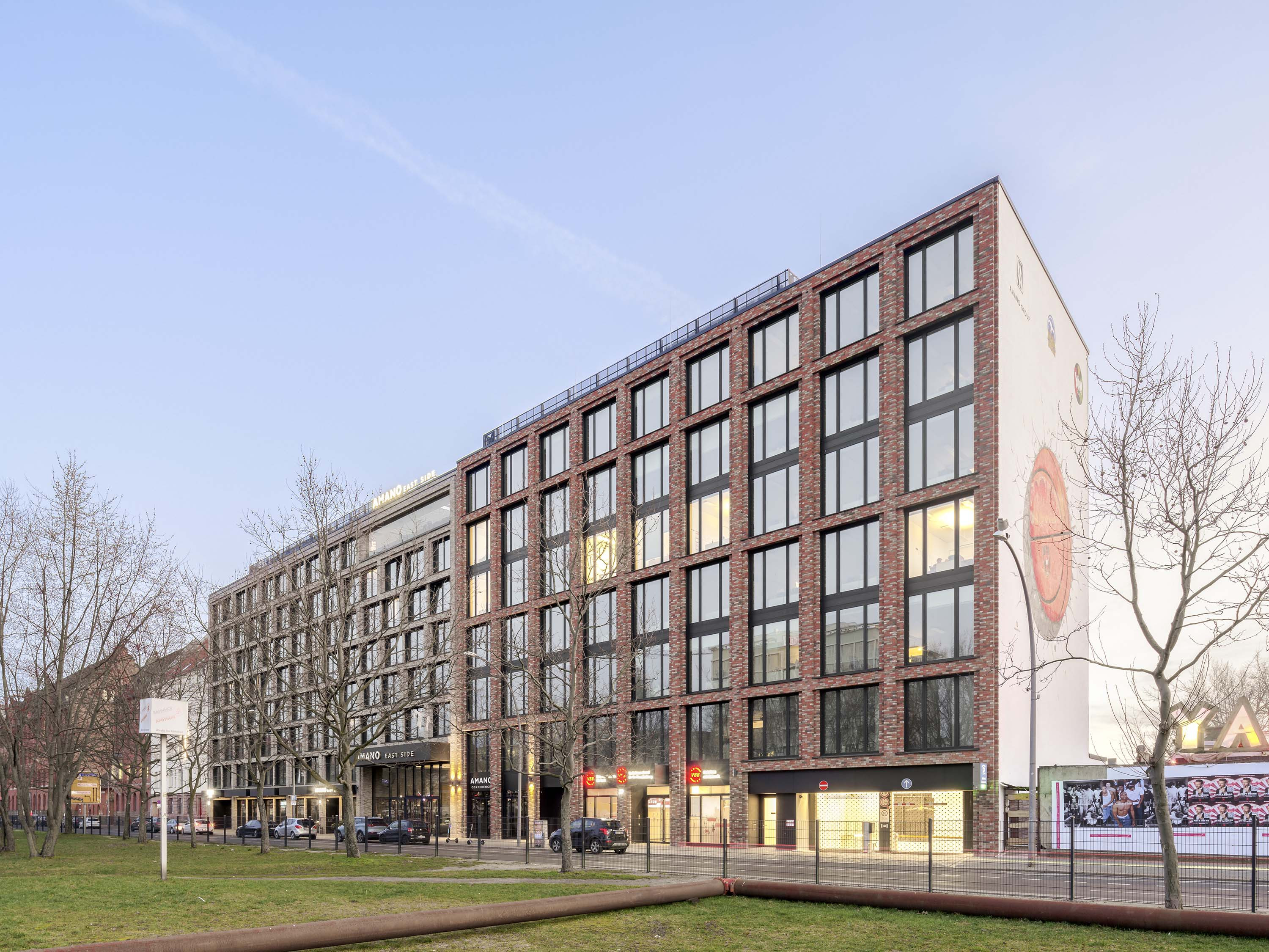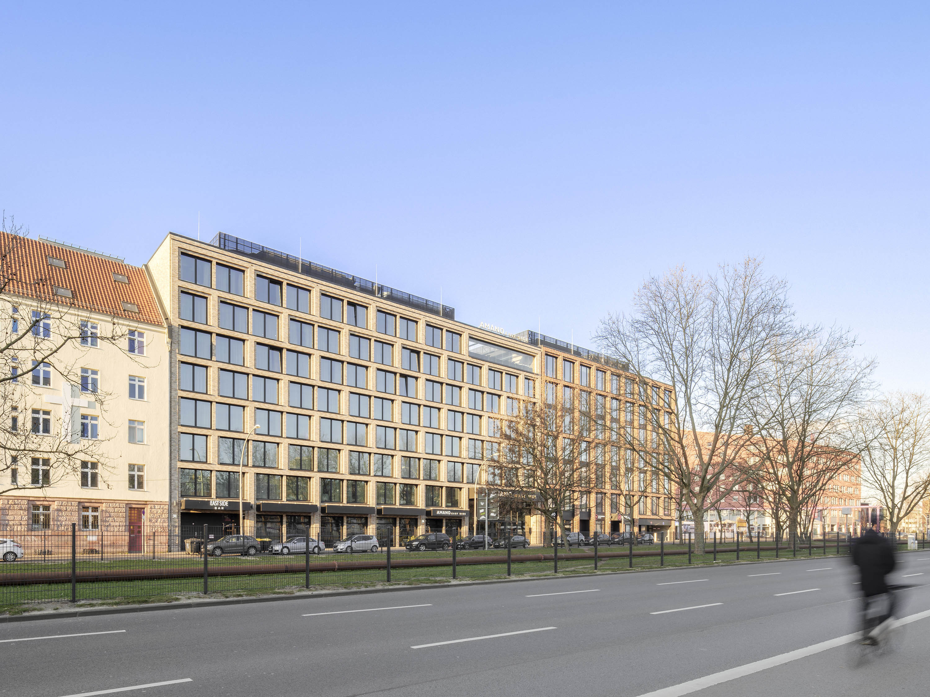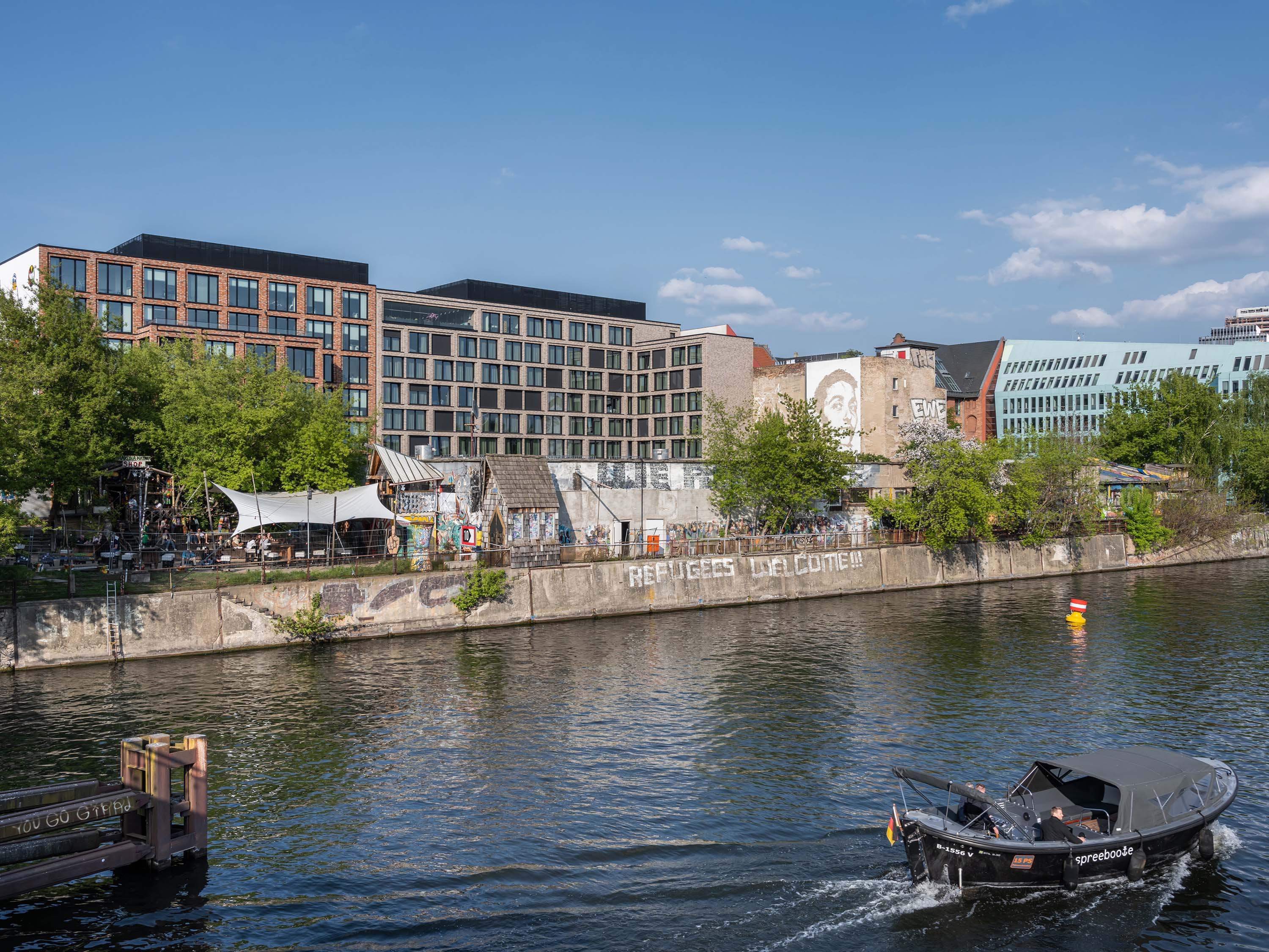Als neue Bebauung wurde ein zweiteiliger Gebäudekomplex geplant, der sich aus einem achtgeschossigen Hotel im östlichen Abschnitt und einem siebengeschossigen Bürogebäude im westlichen Abschnitt mit einer gemeinsam genutzten, zweigeschossigen Tiefgarage zusammensetzt. Im Bereich des Hotels, an der Grenze zum Bürogebäude, ist der Komplex durch ein zweigeschossiges, 12 m breites „Spreefenster“ unterbrochen, das als Sichtachse dient.
