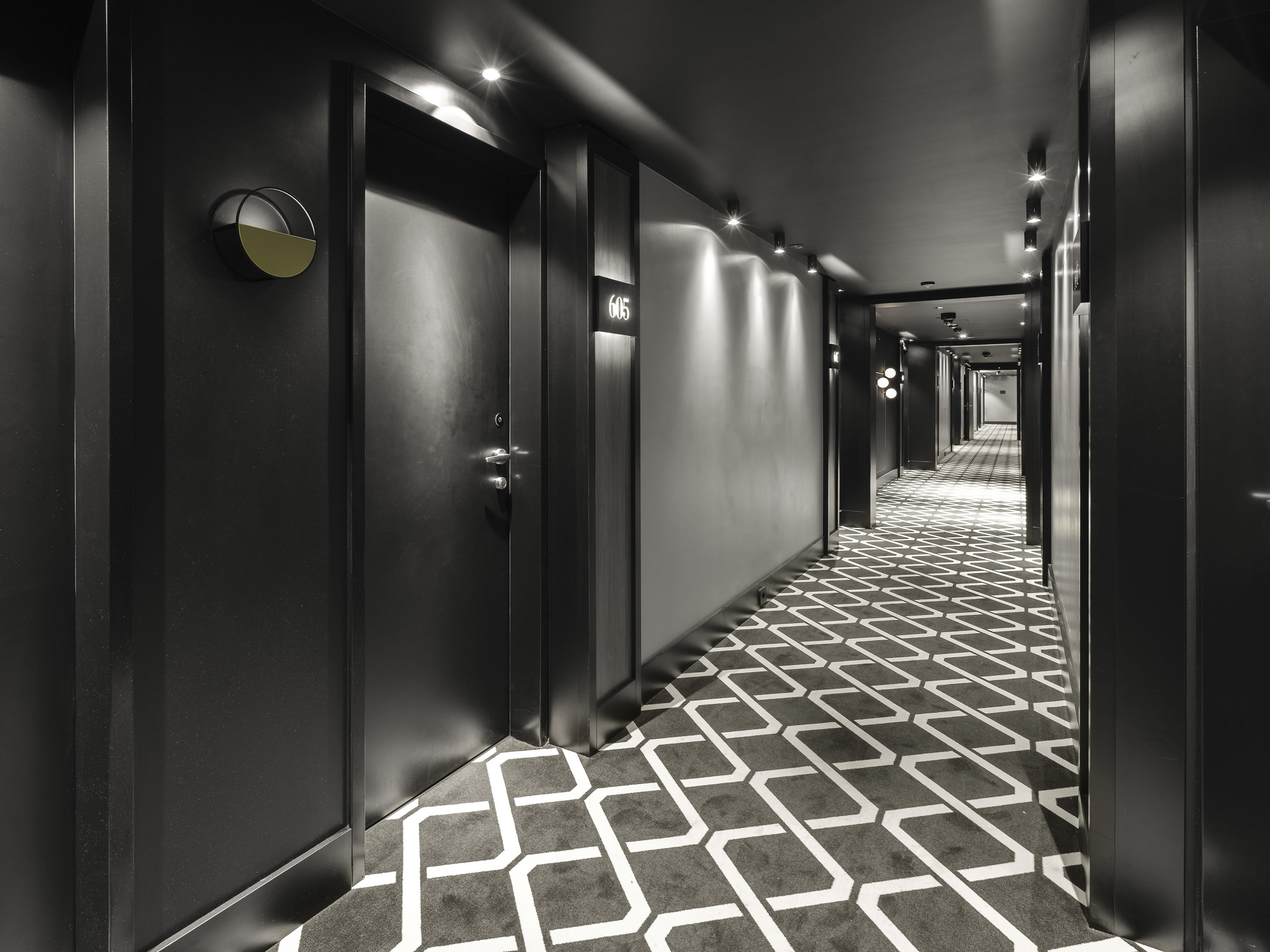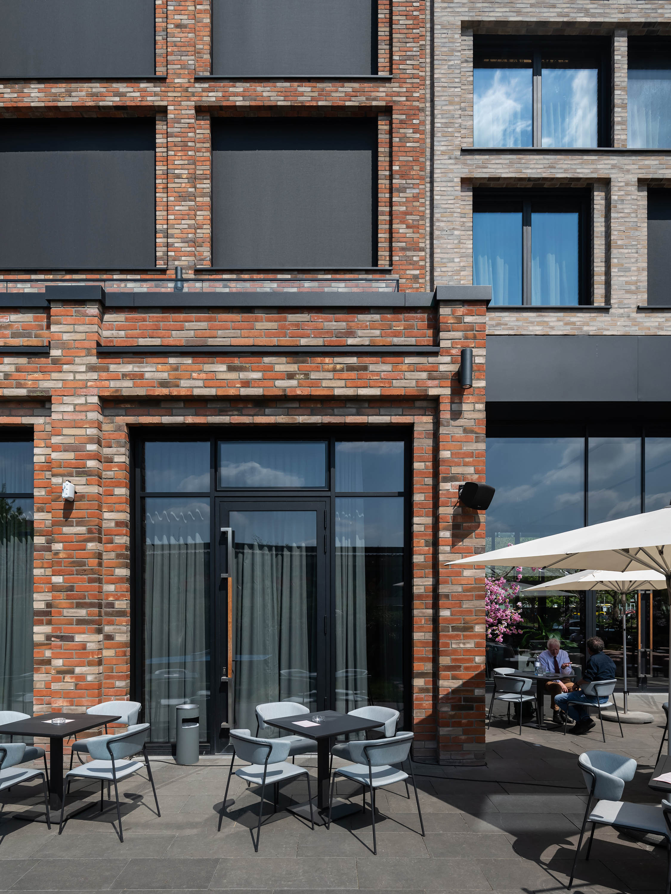 Die Fassade des Hotels ist in alternierende Fensterfelder aufgeteilt, bei denen jeweils zwei Fenster durch Klinkerstege mit matt-pastellfarbenen und changierenden Farbmuster getrennt werden.