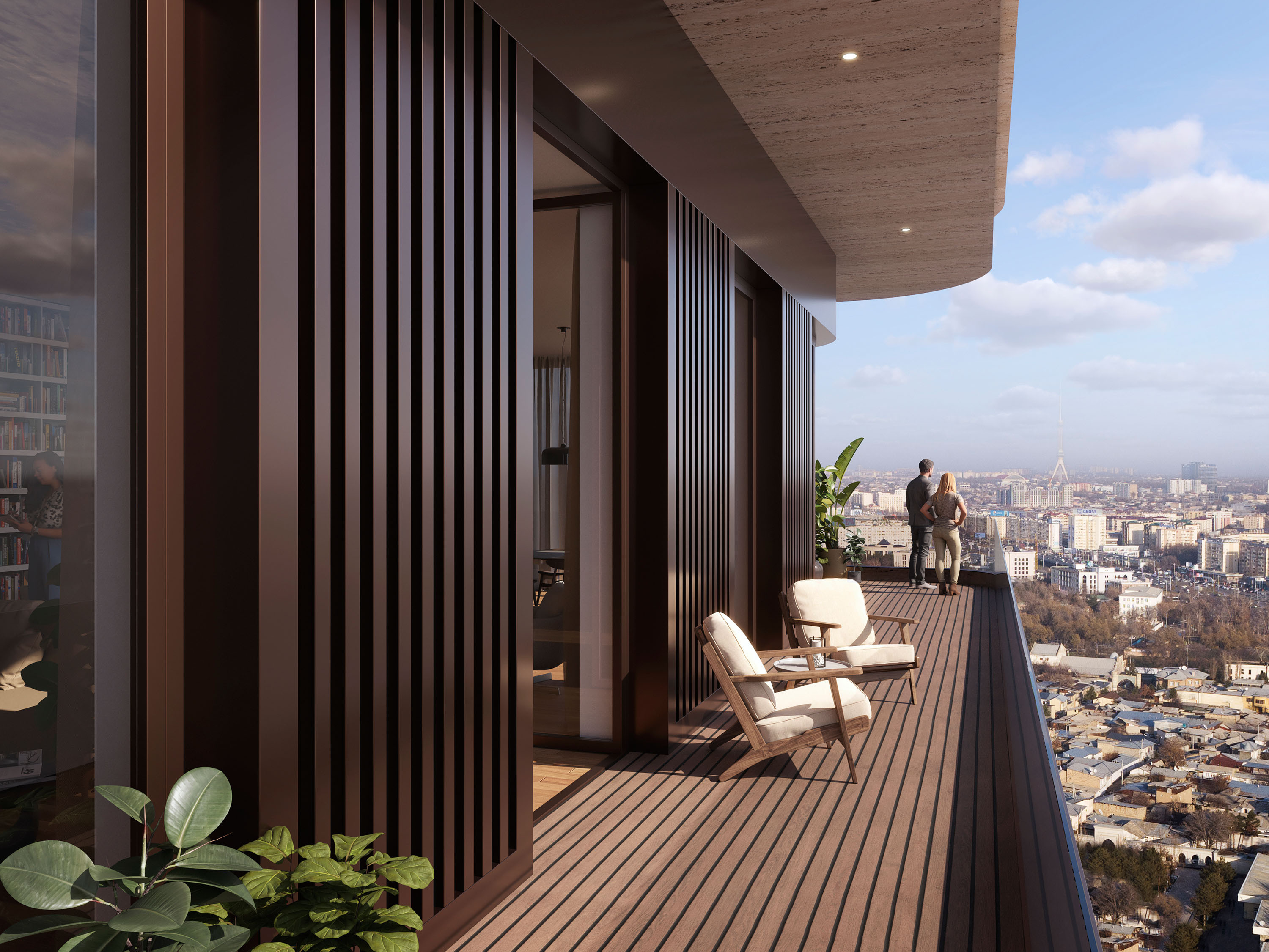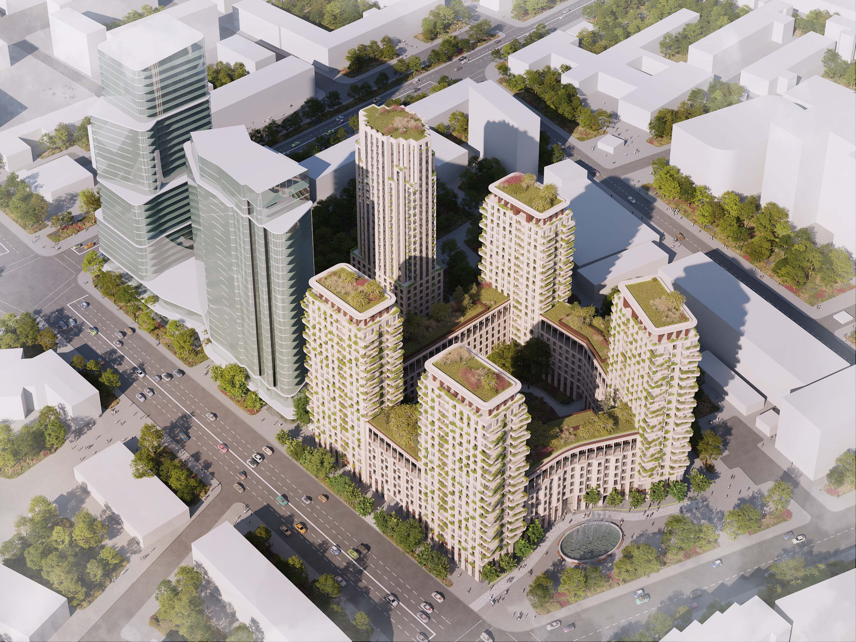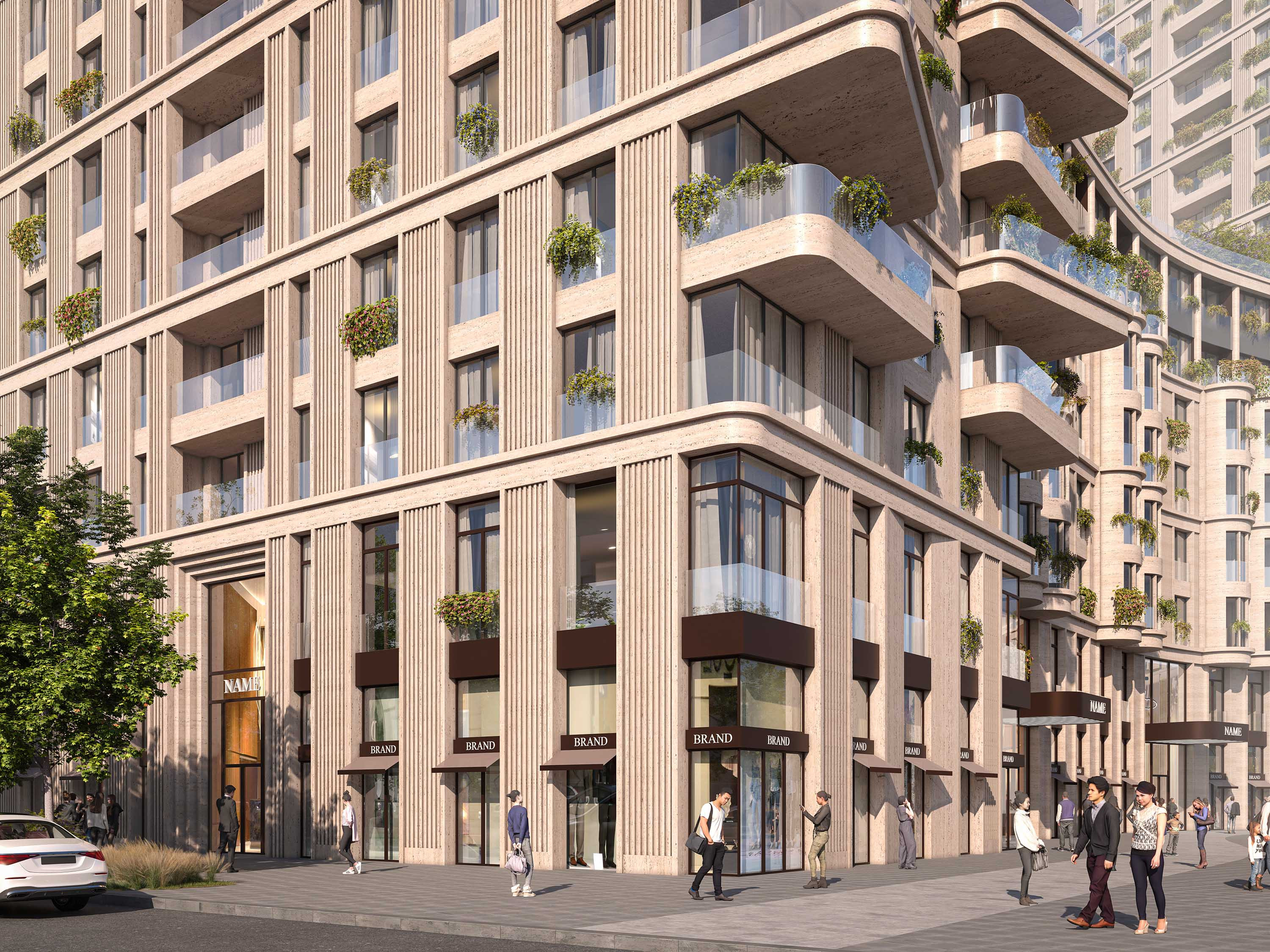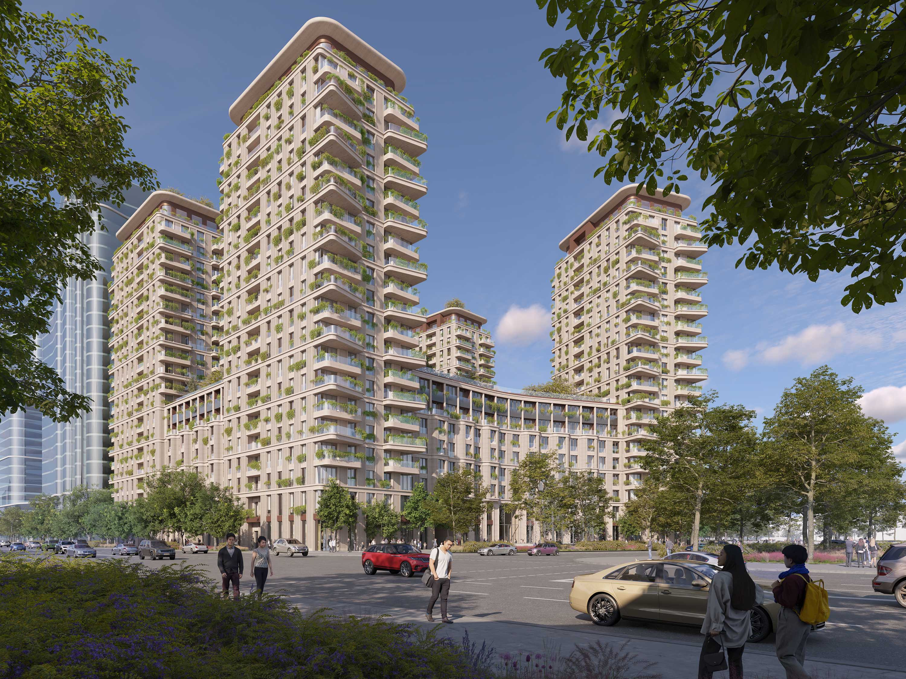 Der Komplex besteht aus einem straßenbegleitenden Hochhausblock, einem Carré mit gesichertem Eingangsbereich zum grünen Innenhof und vier Türmen innerhalb eines Parks. Alle drei Elemente sind mit sehr detailreichen Natursteinfassaden versehen sowie mit großen Fenstern und breiten Balkonen. Auf dem Dach des Hochhauses ist ein Restaurant geplant. Das Erdgeschoss sowie ein Teil des ersten Geschosses sind für die Öffentlichkeit zugänglich und beherbergen Luxusgeschäfte und Restaurants.