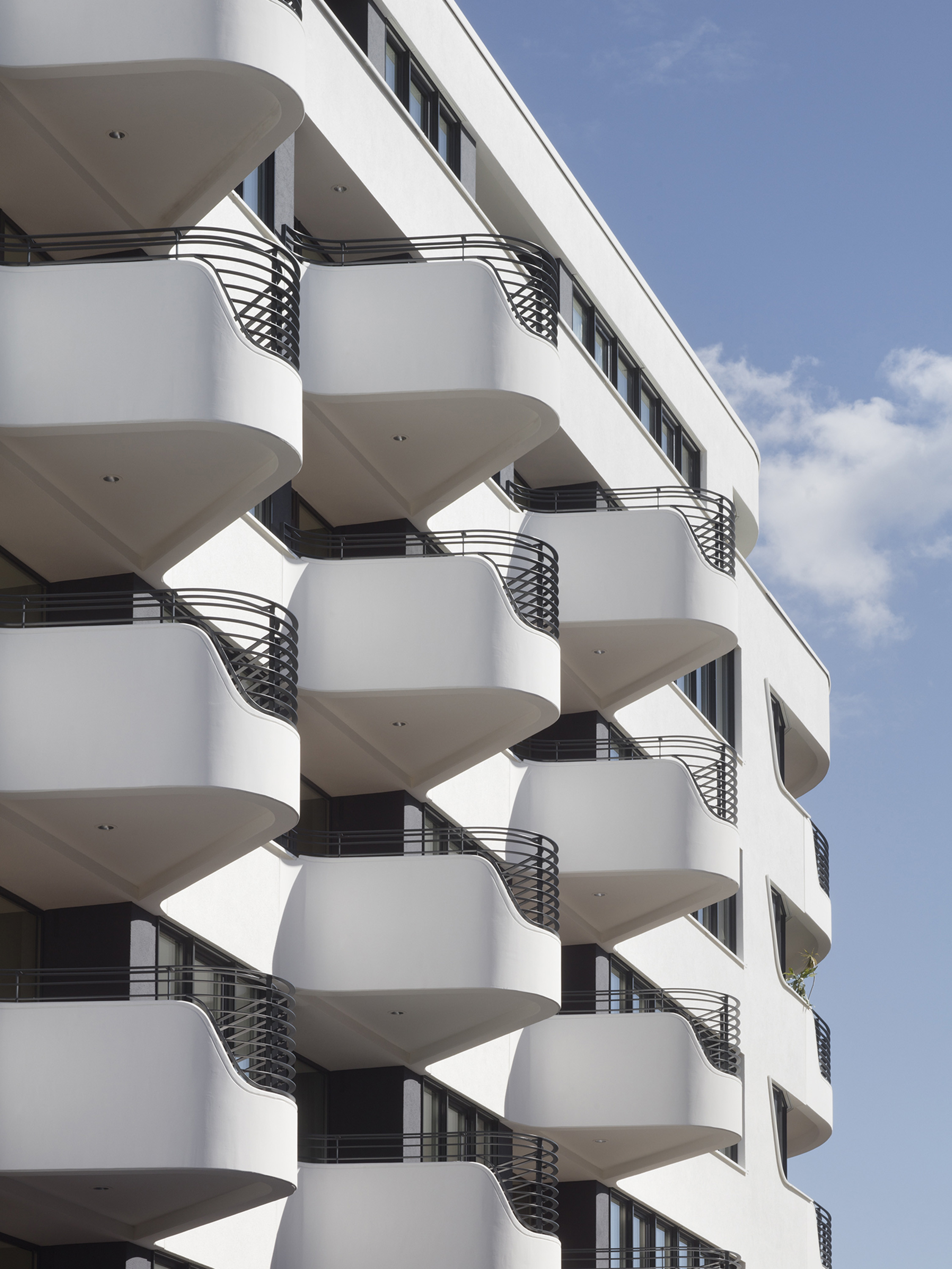 Die Details folgen dem Leitmotiv des Bogens. Er findet sich in den abgerundeten, teils ornamental geführten Außen- und Innenkanten oder etwa am Wellenverlauf der Balkone. Die hohe Plastizität des Volumens wird neben den abgerundeten Ecken durch das Zusammenspiel von eingezogenen und langbogig auskragenden Balkonen aus aufwendigen Betonfertigteilen erreicht.