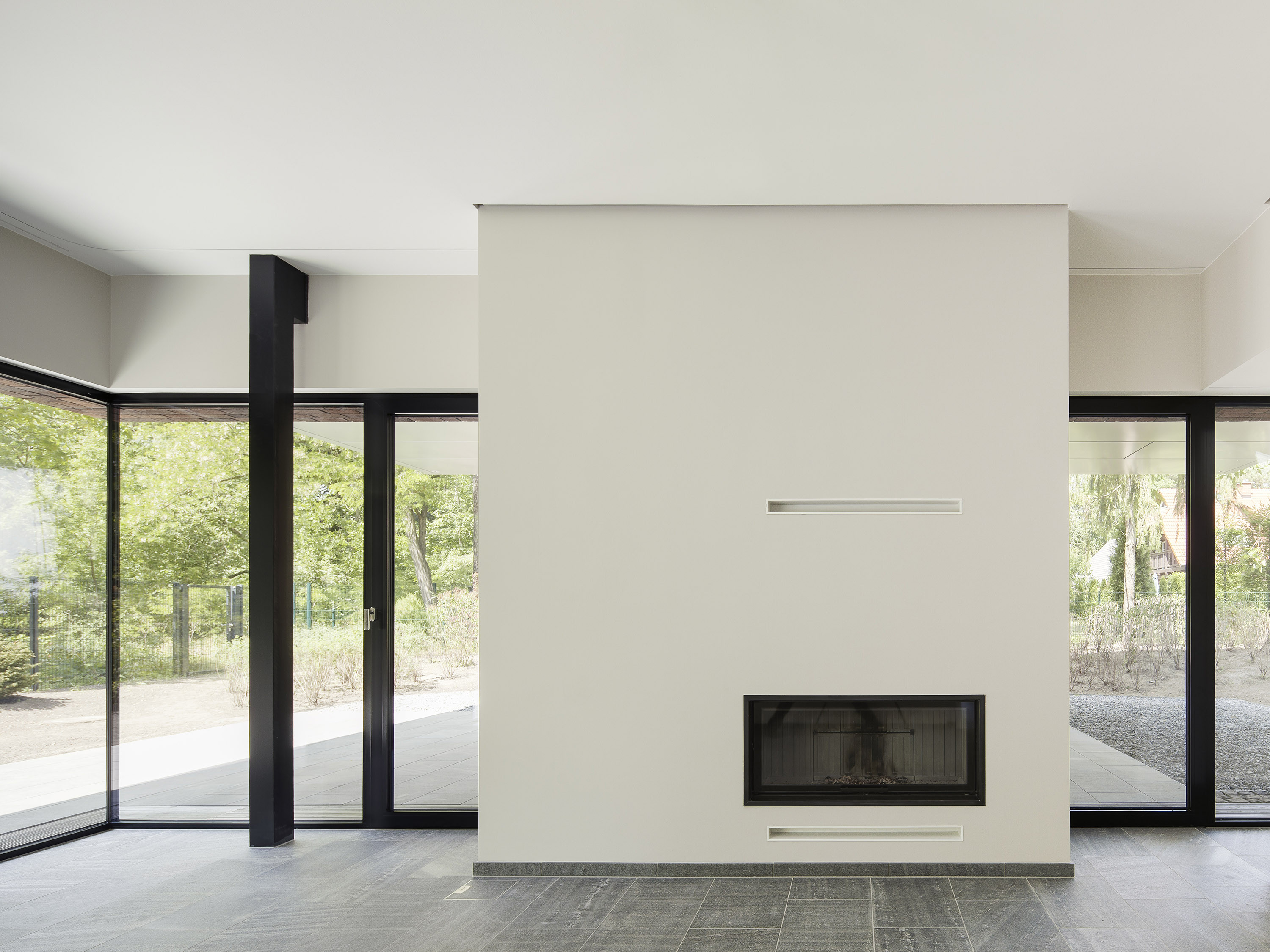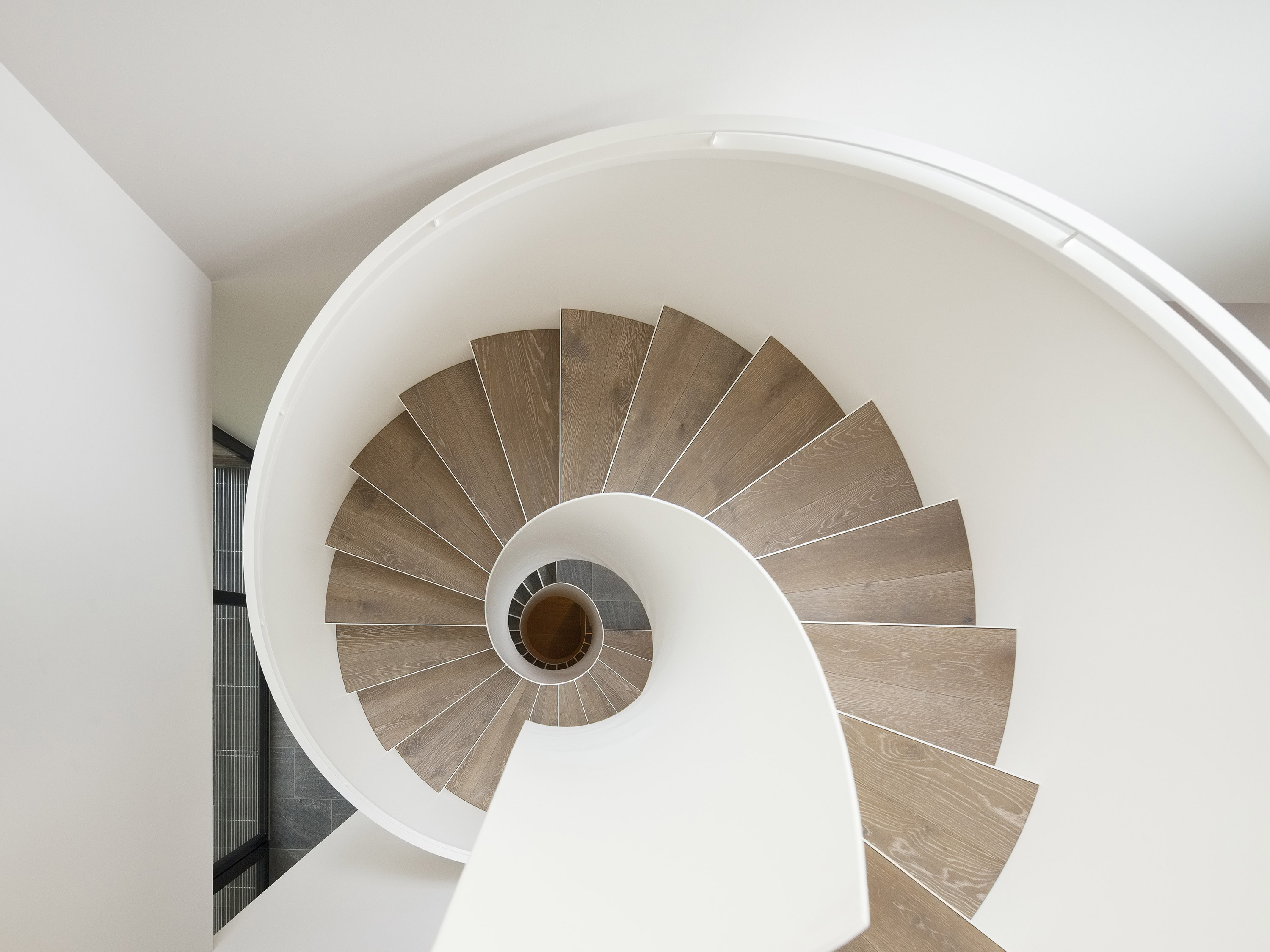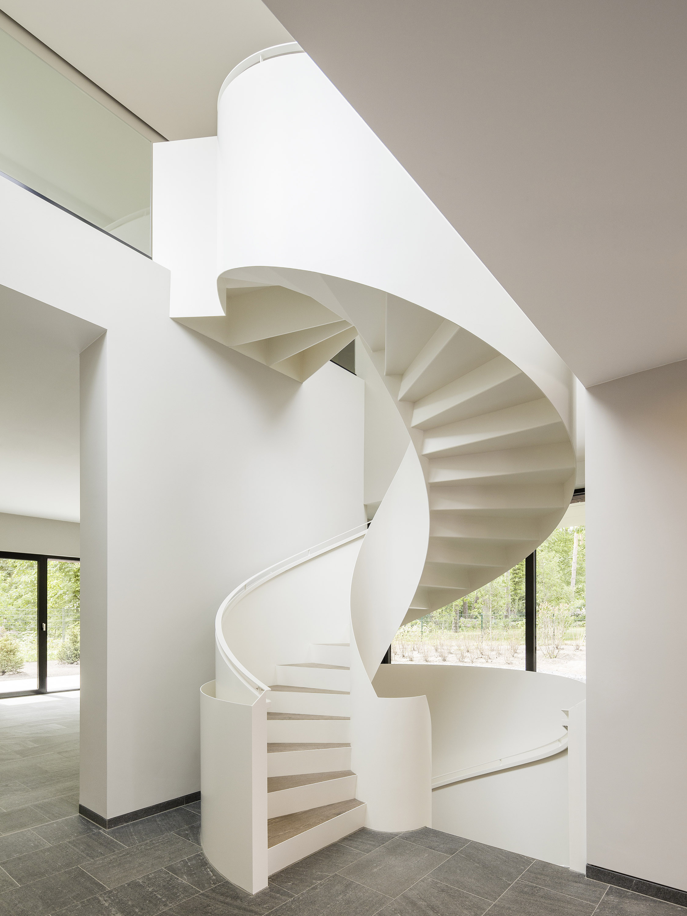 Das Erdgeschoss umfasst Wohn- und Essbereiche, Küche, Arbeitszimmer, Garderobe, Gäste-WC und einen Hauswirtschaftsraum. Ein Kamin vervollständigt die wohnliche Atmosphäre. Im Obergeschoss befinden sich drei Schlafzimmer. Durch alle Geschosse hindurch fungiert die skulpturale Wendeltreppe funktional und formal als verbindendes Element.