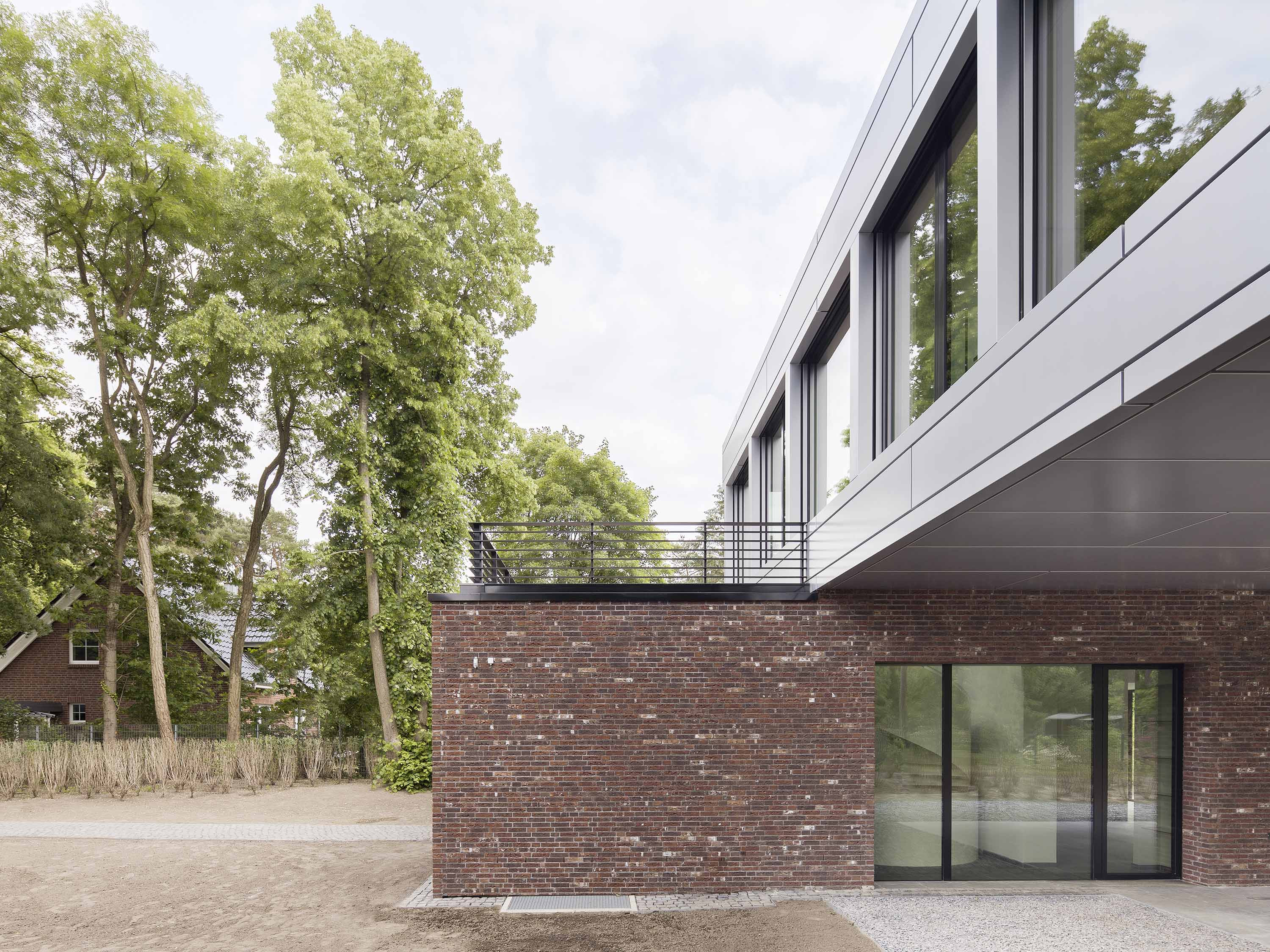 Prägend für die Außenerscheinung des zweigeschossigen Baus sind das Flachdach und die weitläufige Terrasse im ersten Obergeschoss. Die weite Auskragung schafft an der Südseite des Hauses einen eingefassten und vielseitig nutzbaren Vorplatz.