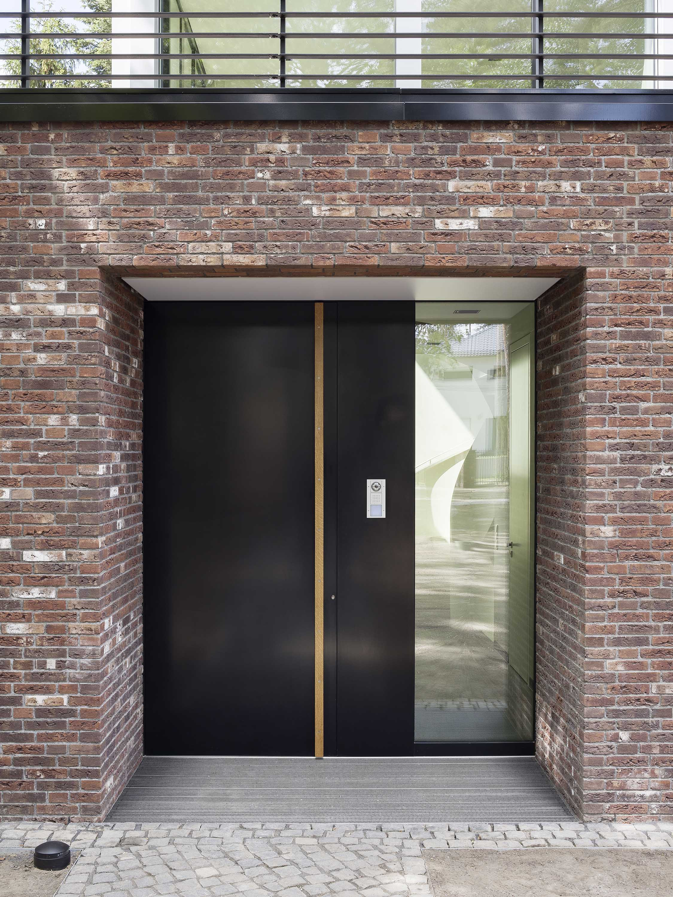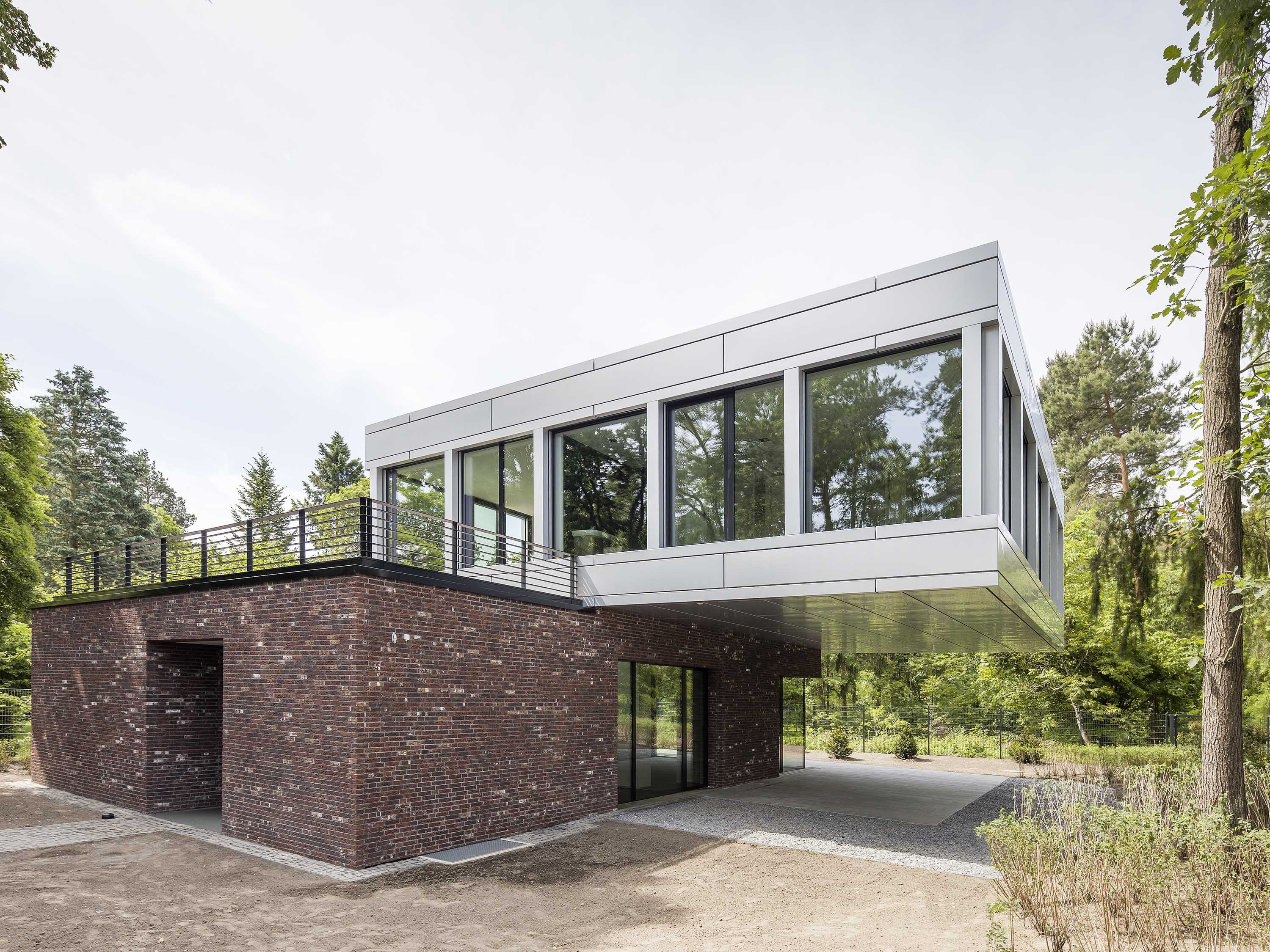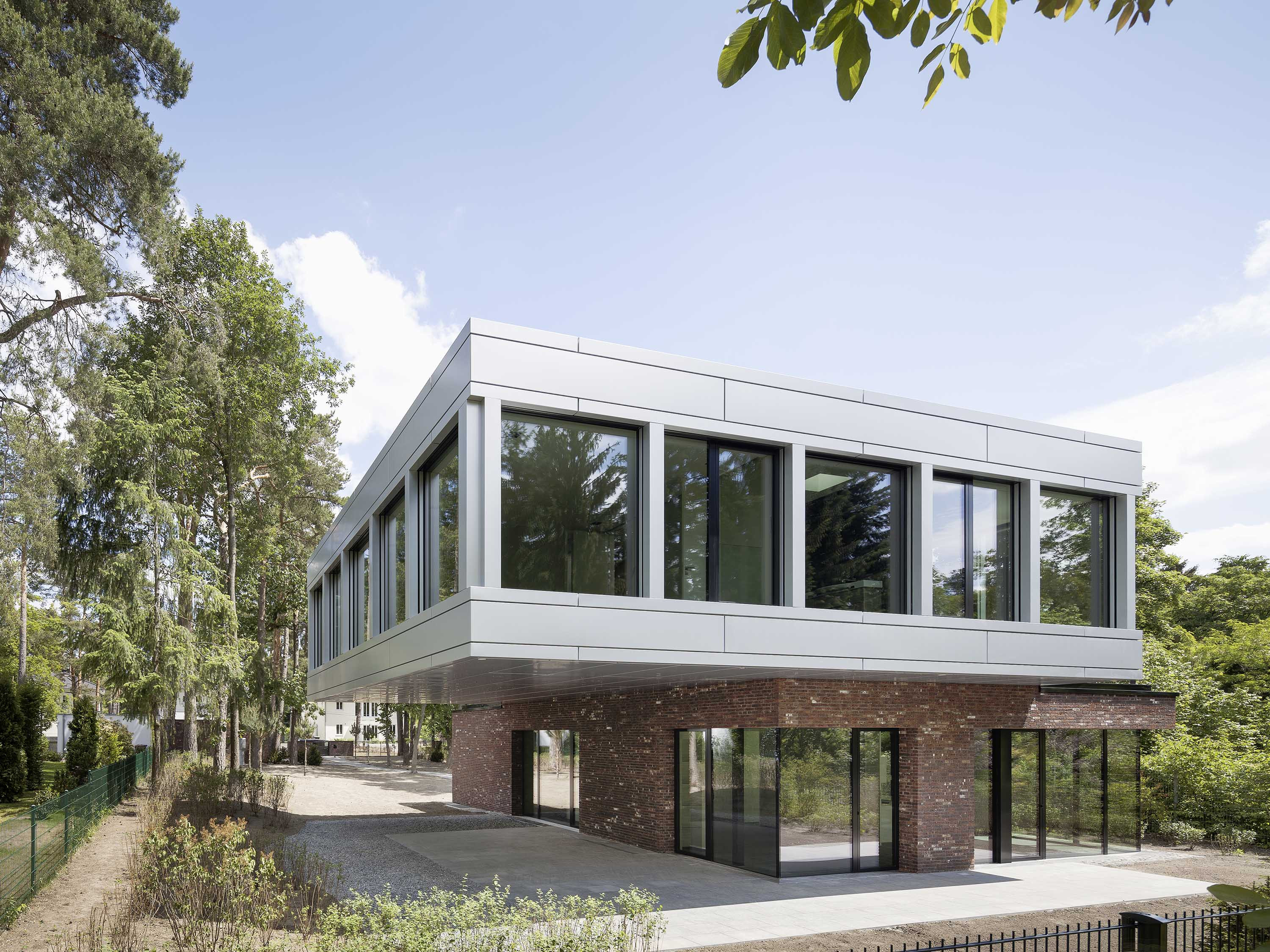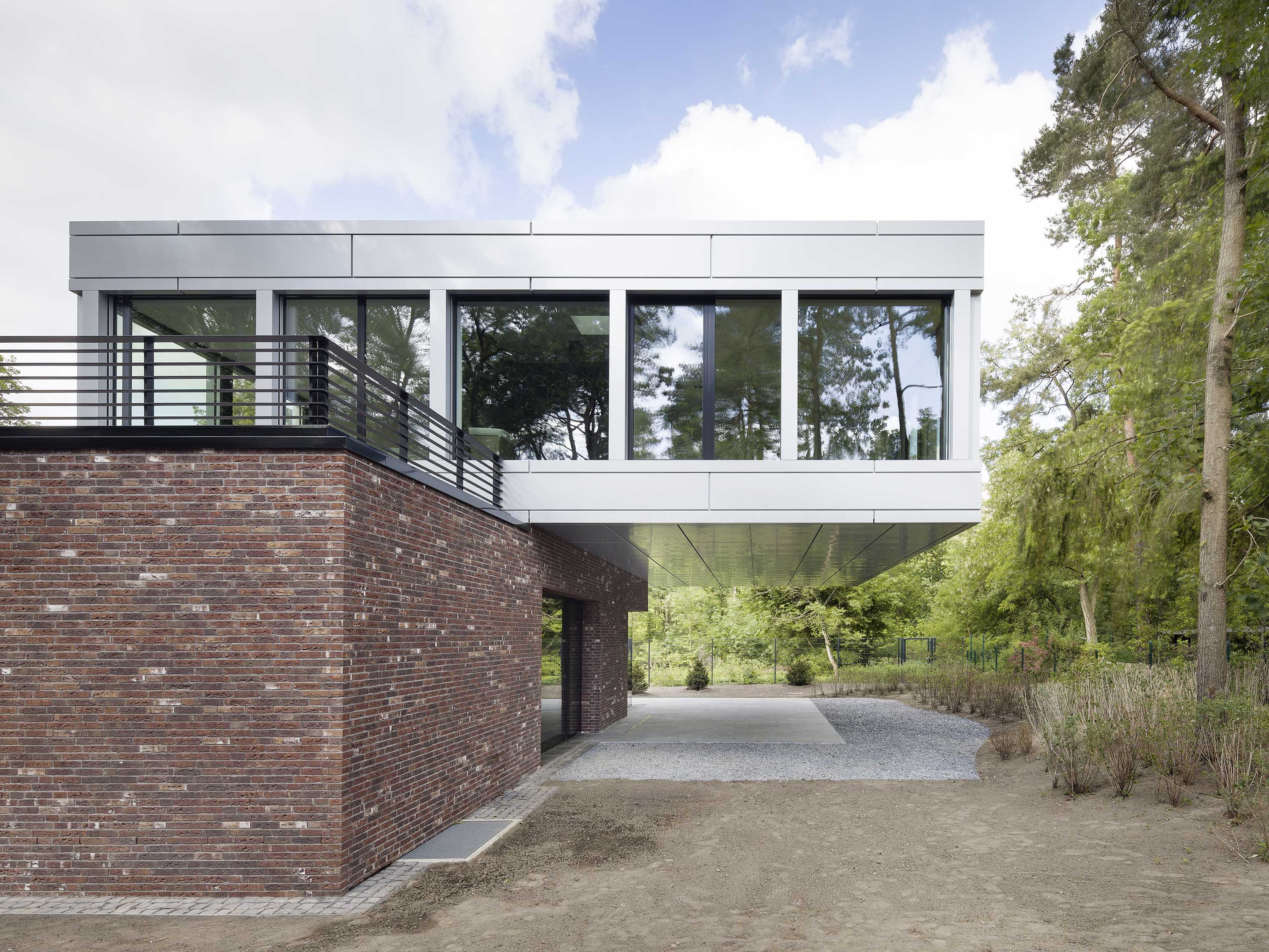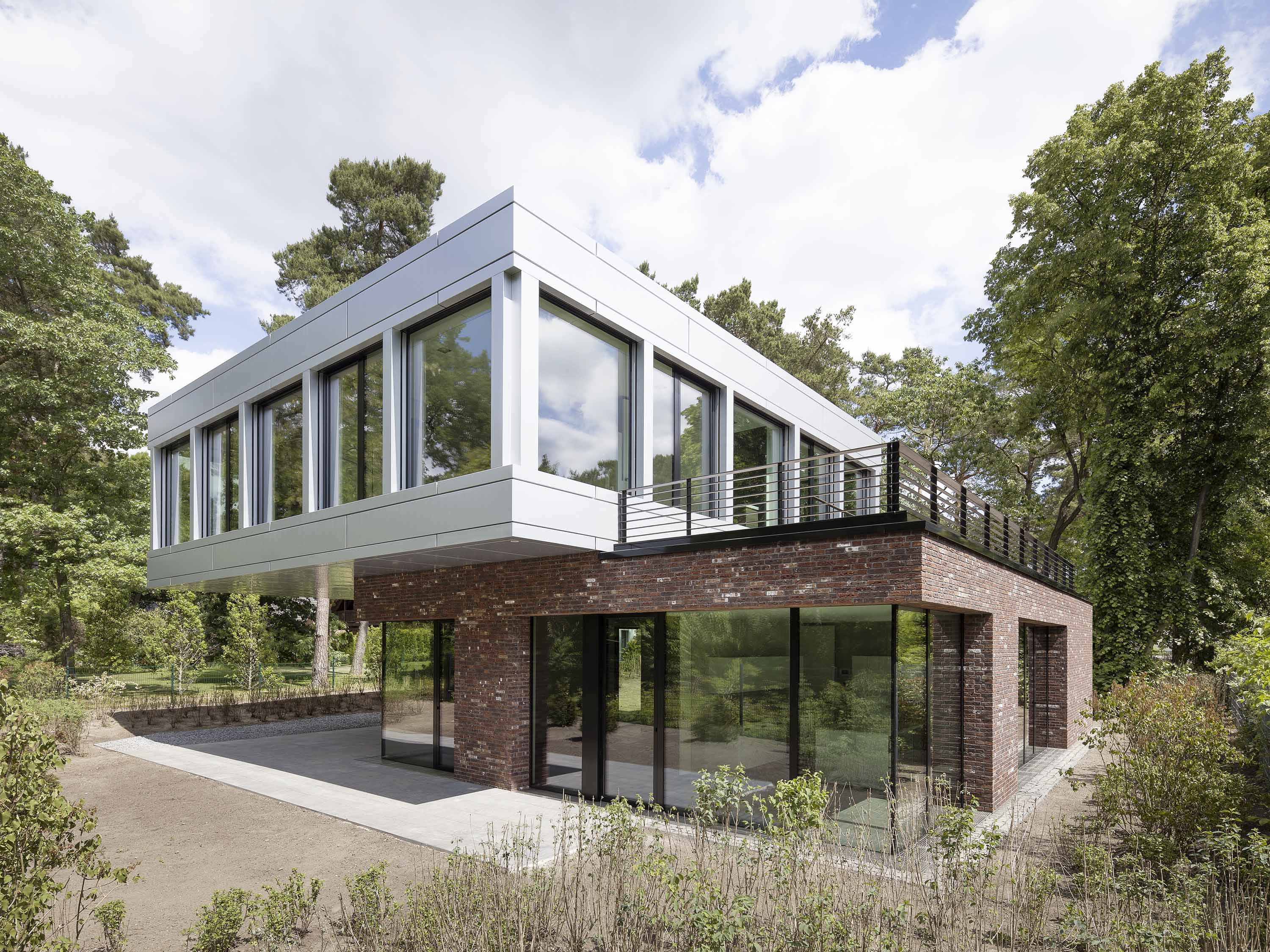 Der massive Sockelbereich ist ebenerdig gesetzt und in Backstein ausgeführt. Seine Fassaden sind zum Süden mit breiten Fensterfronten versehen. Das Obergeschoss ist allseits geschosshoch verglast und bietet den Bewohnern somit uneingeschränkte Aussicht auf den Wald und Garten.