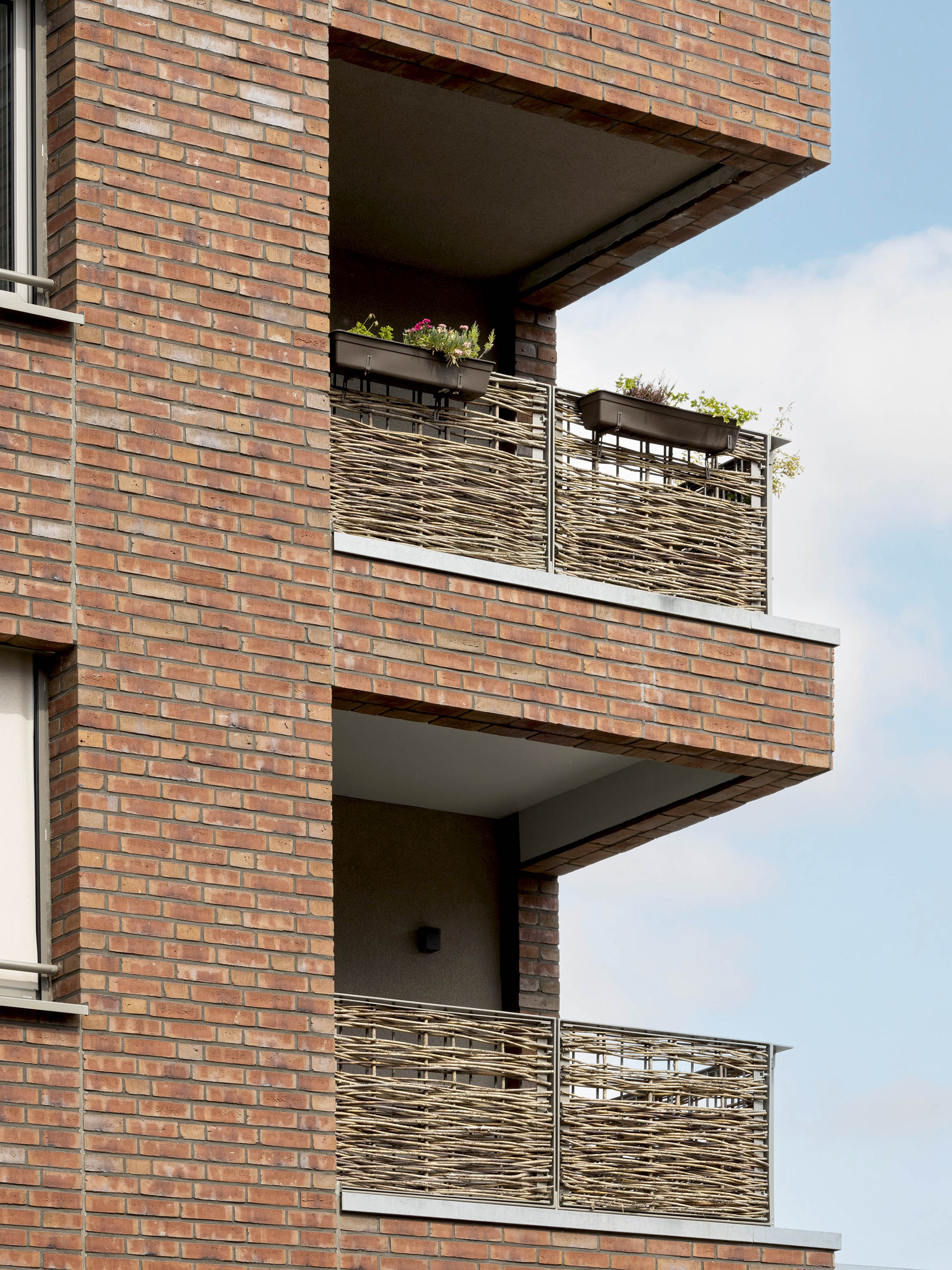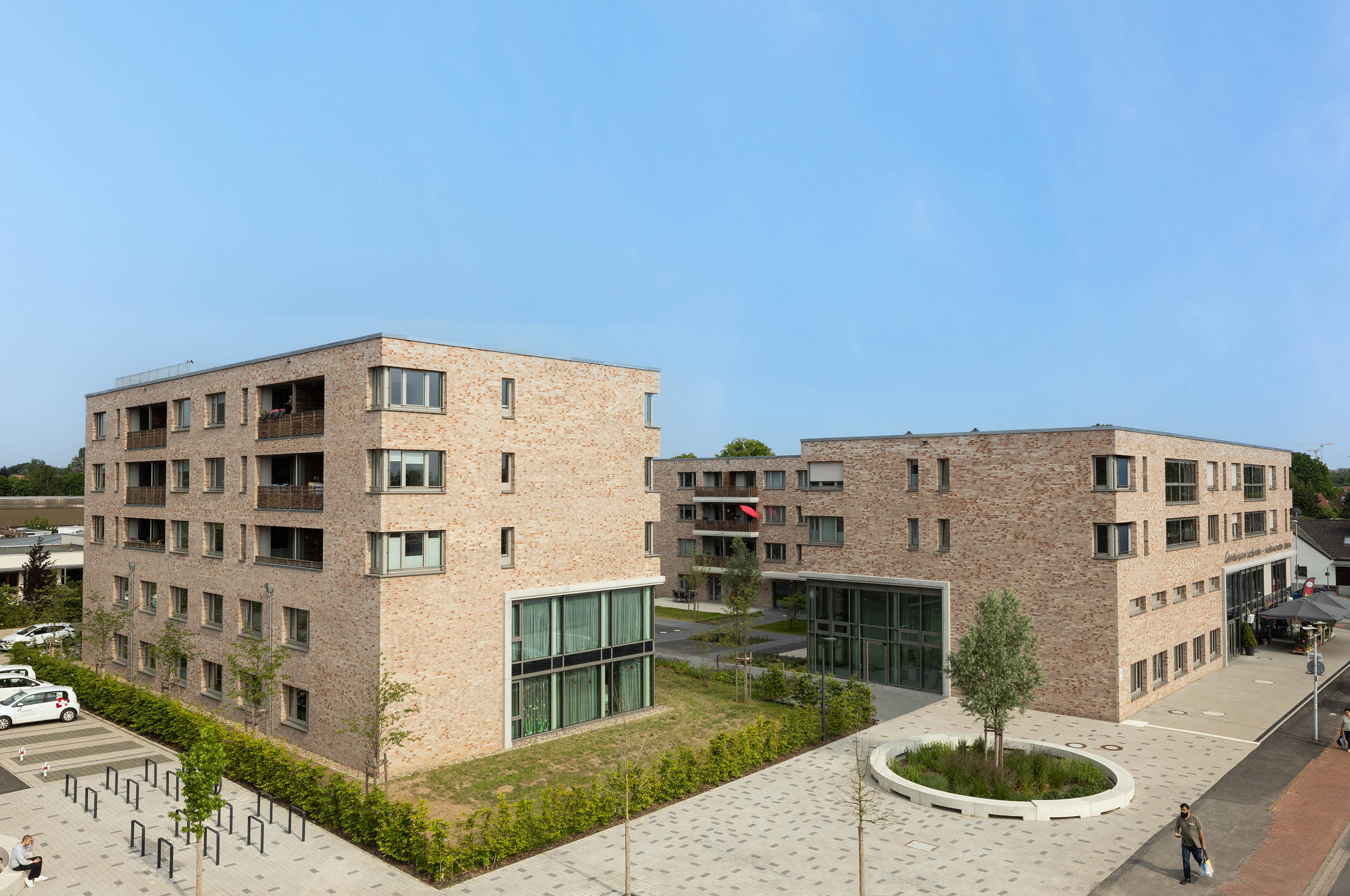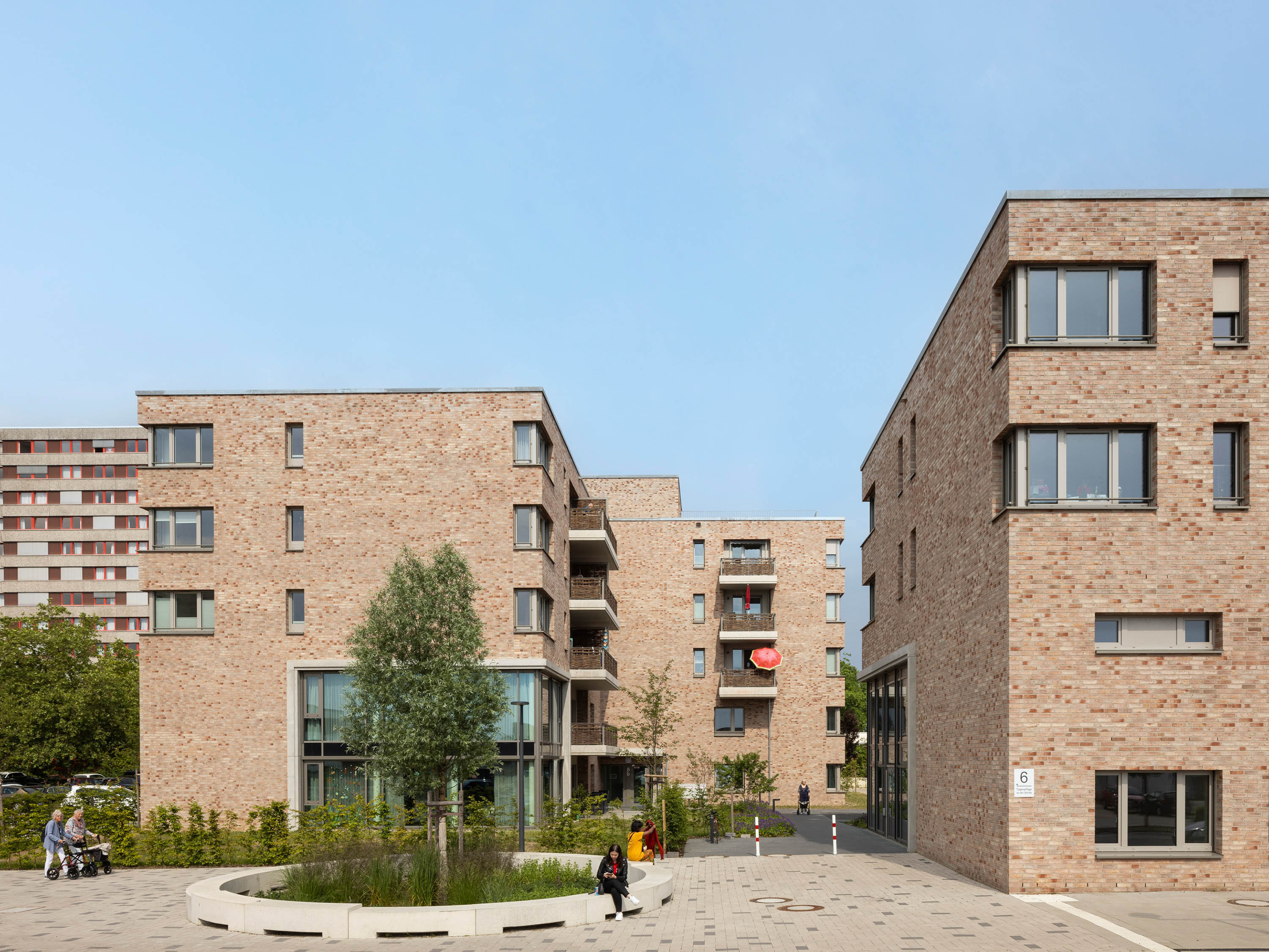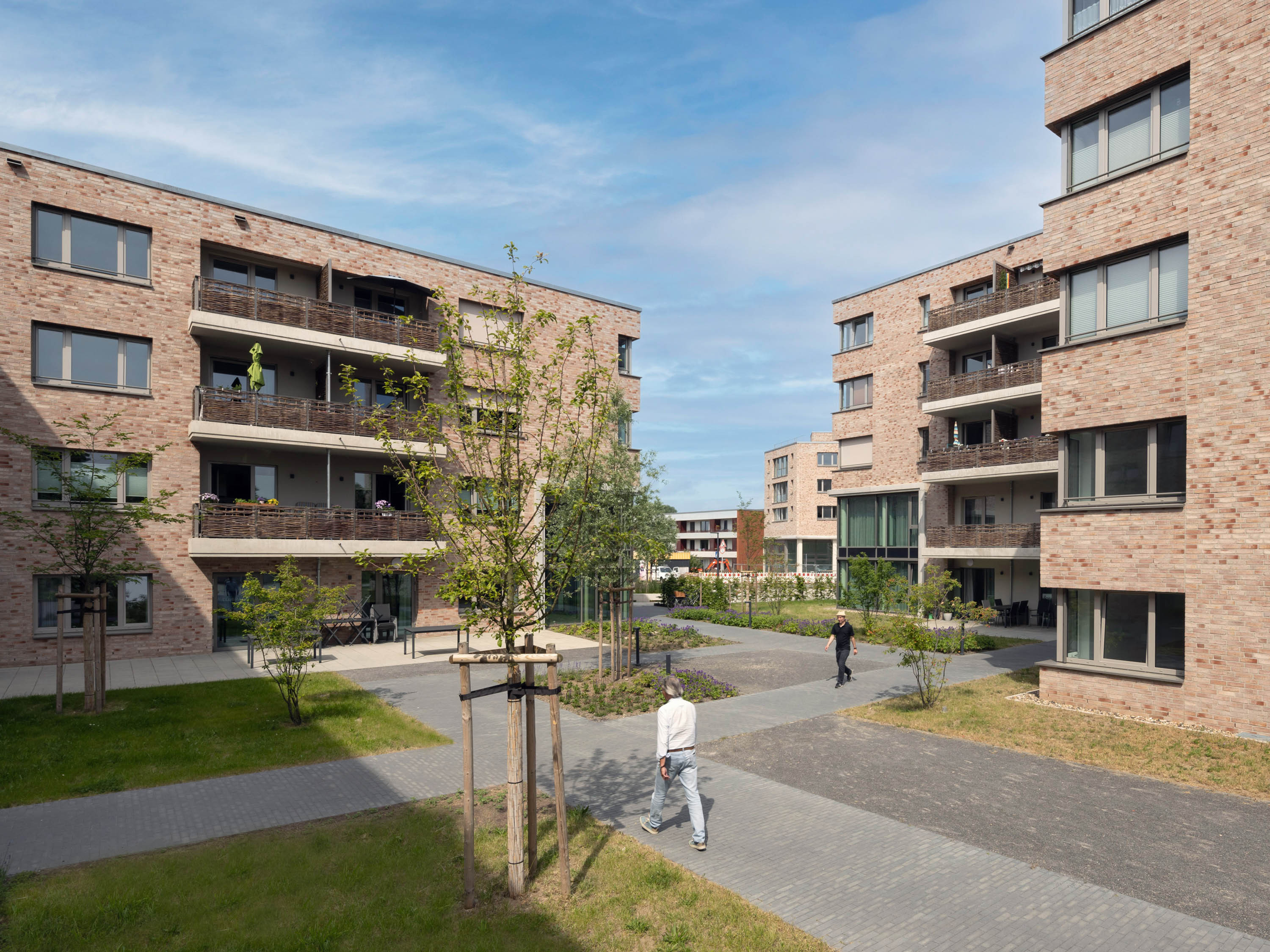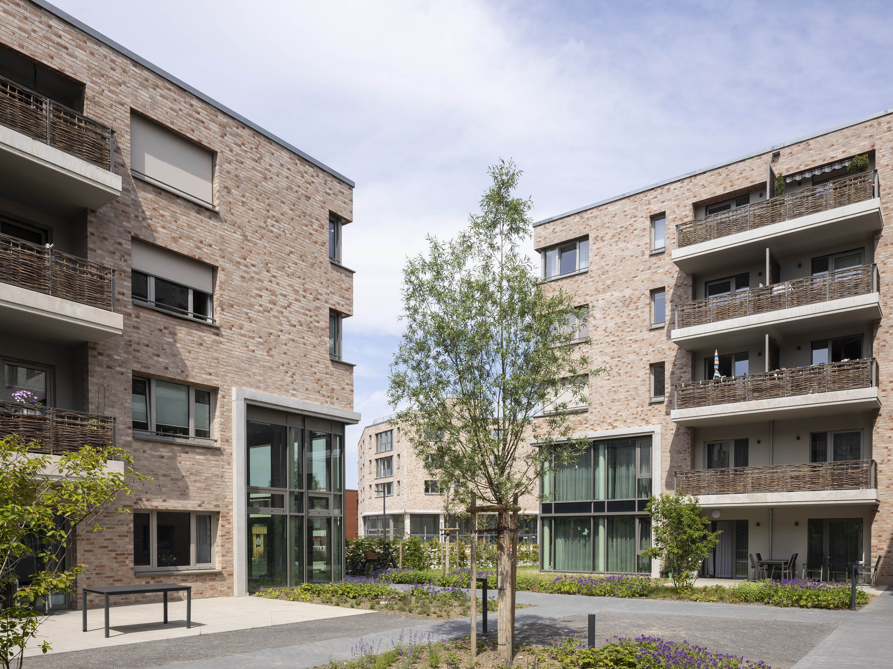Das Ensemble besteht aus drei vier- bis fünfgeschossigen Volumen und einem Solitär und zeichnet sich durch eine stimmige, klare Geometrie und einheitlichen Oberflächenmaterialien aus. Die Lochfassaden sind mit Klinkermauerwerk in warmen Farben verkleidet. Inklusion standen bei Planung und Design im Vordergrund: Alle Gebäude haben ein multifunktionales Nutzungskonzept, alle Wohnungen sind barrierefrei.